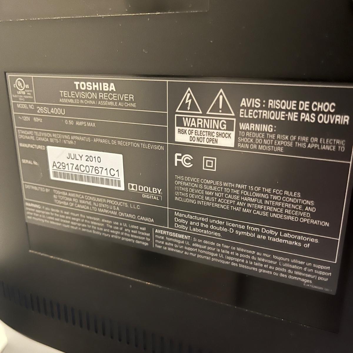 Lot includes a Toshiba 26” TV model # 26SL400U with remote. TV powered on when plugged in. Lot includes stand. TV will need to be removed from wall mount by winning bidder.