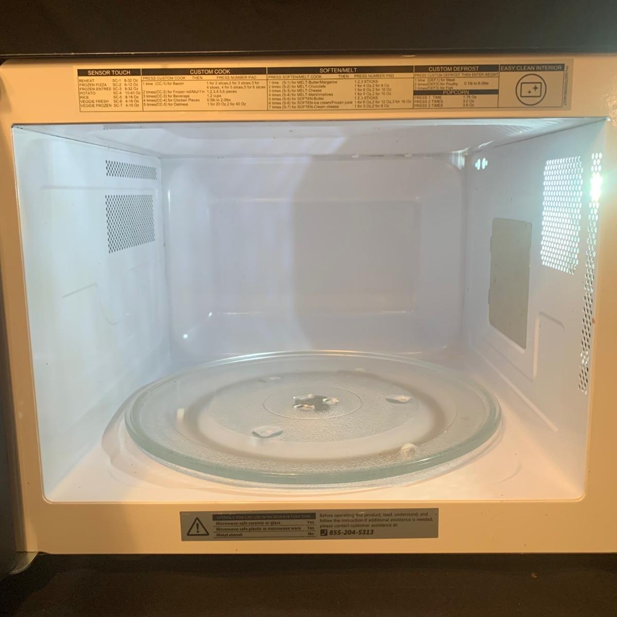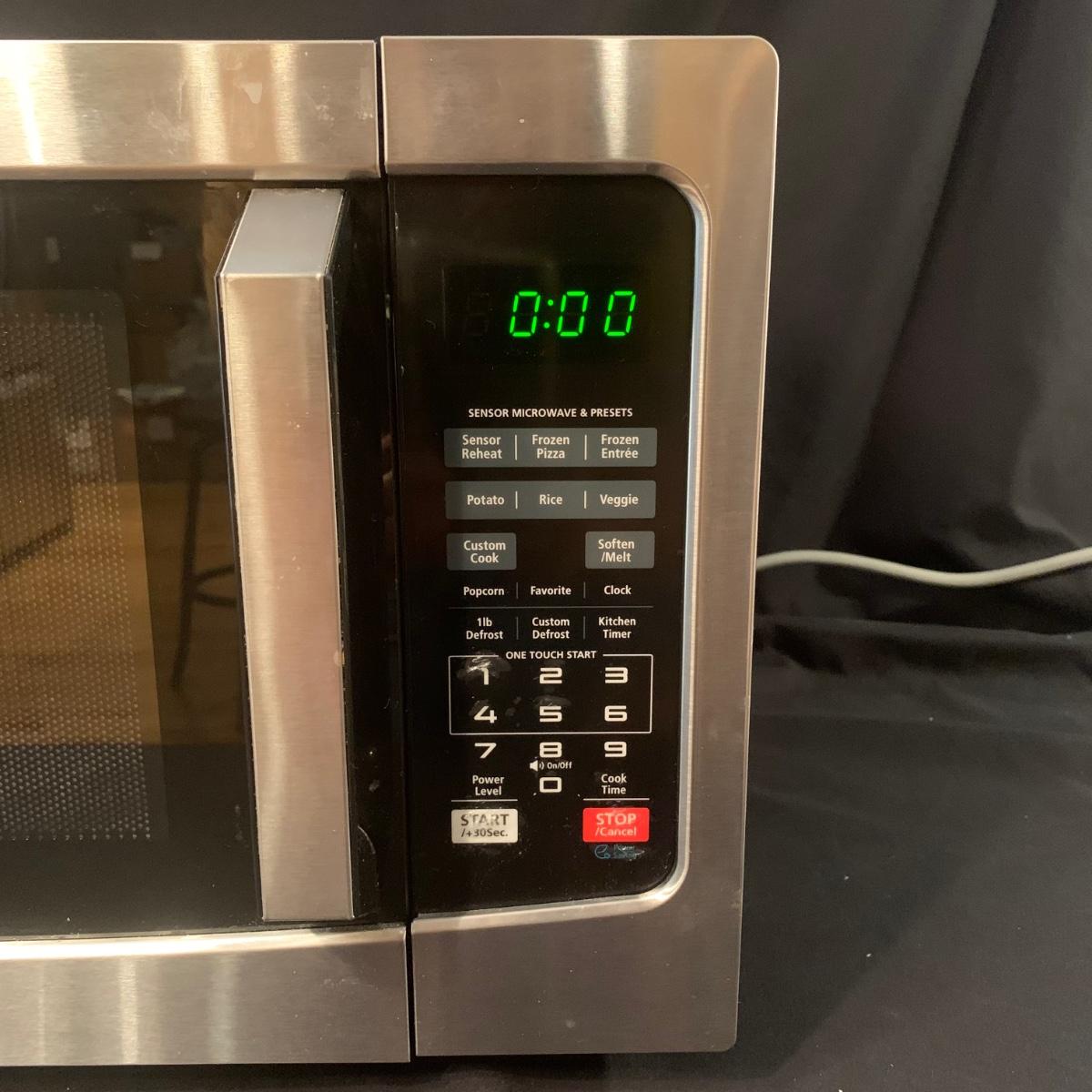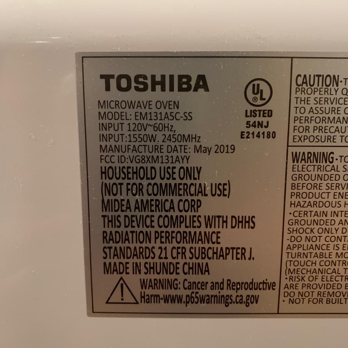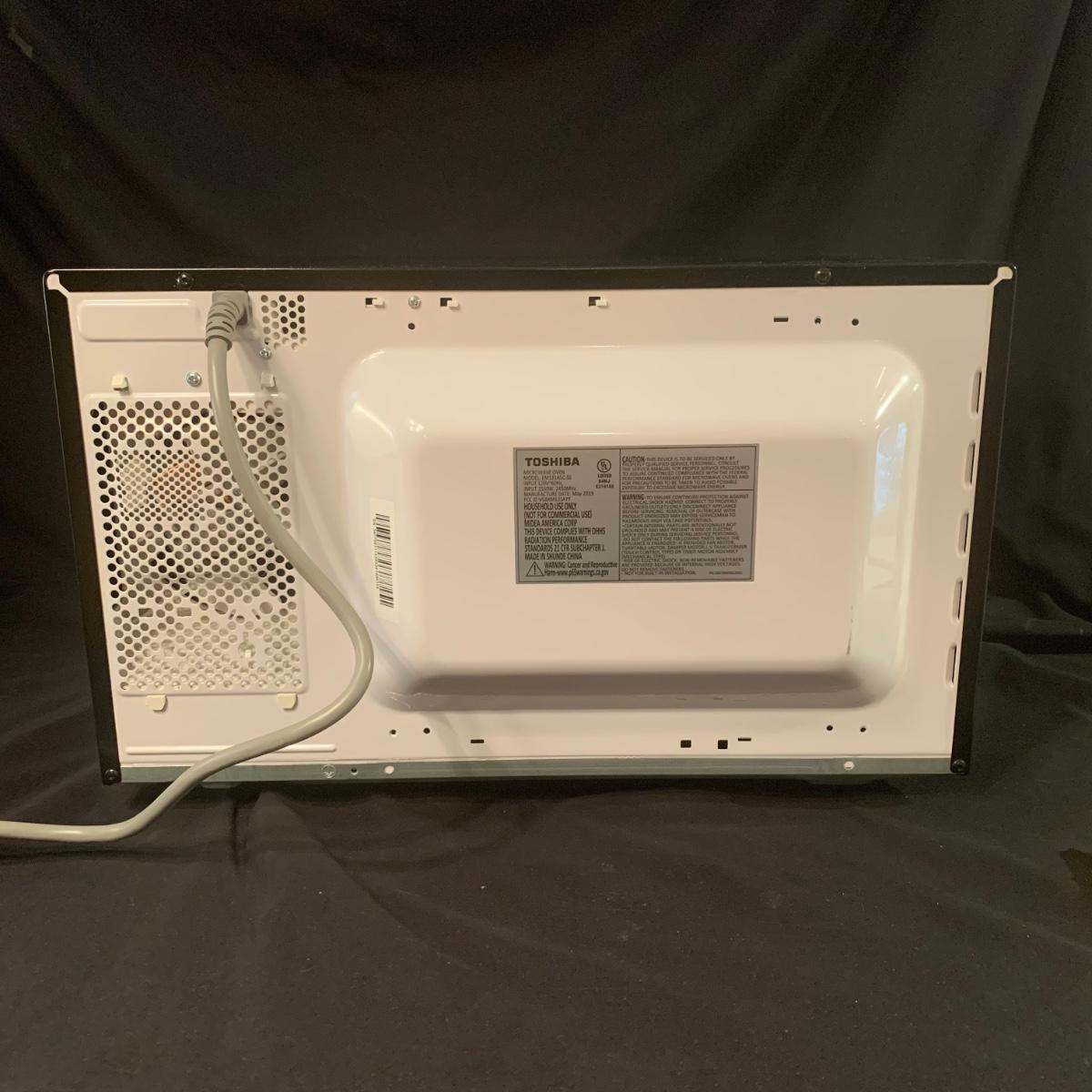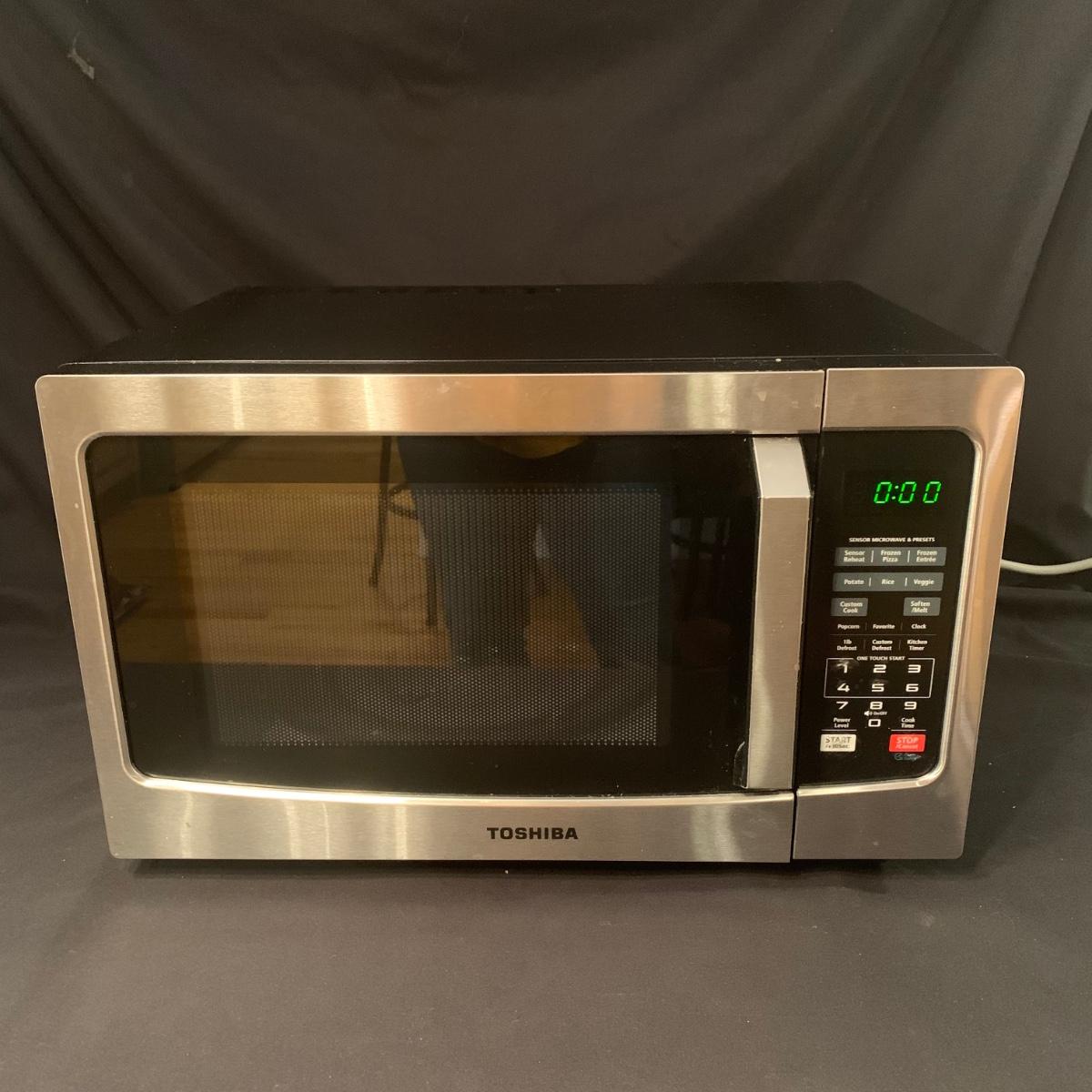 Lot includes Toshiba countertop microwave oven. Microwave powers on and aside from a few scratches, it appears to be in good condition. It measures 20.5”L x 16”W x 13”H. Please see photos for more details. Model number: EM131A5C-SS.