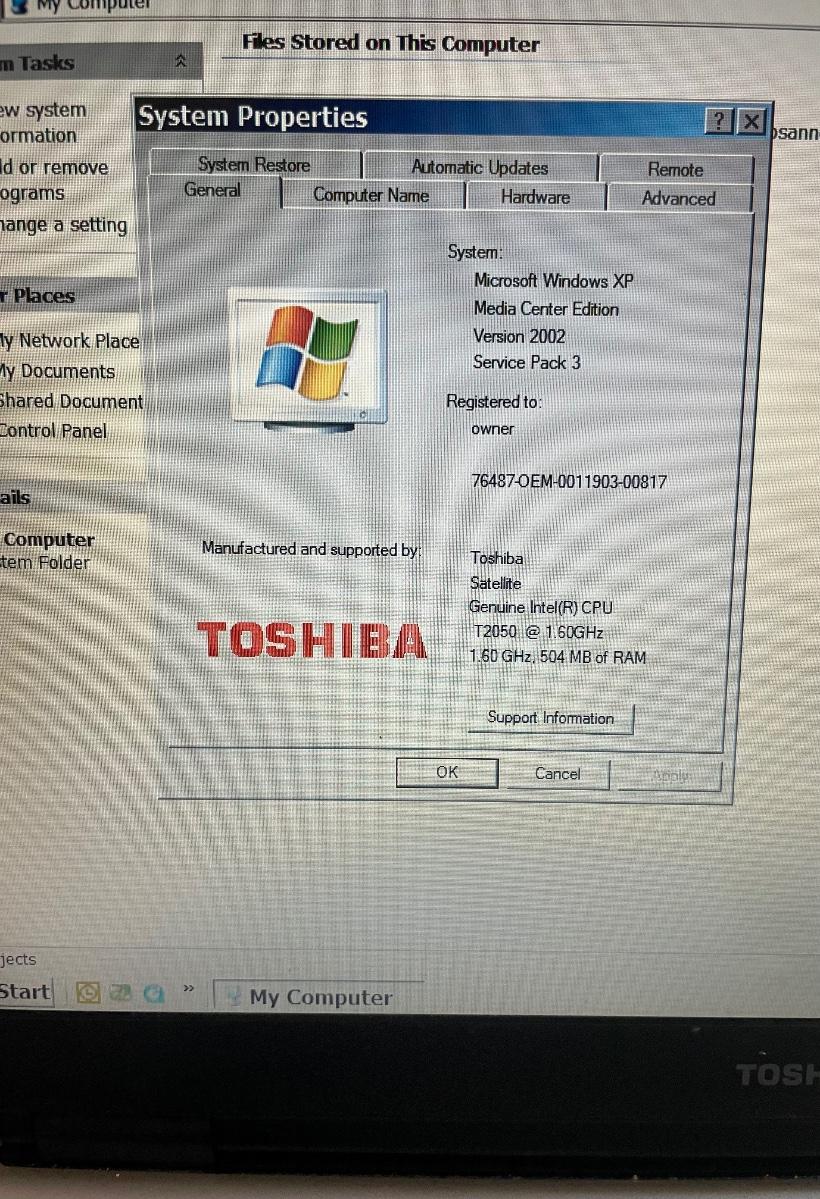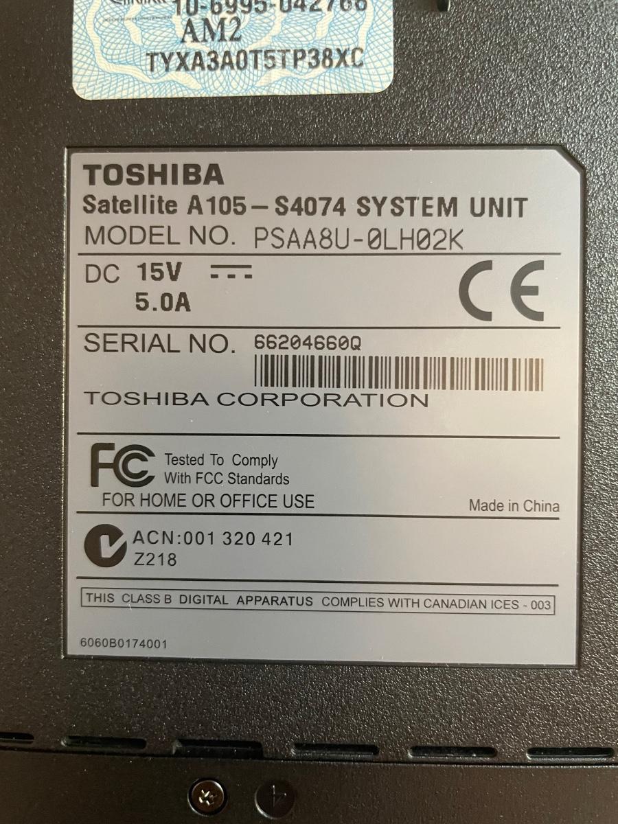 Toshiba Laptop Computer, Satellite A105,-S4074. Tested, powers up and trackpad works. See photos for System information.