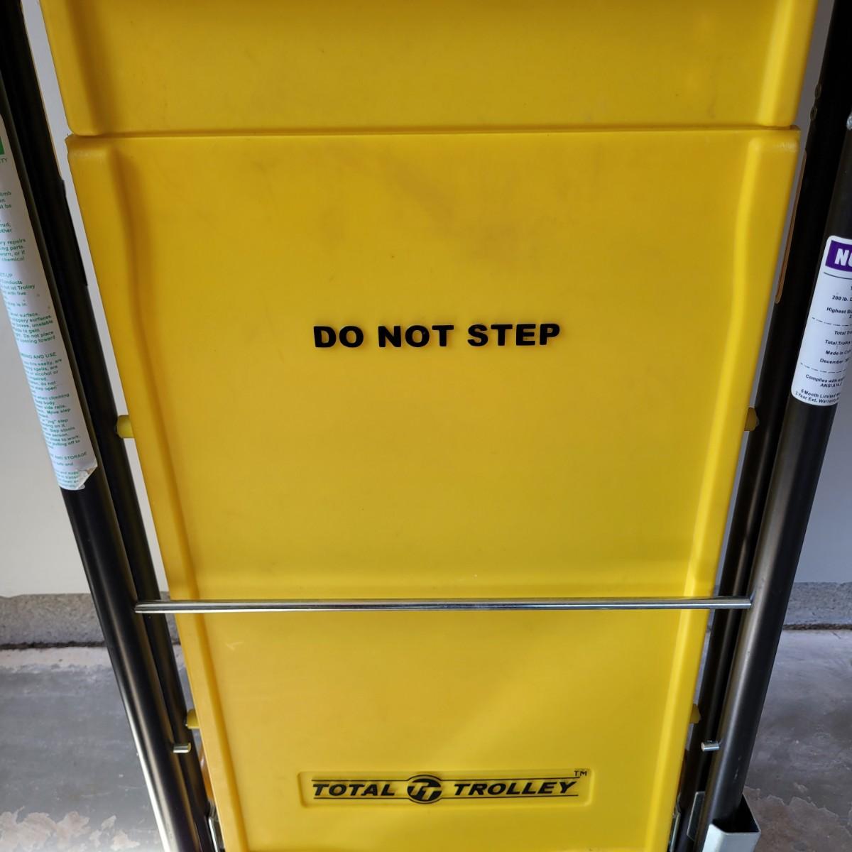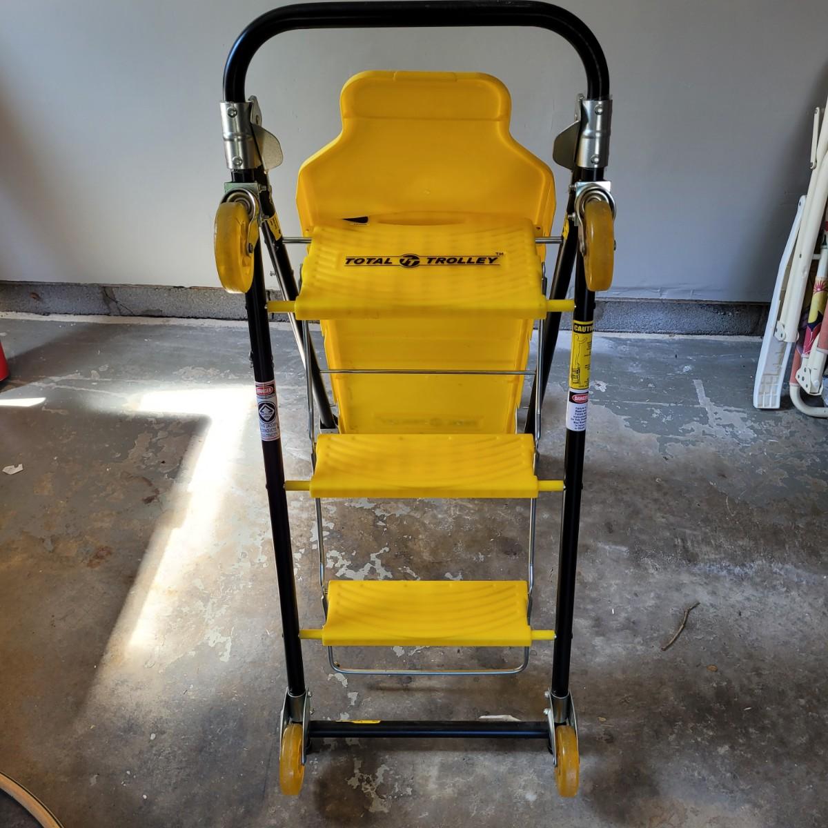 This lot includes one Total Trolley brand hand truck. The hand truck is made from metal and plastic. The trolley can be used as a hand truck, rolling cart, or step ladder. The multifunctional cart has large flat-free wheels for smooth transportation. The cart measures 17.5" x 15" x 42"H when folded into a hand truck.