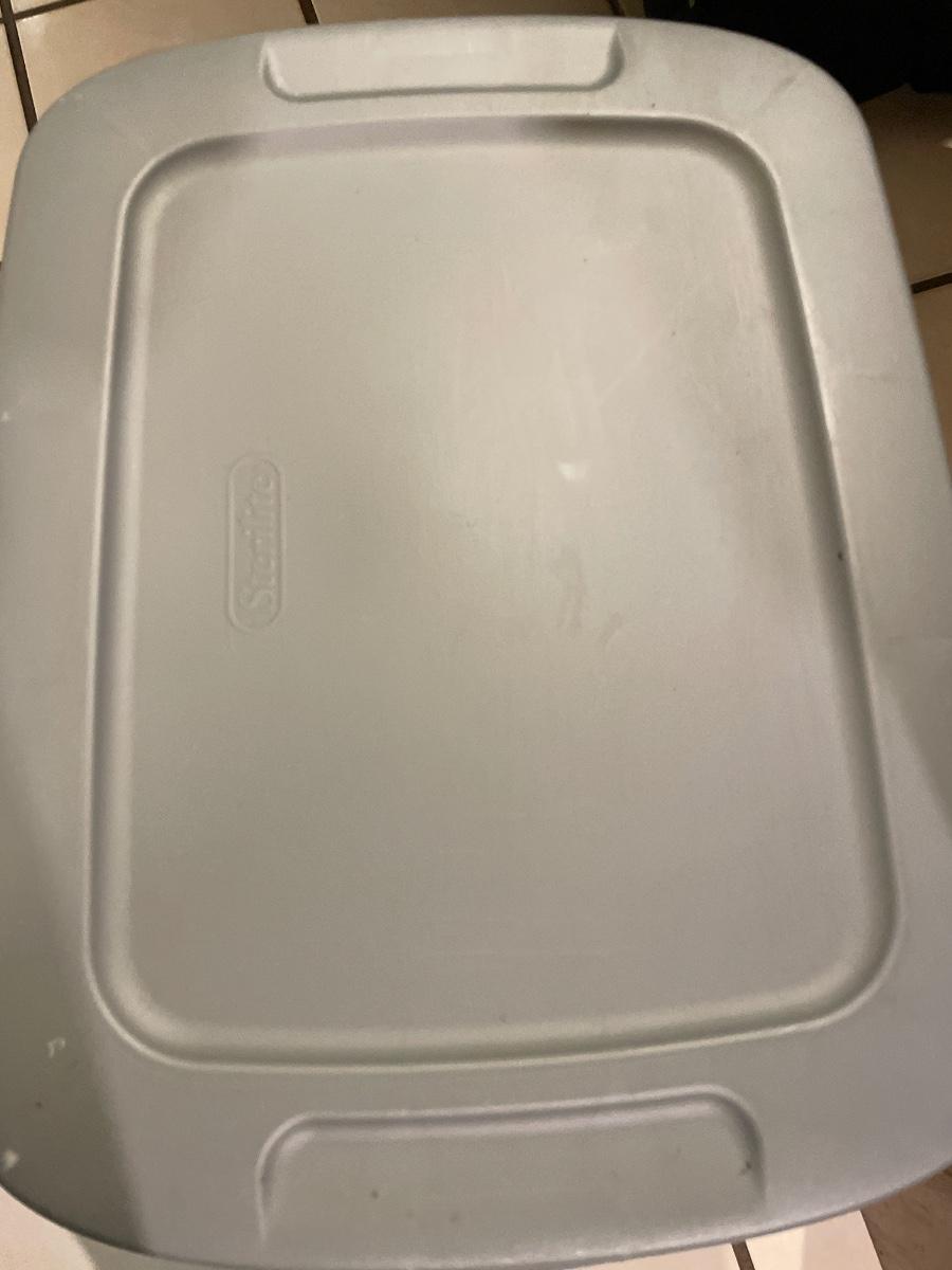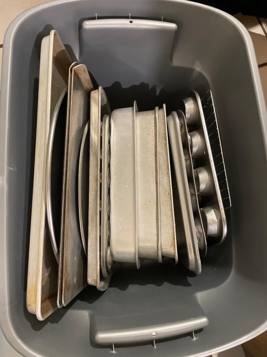 Tote full of pans and cookie sheets