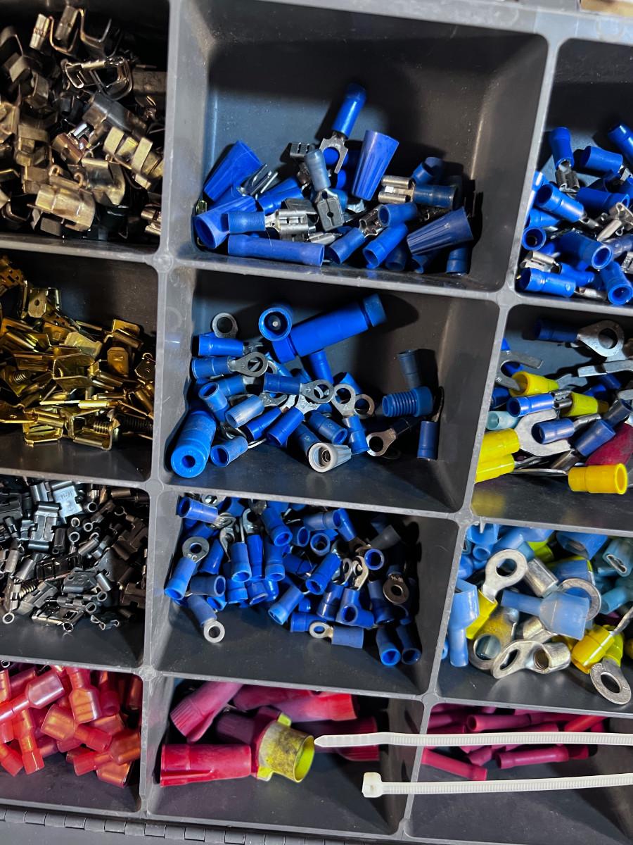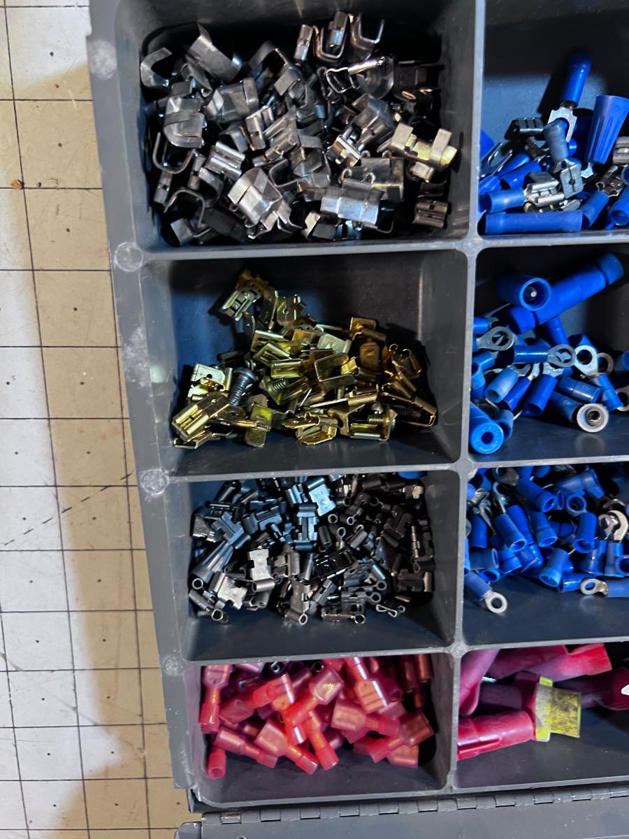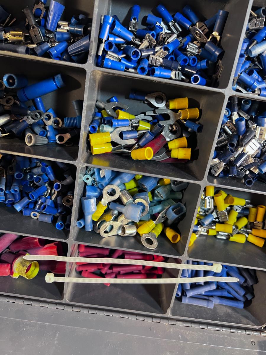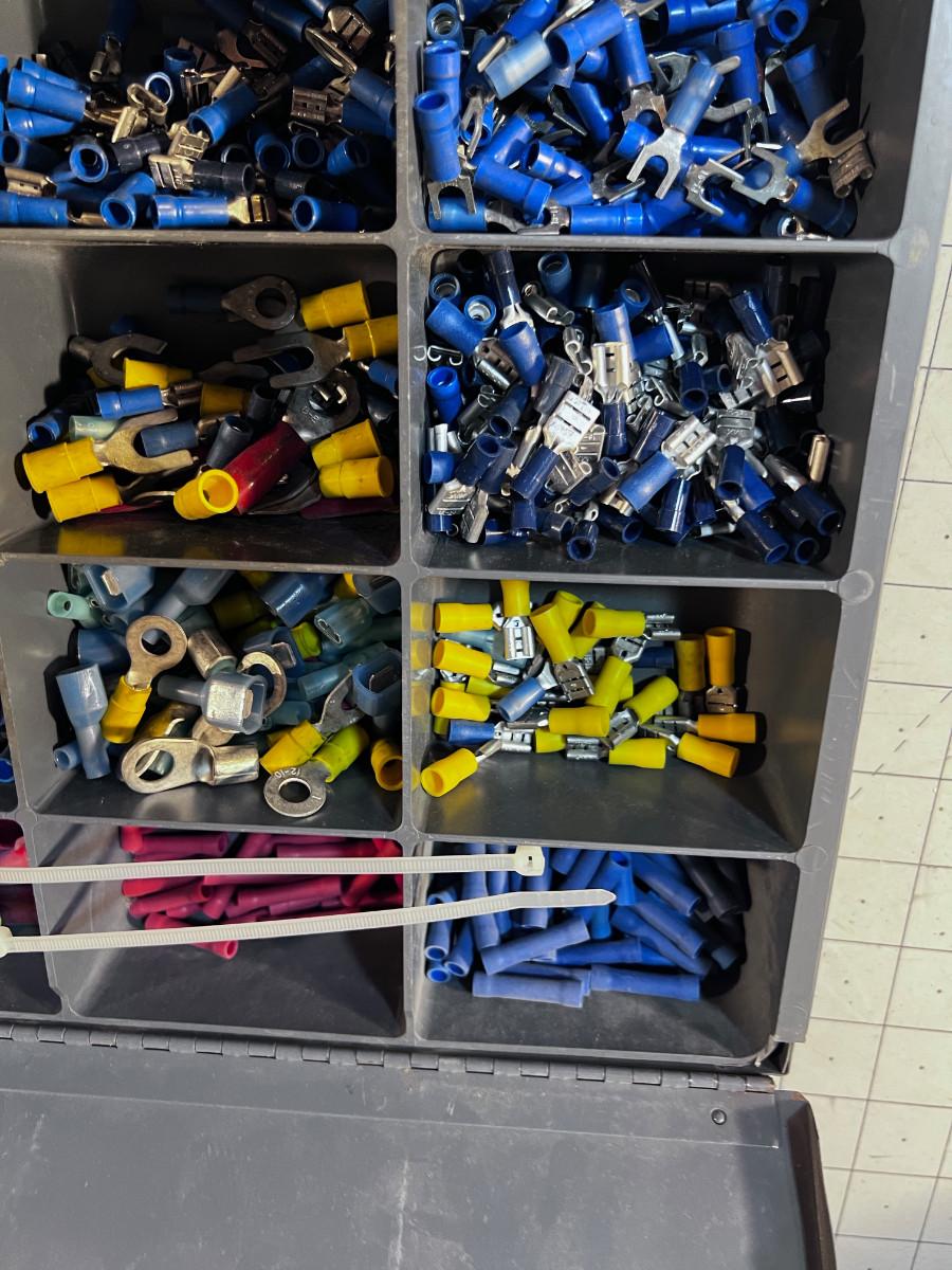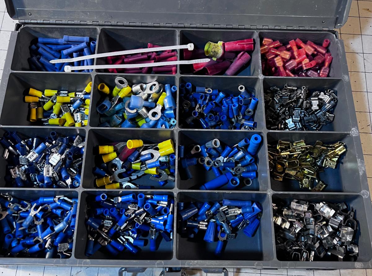 Tote full of Various Electrical Low Voltage Crimp on Connectors