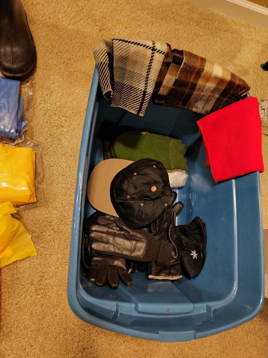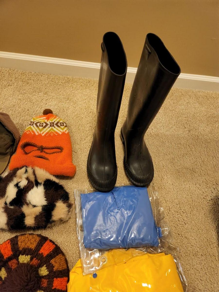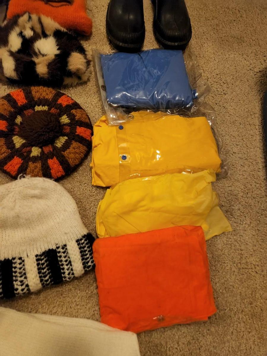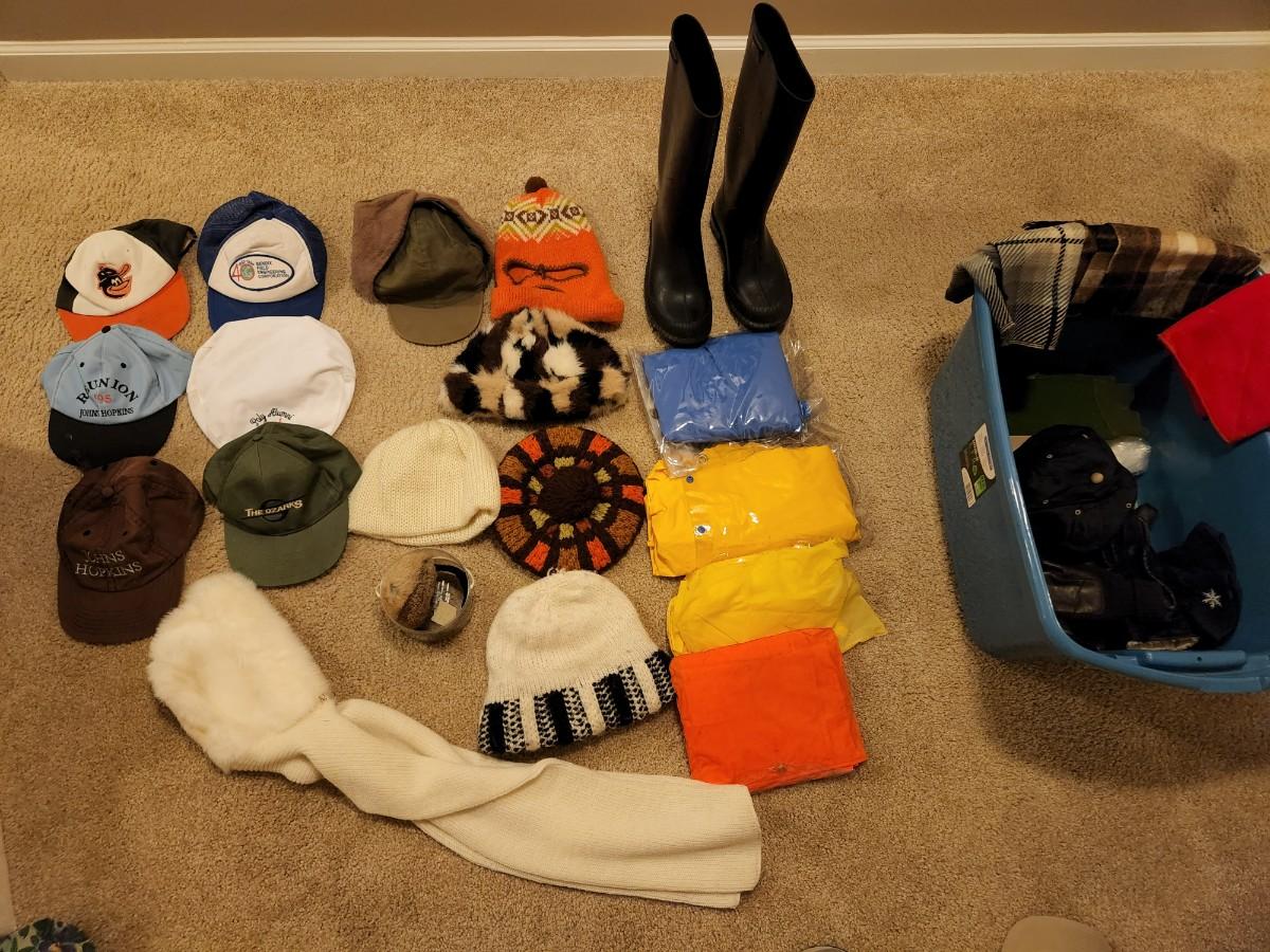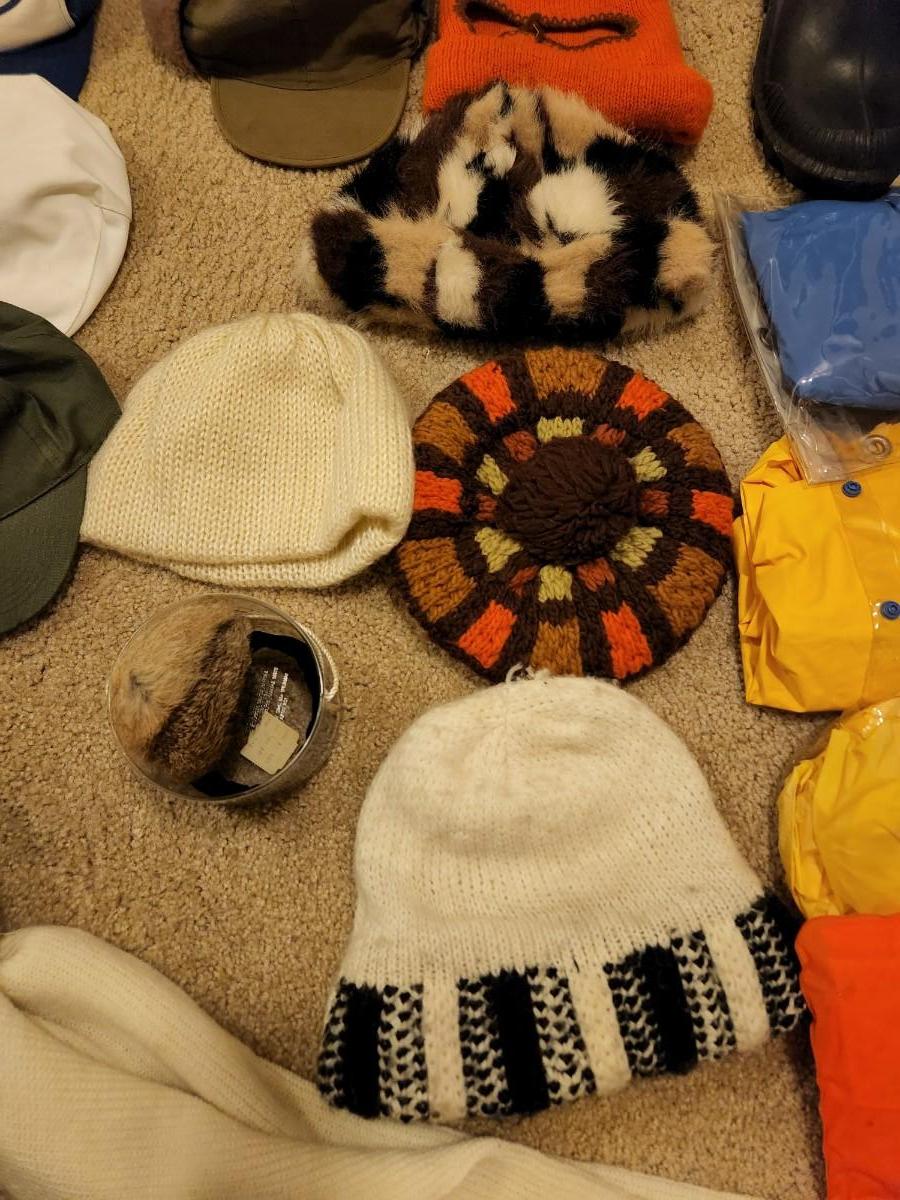 Tote Full of Vintage Hats ,Trucker Cap, Vernon Boots, Ponchos,