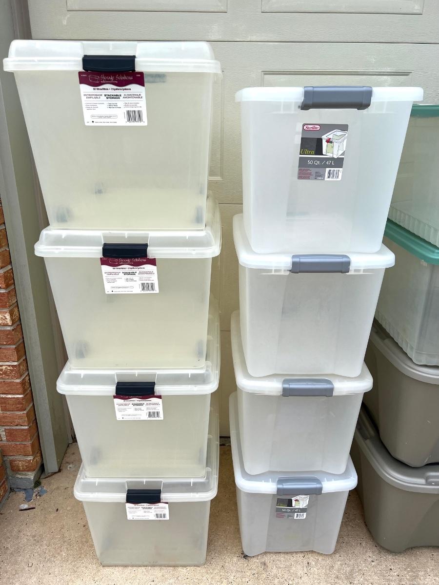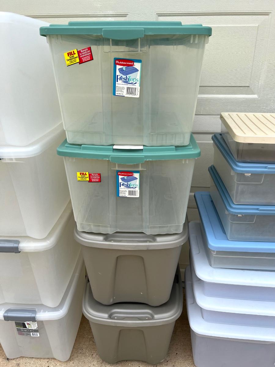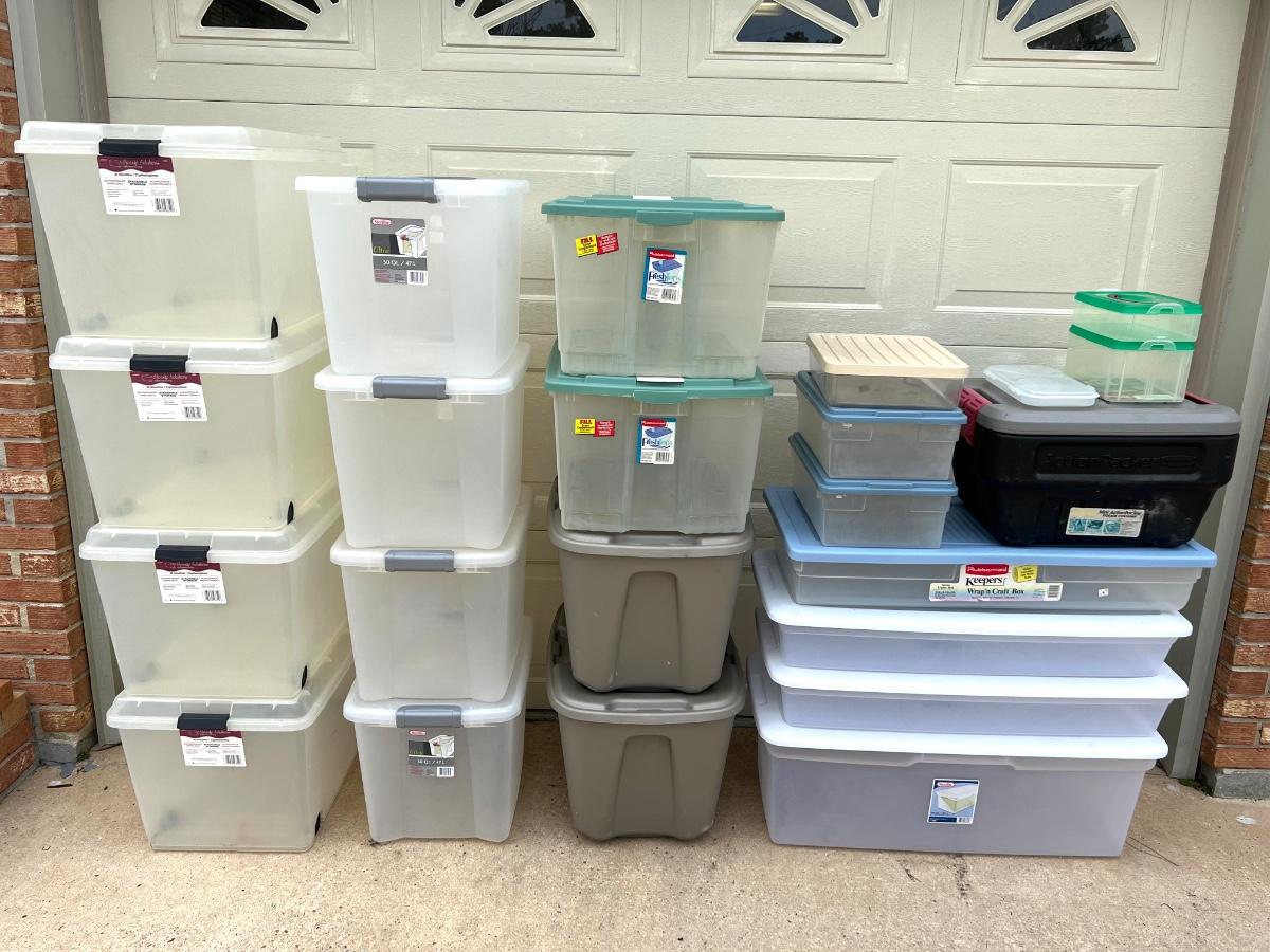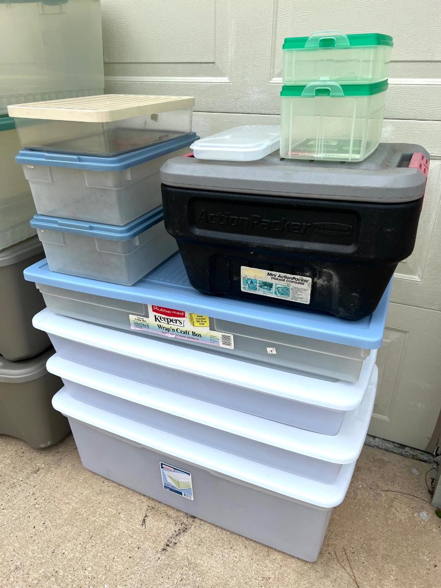 Lot of 16+ plastic totes. No cracks in the totes or tops. Some may have writing on them.