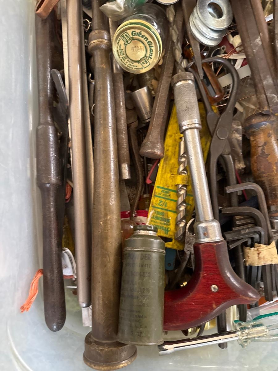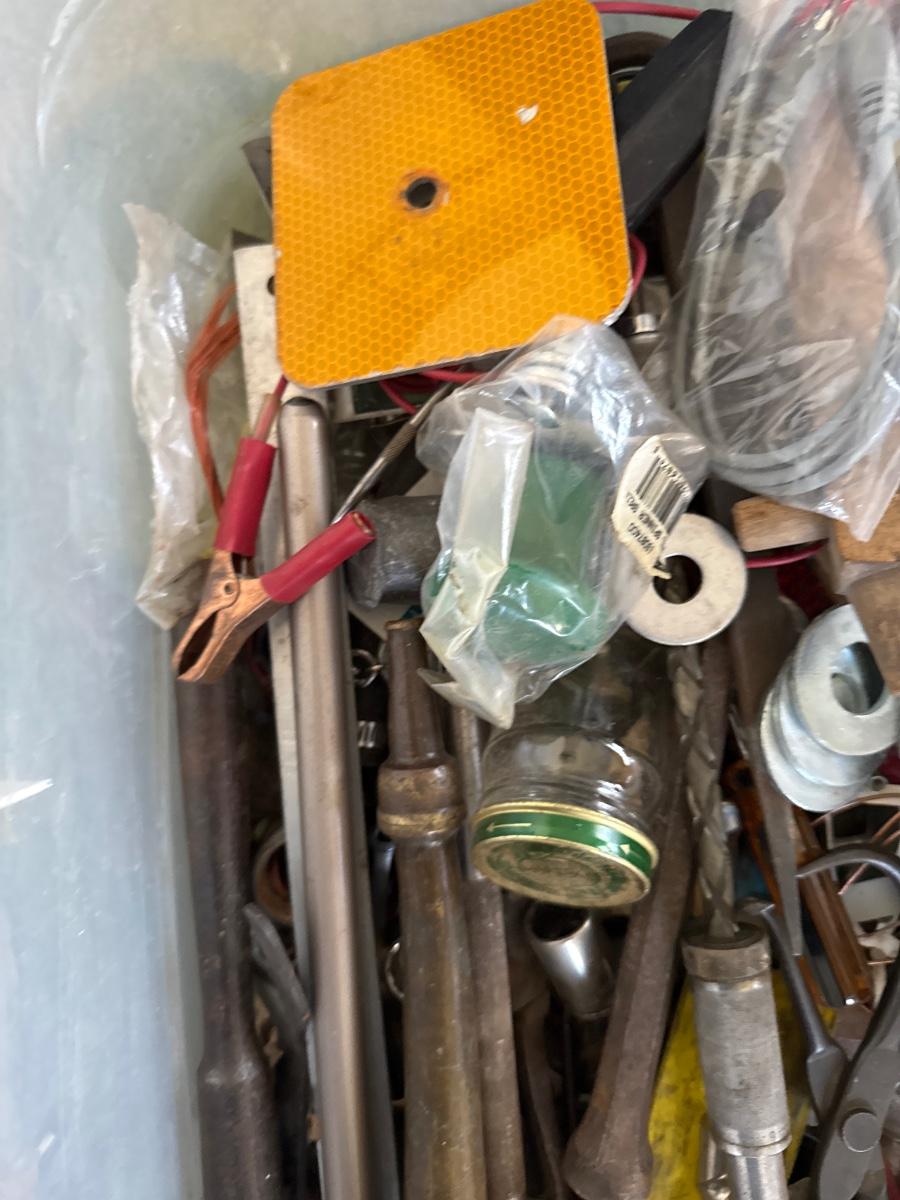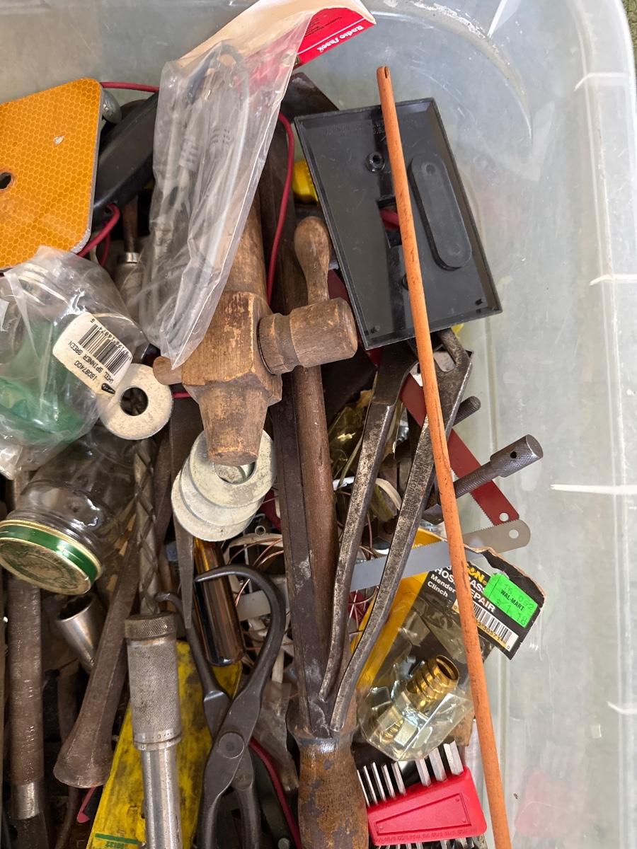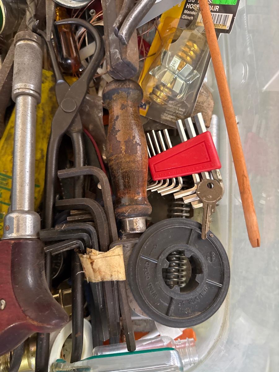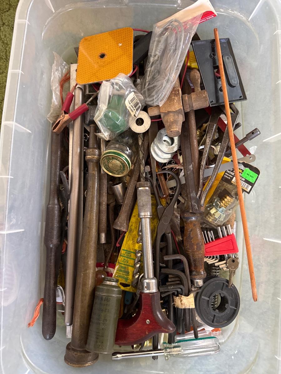 Tote of assorted tools and hardware