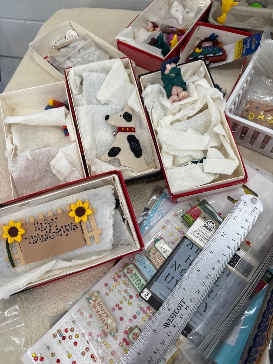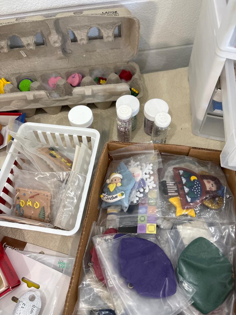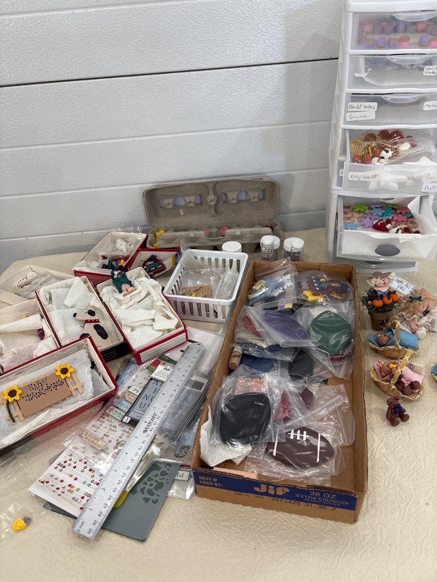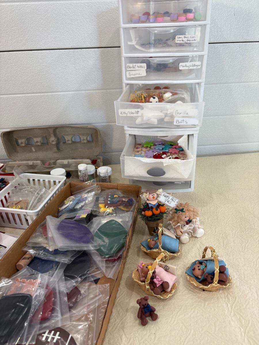 Miscellaneous polymer, clay, handmade figurines, in addition to some crafting supplies and tote.