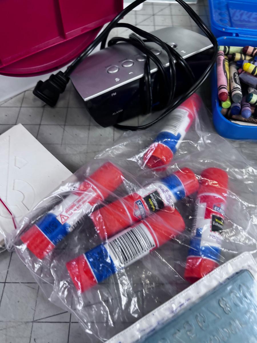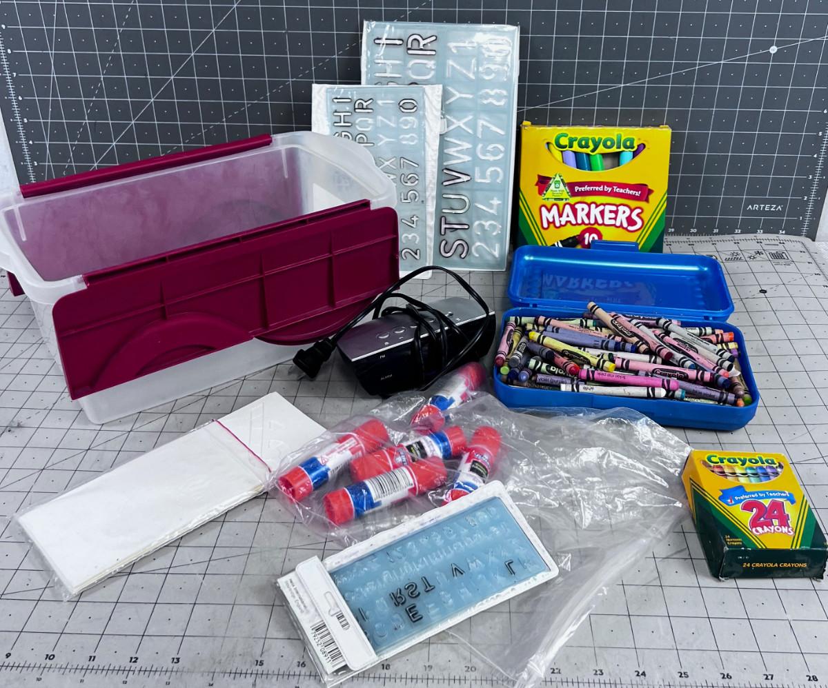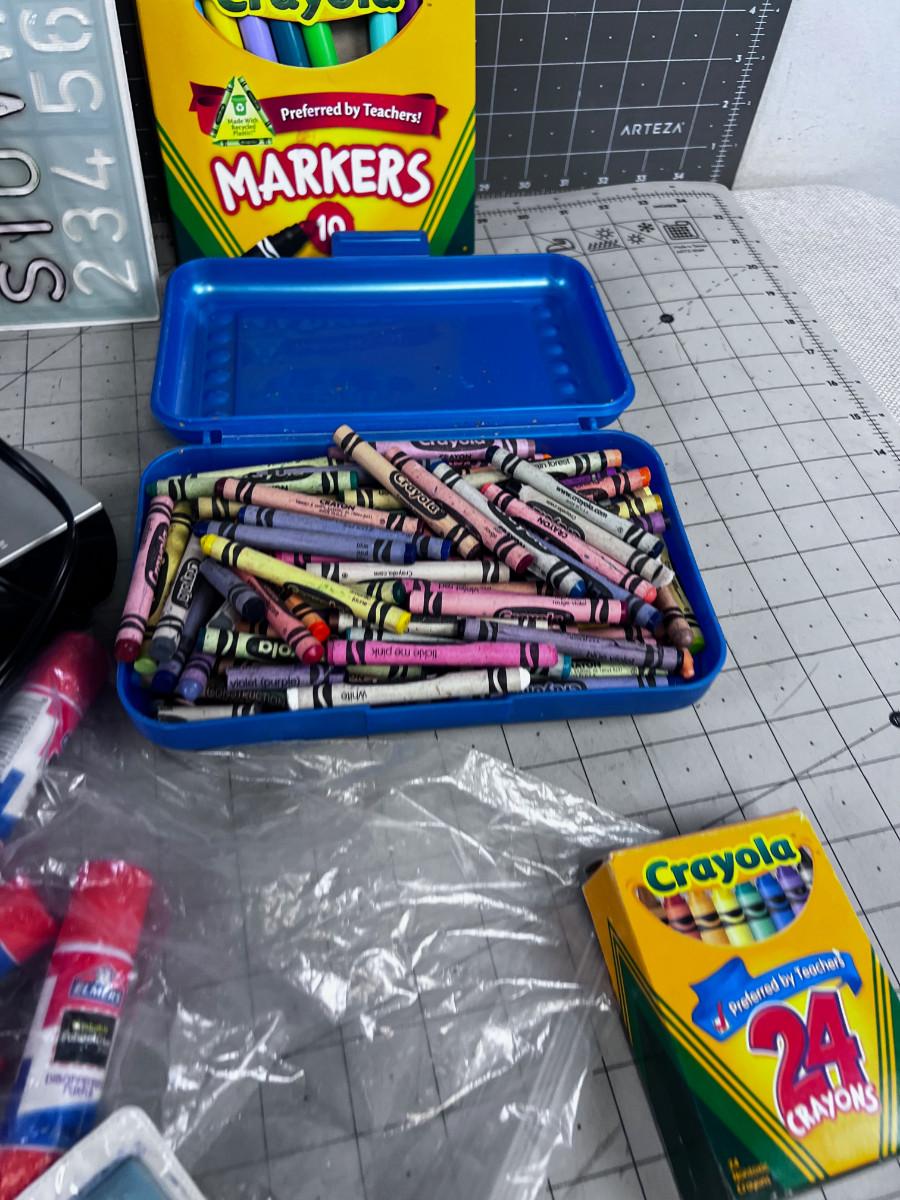 Tote of Crayons and more Crayons Plus Art & Crafting.