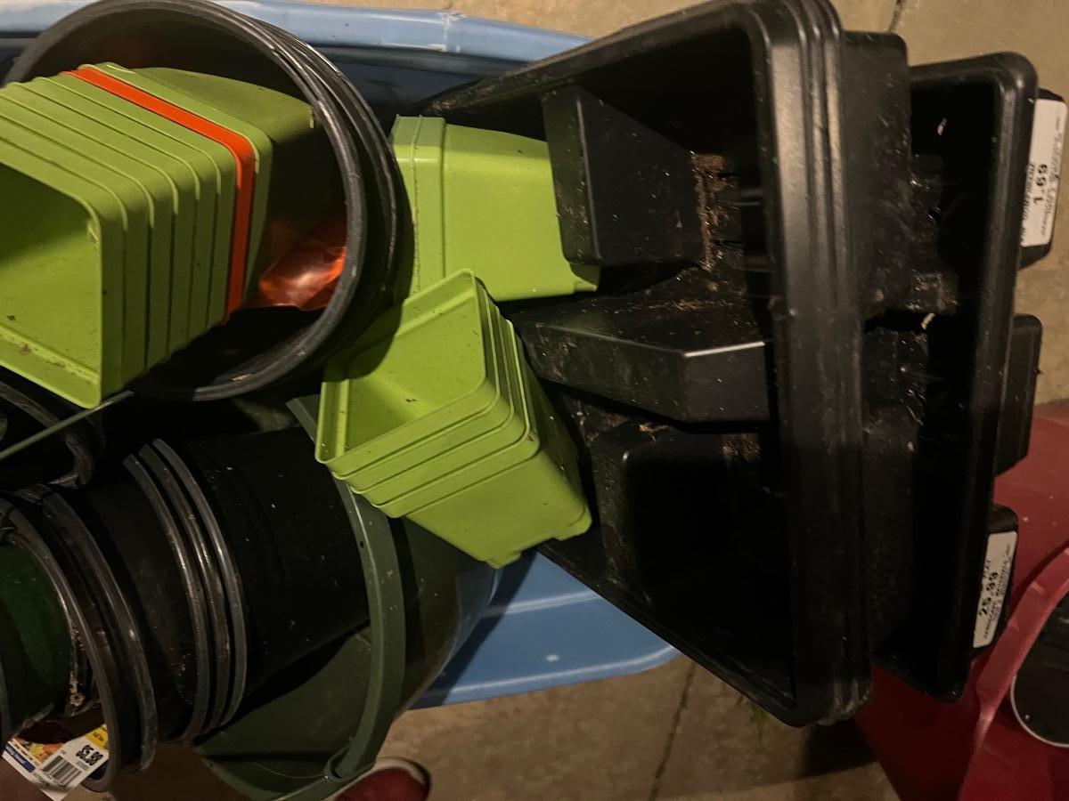 Tote of Plastic Planting Pots