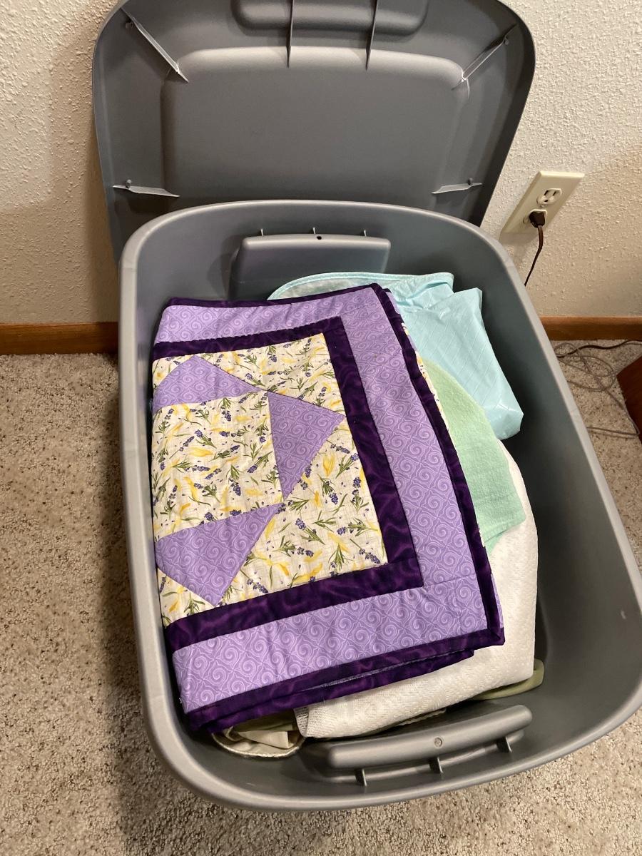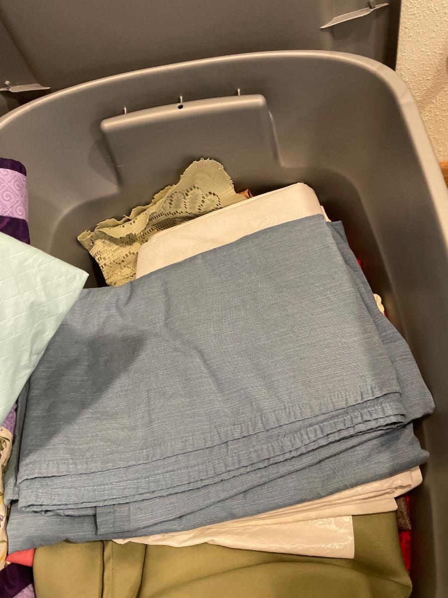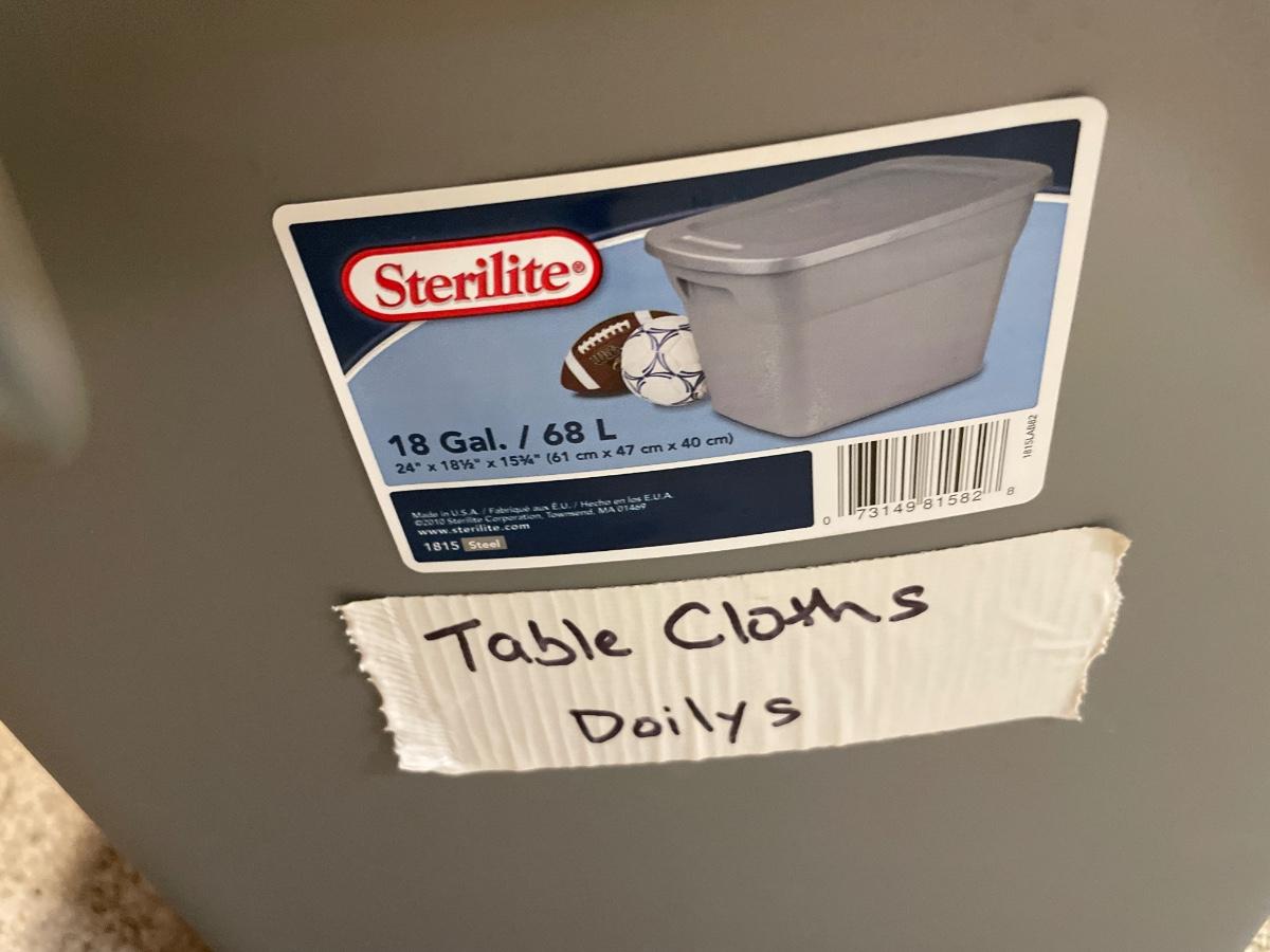 Tote of table cloths and doilies