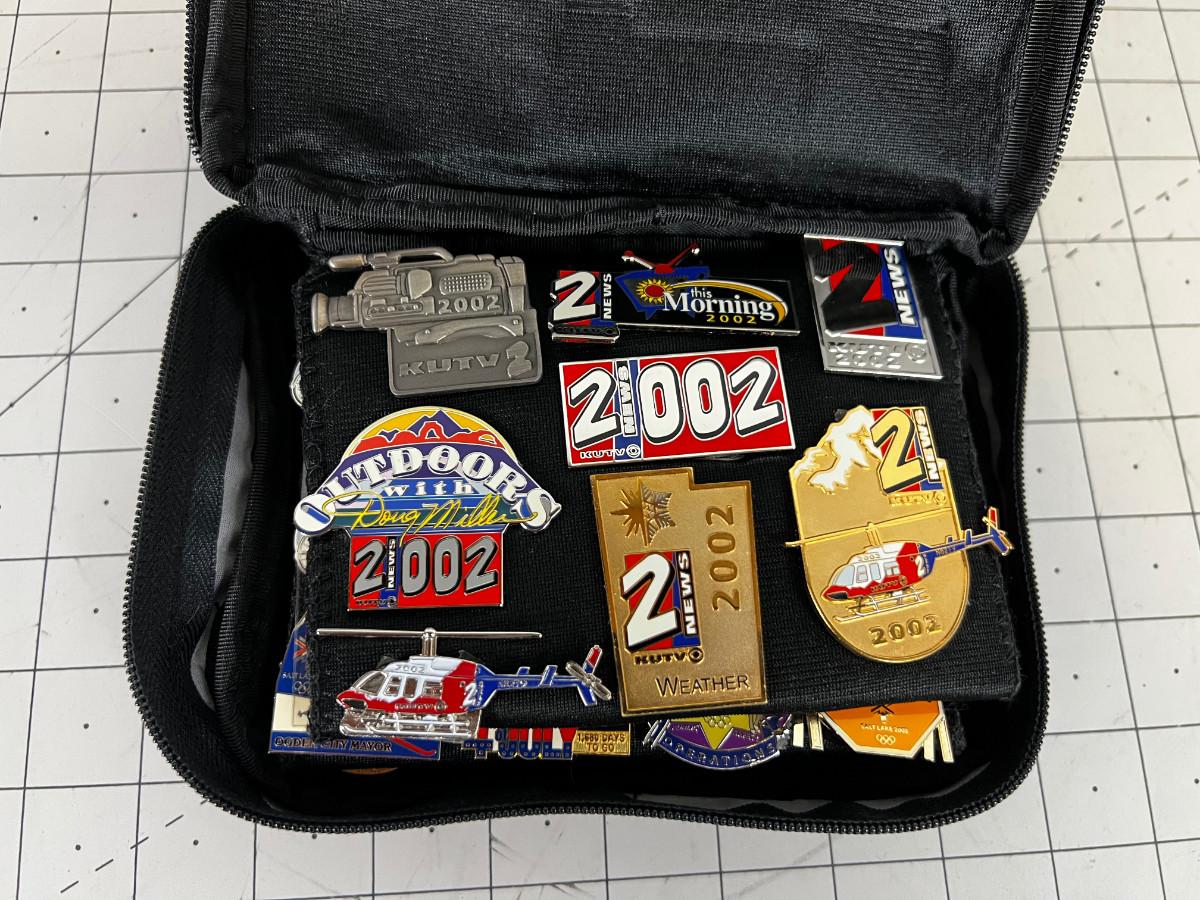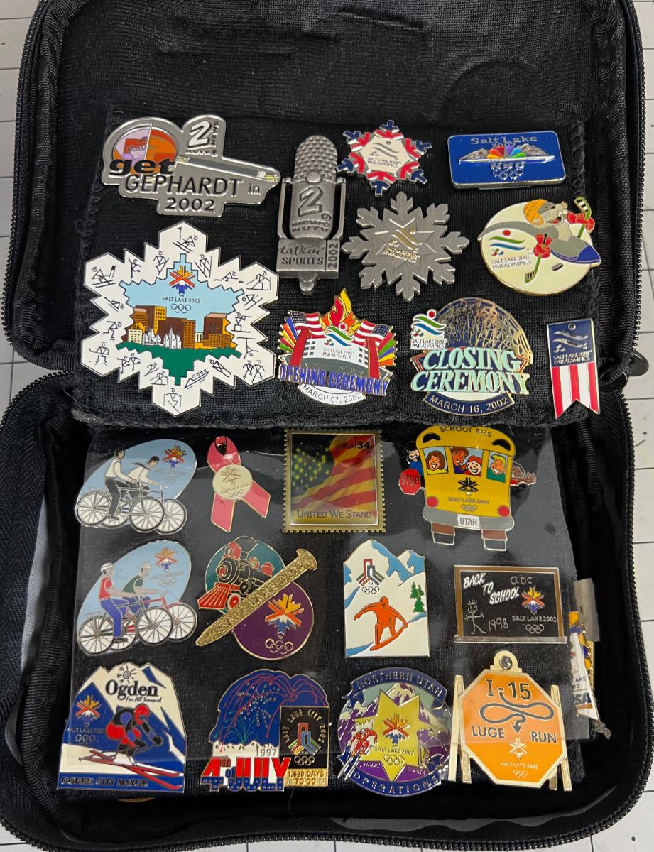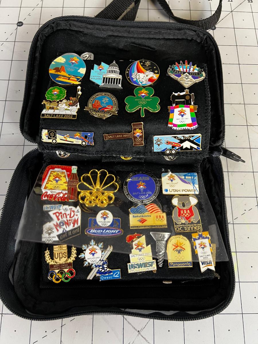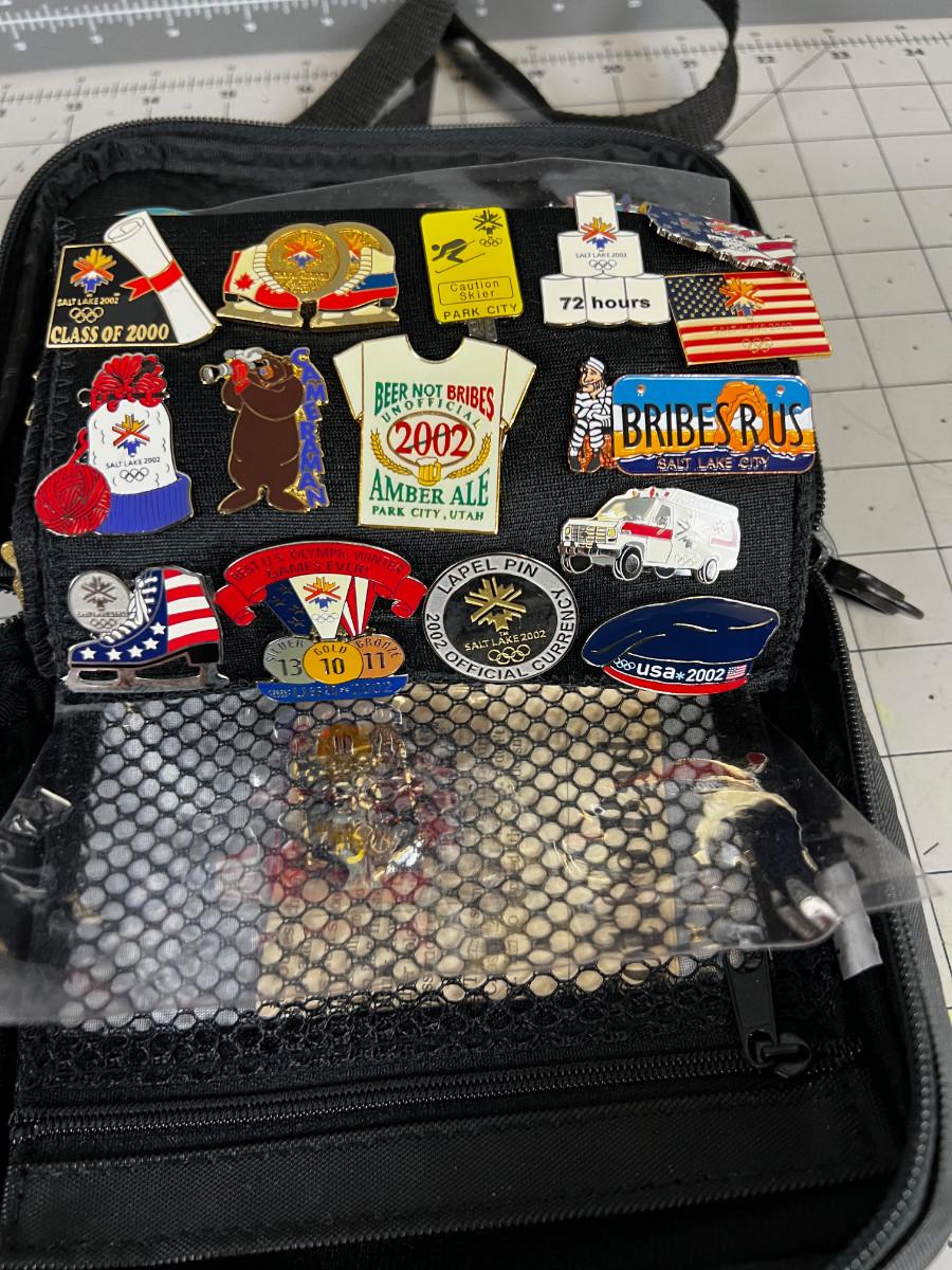 Tote with a Collection of 2002 SLC Olympic Pins in a Collector Tote Bag with Strap.