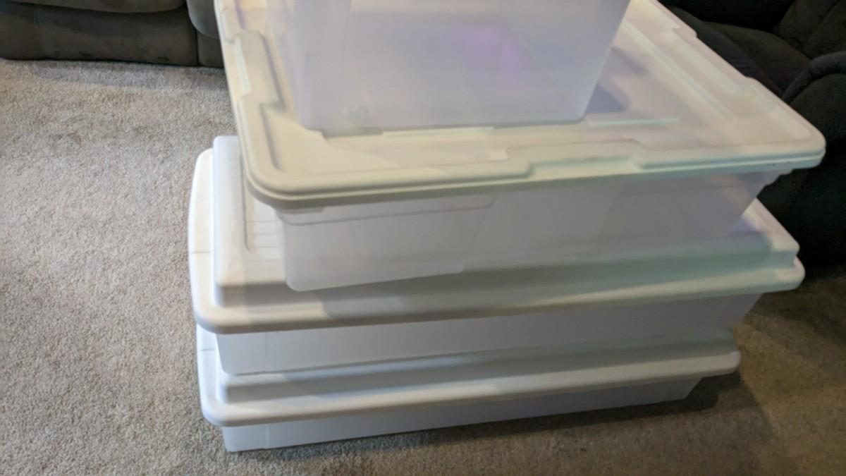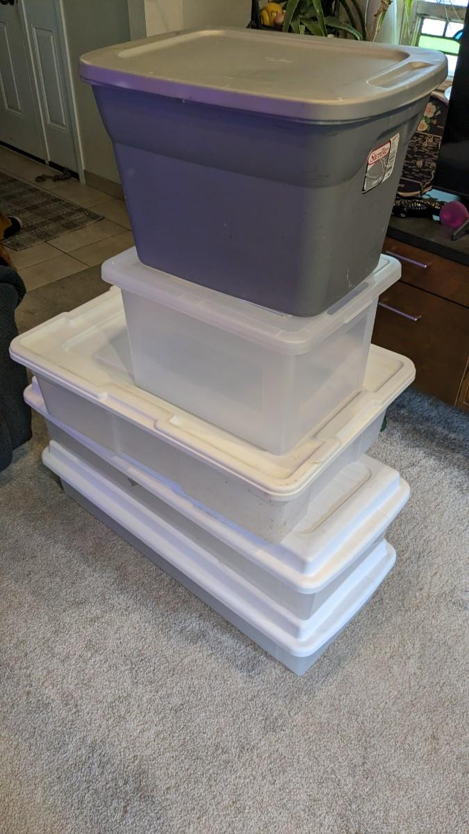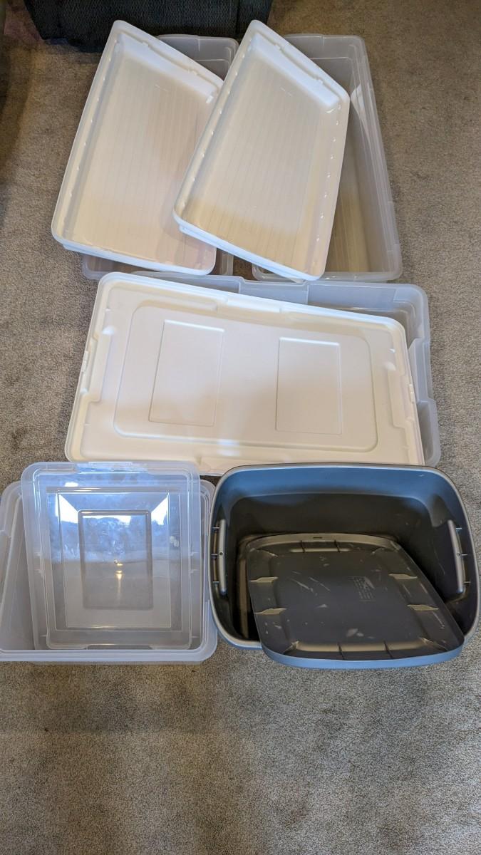 (5) varied size totes with lids that are in great condition. These would make some perfect under the bed storage. No shipping.