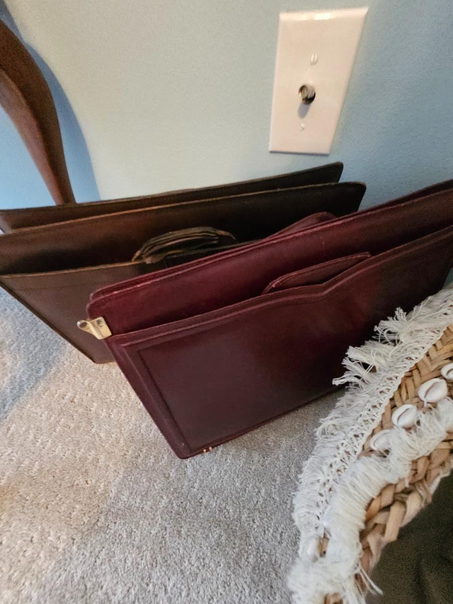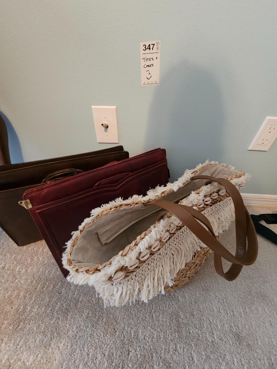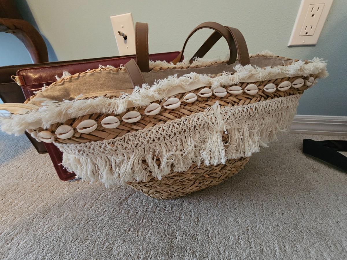 Lovely woven basket with handles and sea shells and 2 used office attaché cases