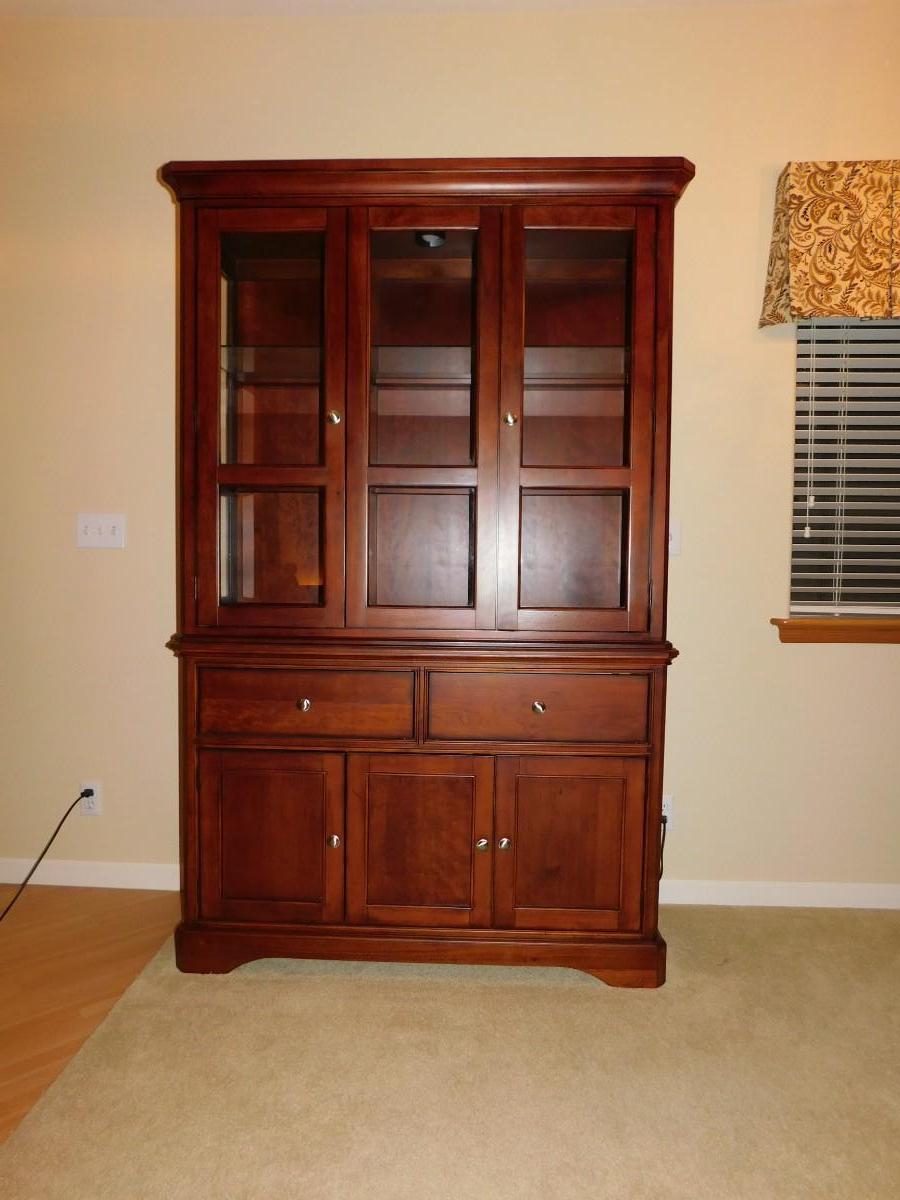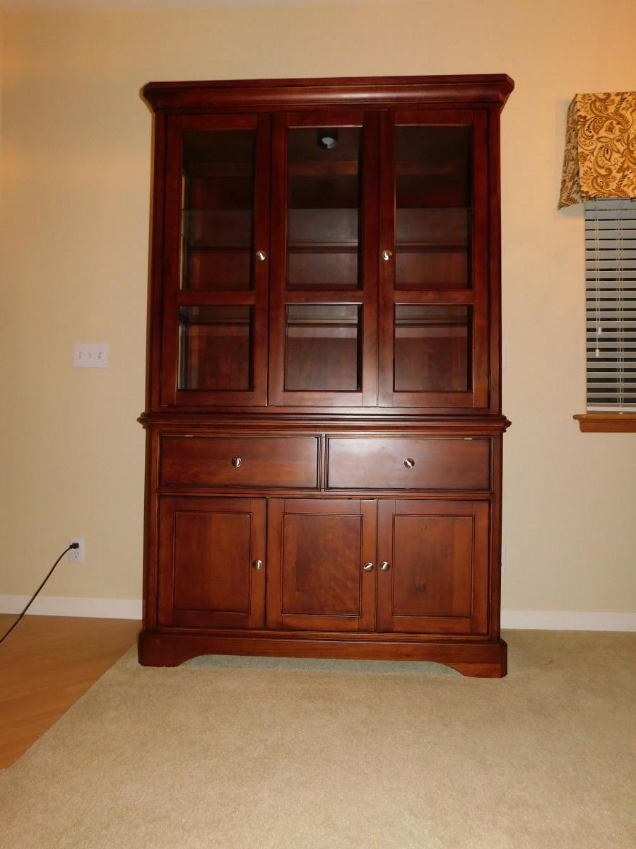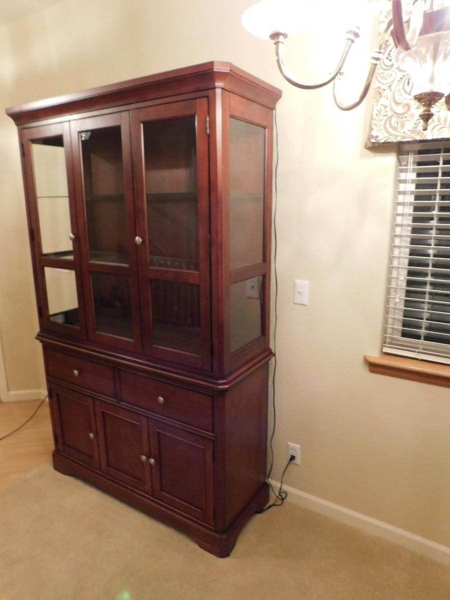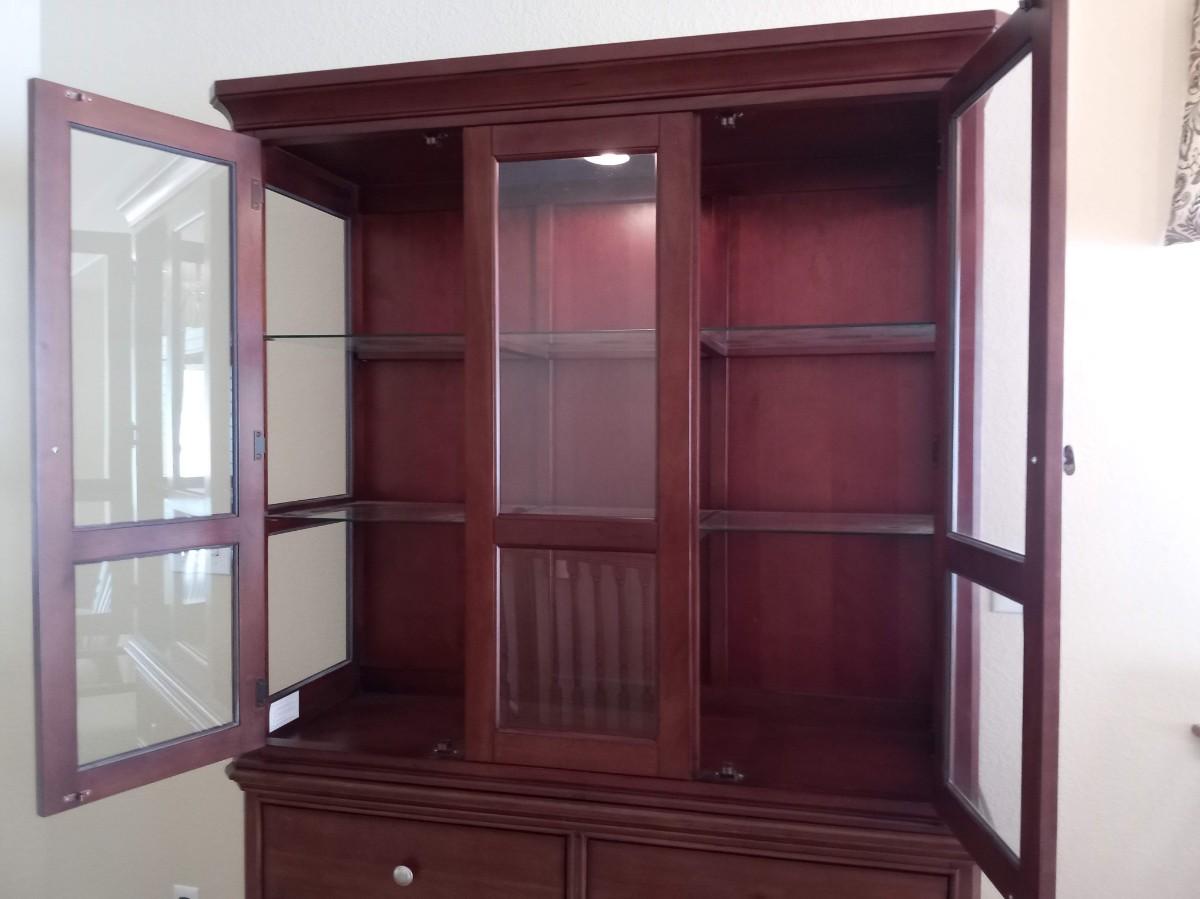 THE HUTCH HAS 3 WAY LIGHT ACTIVATED WITH A TOUCH OF YOUR FINGER ON THE UPPER DOOR HINGE