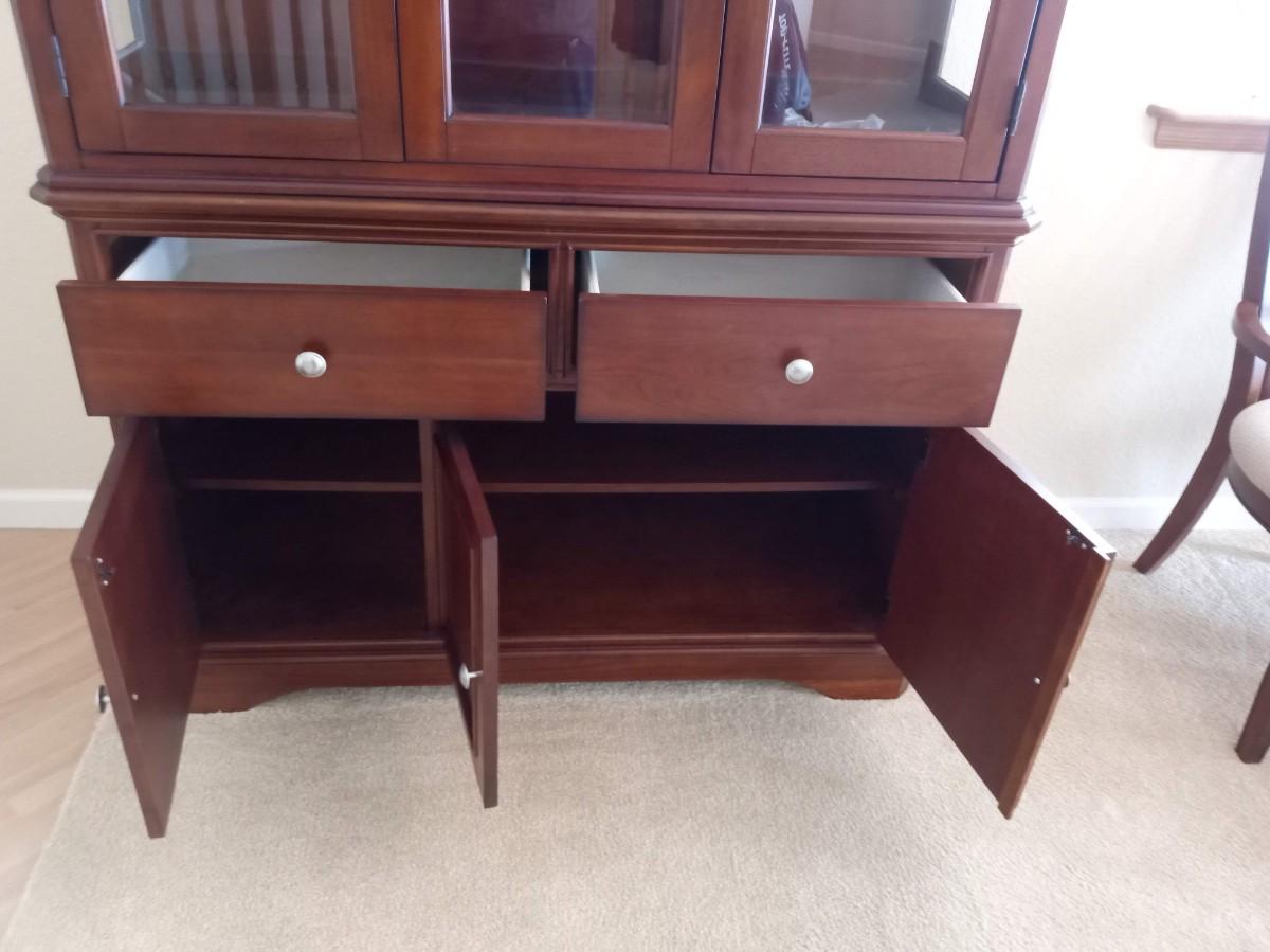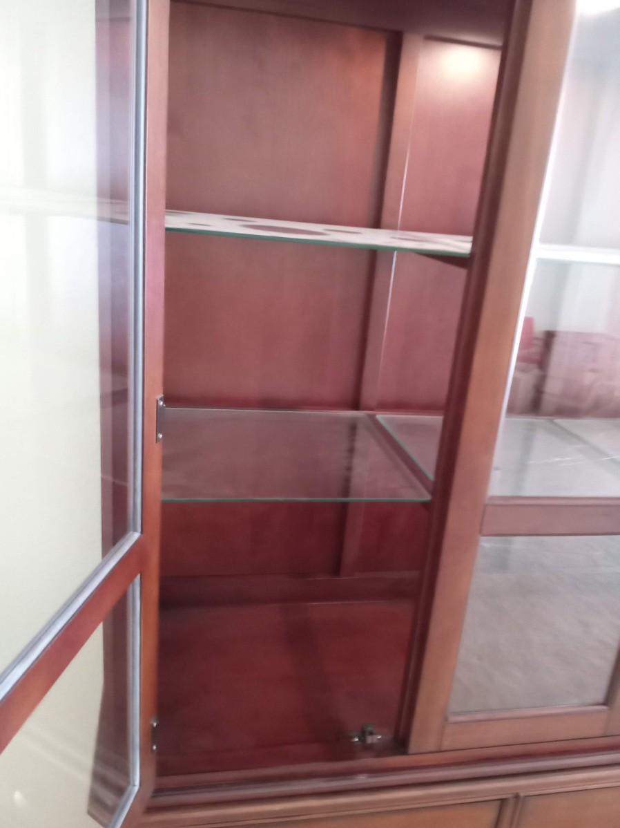 2 GLASS SHELVES ON TOP WITH GLASS ON 3 SIDES OF THE HUTCH.