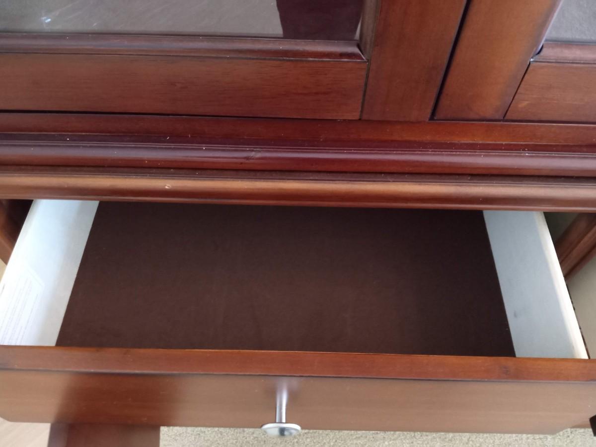 2 FELT-LINED DRAWERS AND 3 DOOR CABINETS WITH A WOODEN SHELF ON THE BOTTOM.