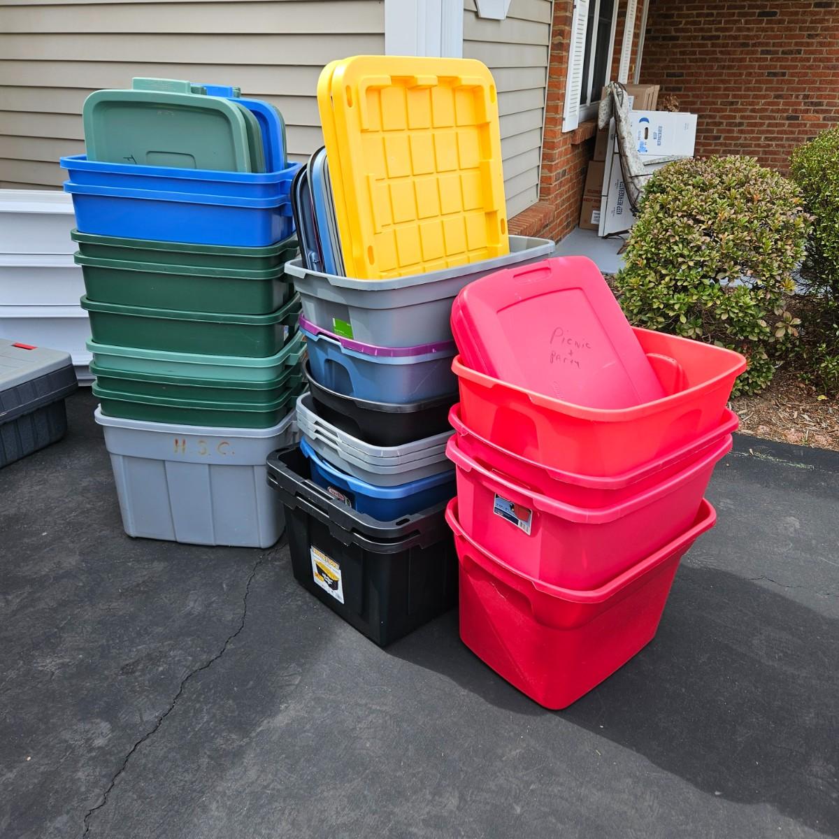 A lot of storage bins that has over 20 bins. Includes Tough Box, Sterilite, Rubbermaid and Homz. Sizes range from 27 gal and a majority are 18 gal. All of them include lids. Local pickup only