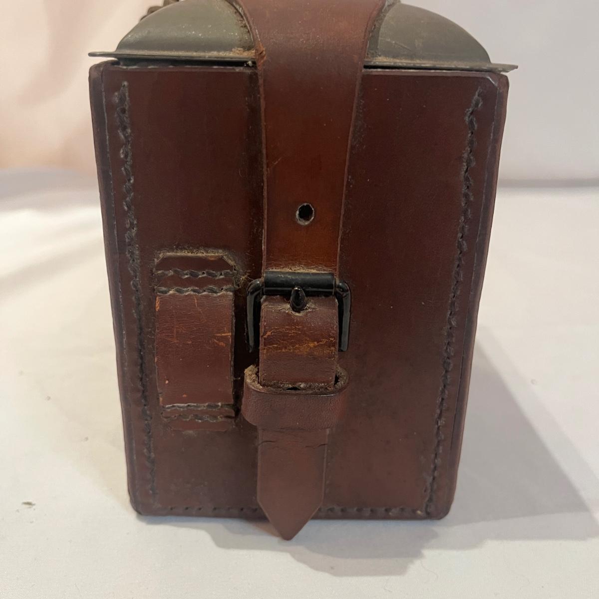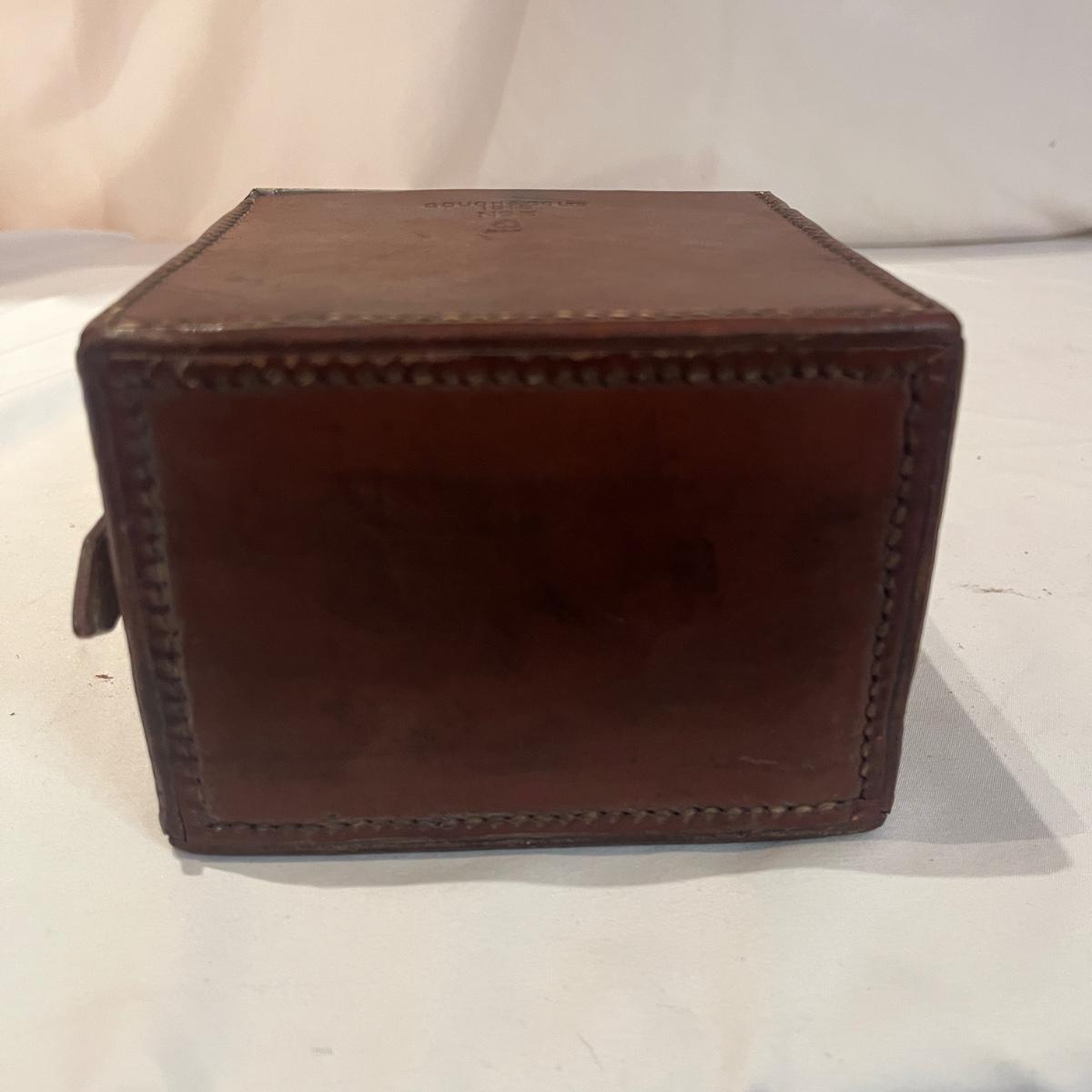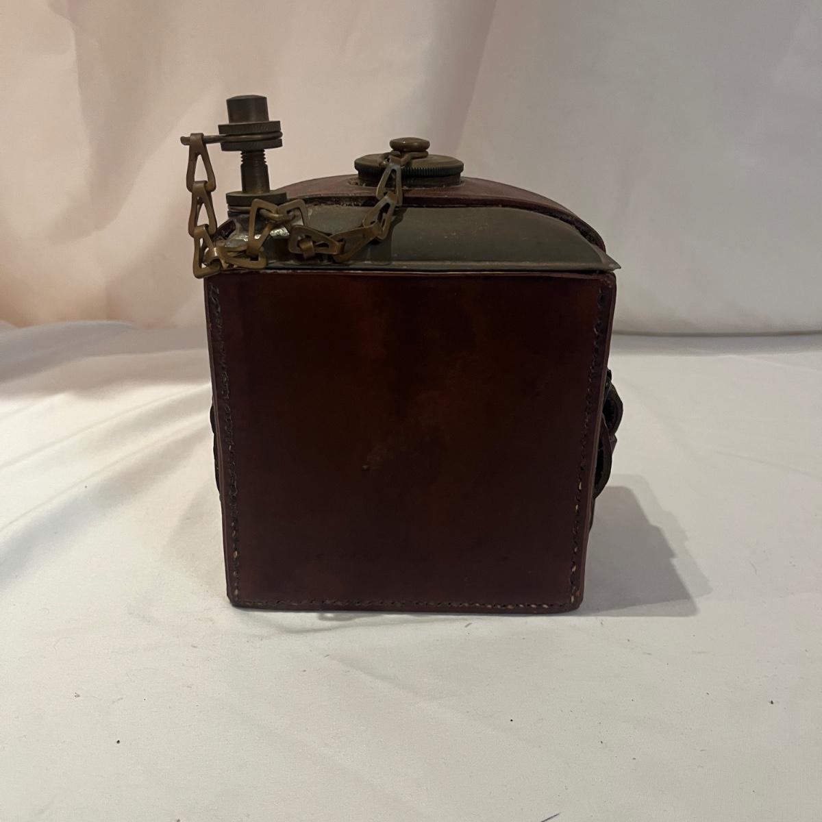 Lot includes a Gough & Co. oil can with leather case. Piece measures 5” x 4” x 7”H. Leather strap is cracking so it was not opened to prevent further cracking. Leather is stamped with "Gough & Co LTD 1916 No. 3".