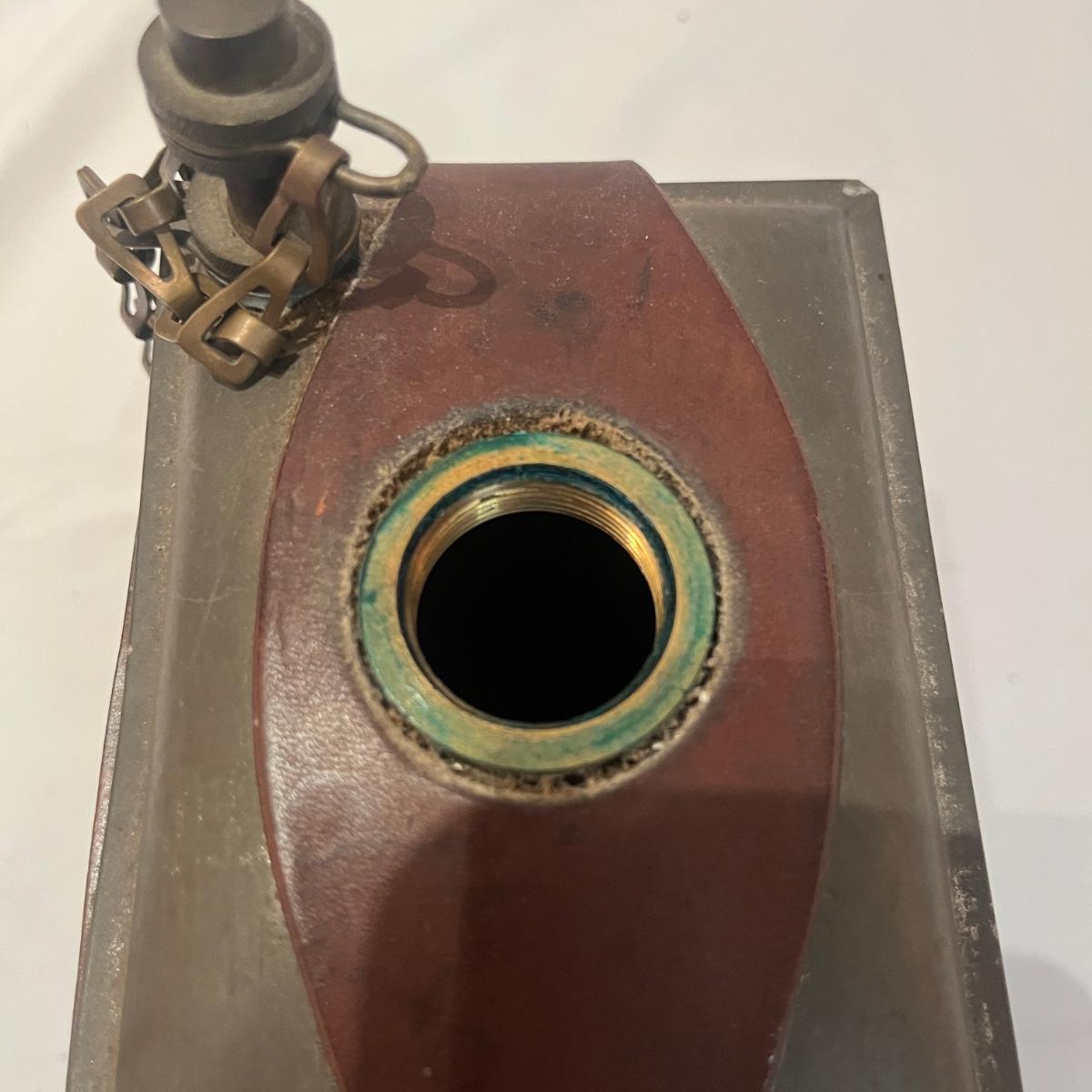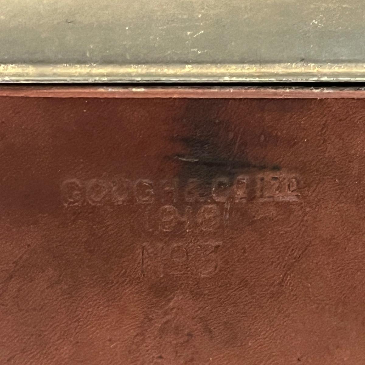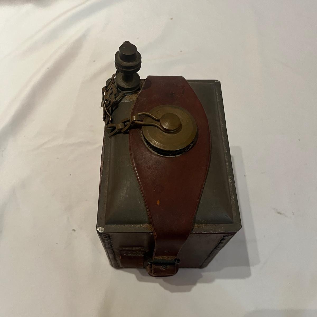Lot includes a Gough & Co. oil can with leather case. Piece measures 5” x 4” x 7”H. Leather strap is cracking so it was not opened to prevent further cracking. Leather is stamped with "Gough & Co LTD 1916 No. 3".