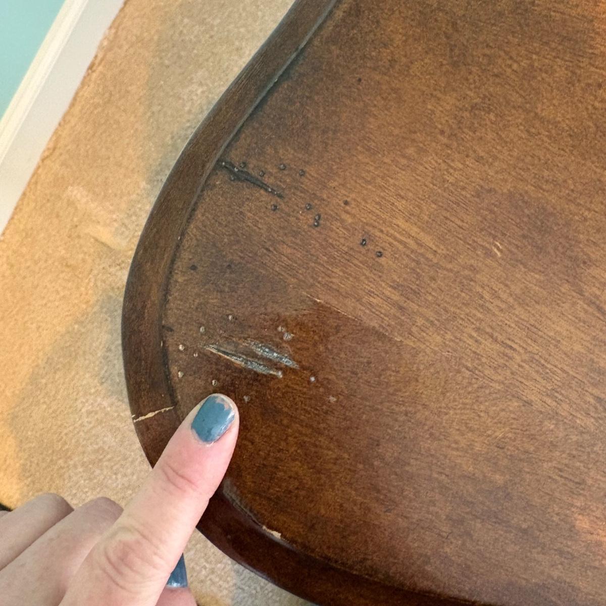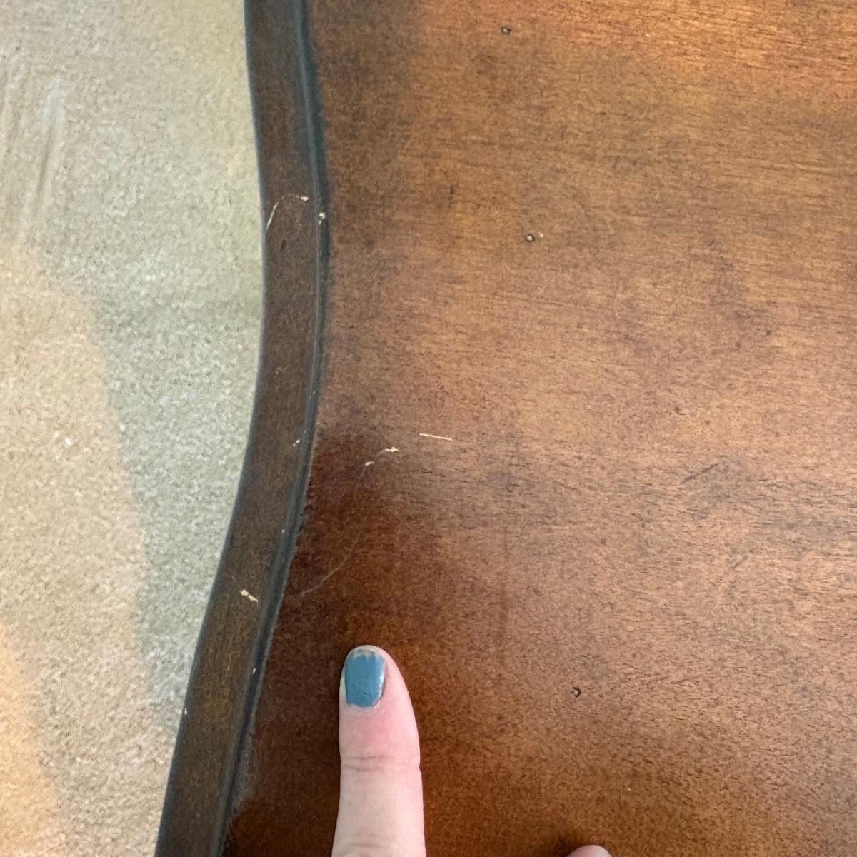 This Toulon style rectangular cocktail table features scalloped edges and cabriole legs. It matches the two Toulon style side tables. The measurements are approximately 45" x 27" x 23"H. There are blemishes on the wood, see pictures for reference.