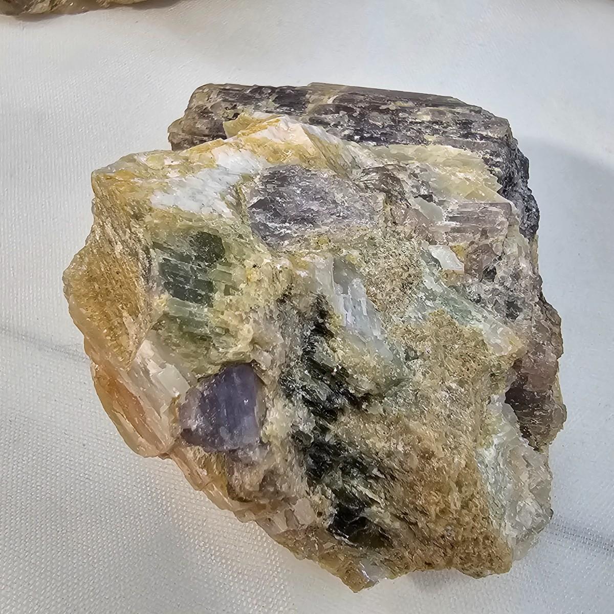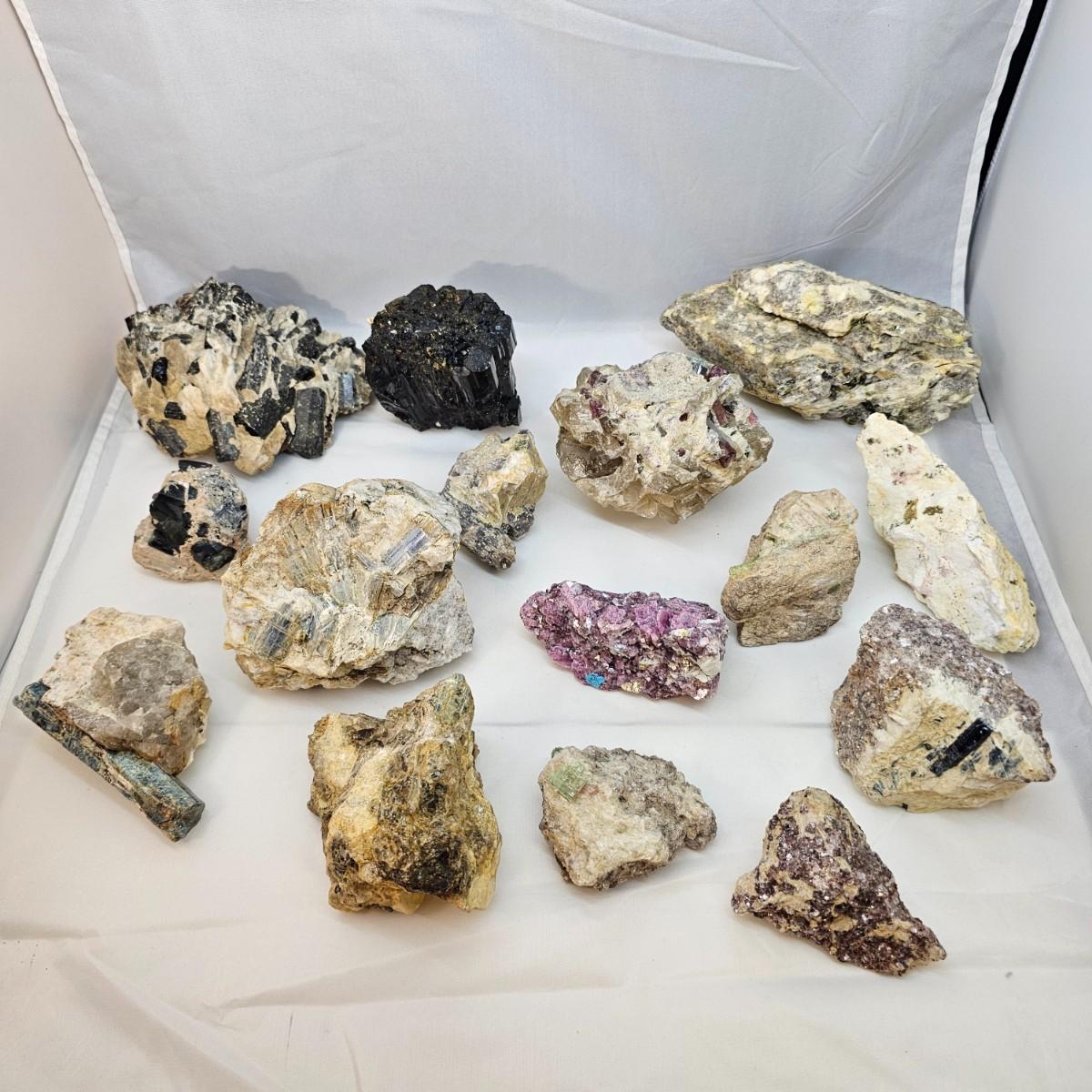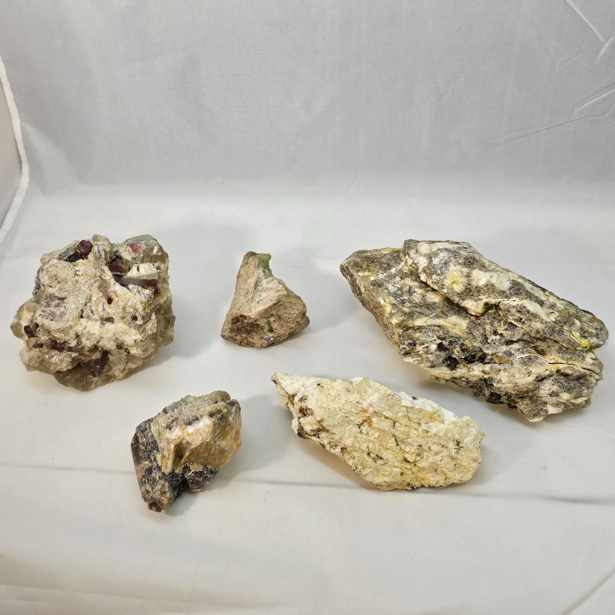 Stunning examples of what appears to be tourmaline in its many colors, along with lepidolite, kyanite and more. Black, green and yellow tourmaline in crystal and tubular form. Kyanite in hexagonal rod form in matrix. The large piece of black tourmaline measures approximately 3.5" x 2.5" x 3"H. All items in rough, natural form. See photos for details. Shipping available. All sales are final. No returns or refunds. Please bid accordingly.