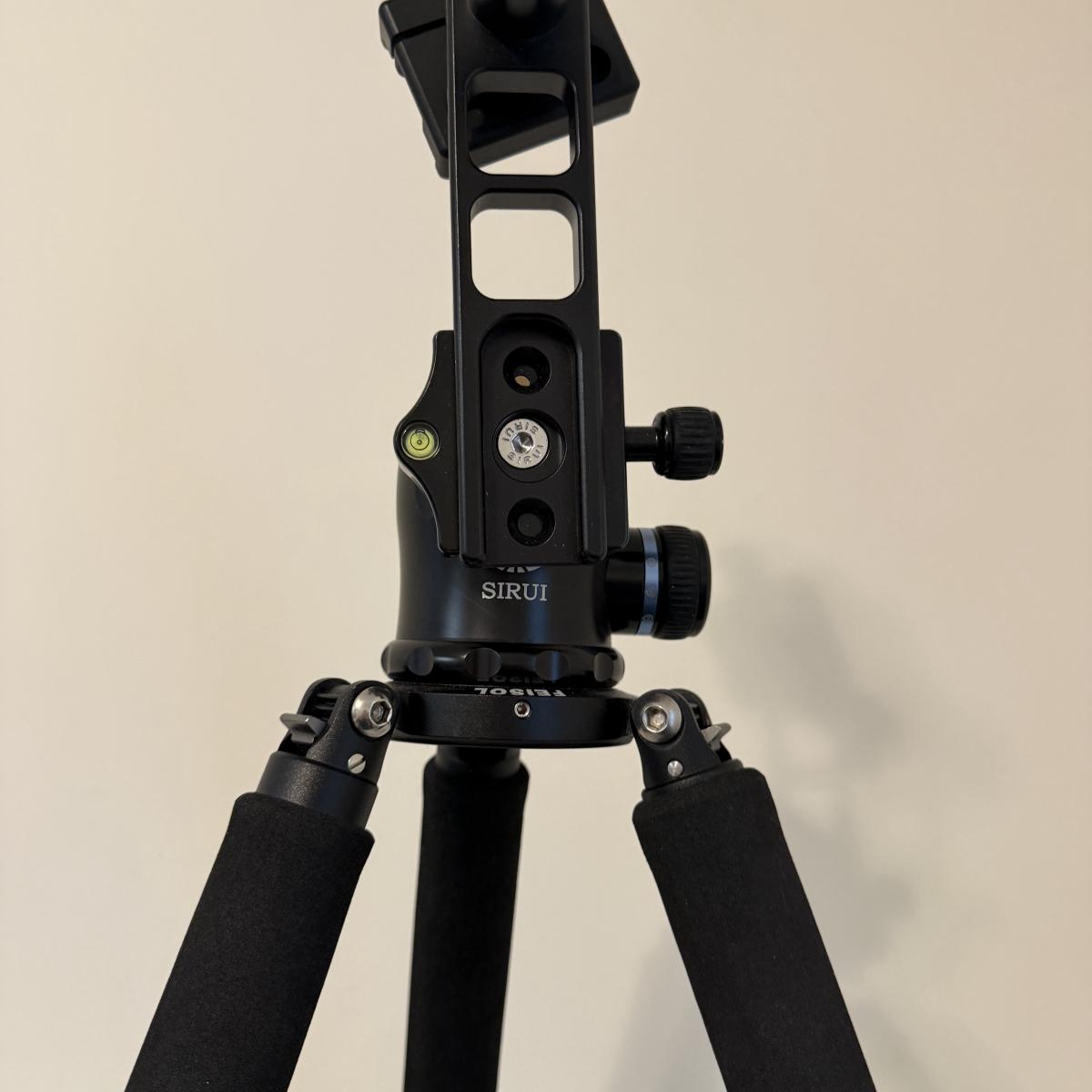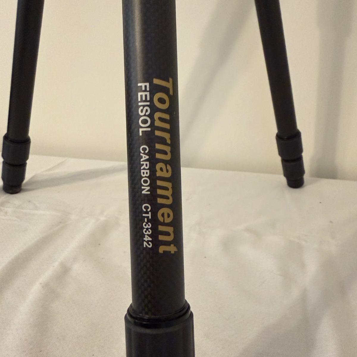 Lot includes a Tournament Feisol Carbon CT-3342 Tripod with BWG Micro Gimbal/Ballhead Adapter and carrying bag. Tripod measures 67”high when extended.