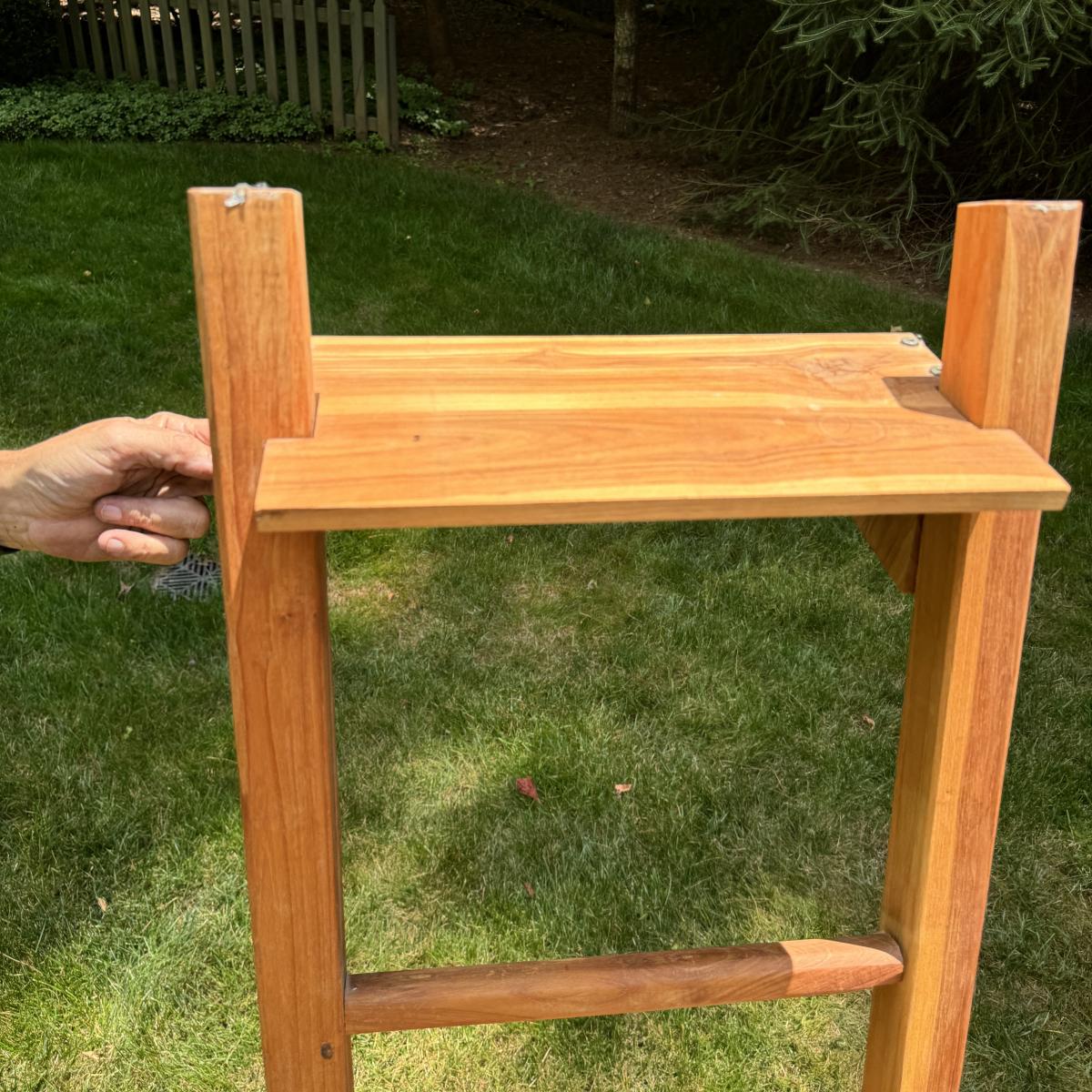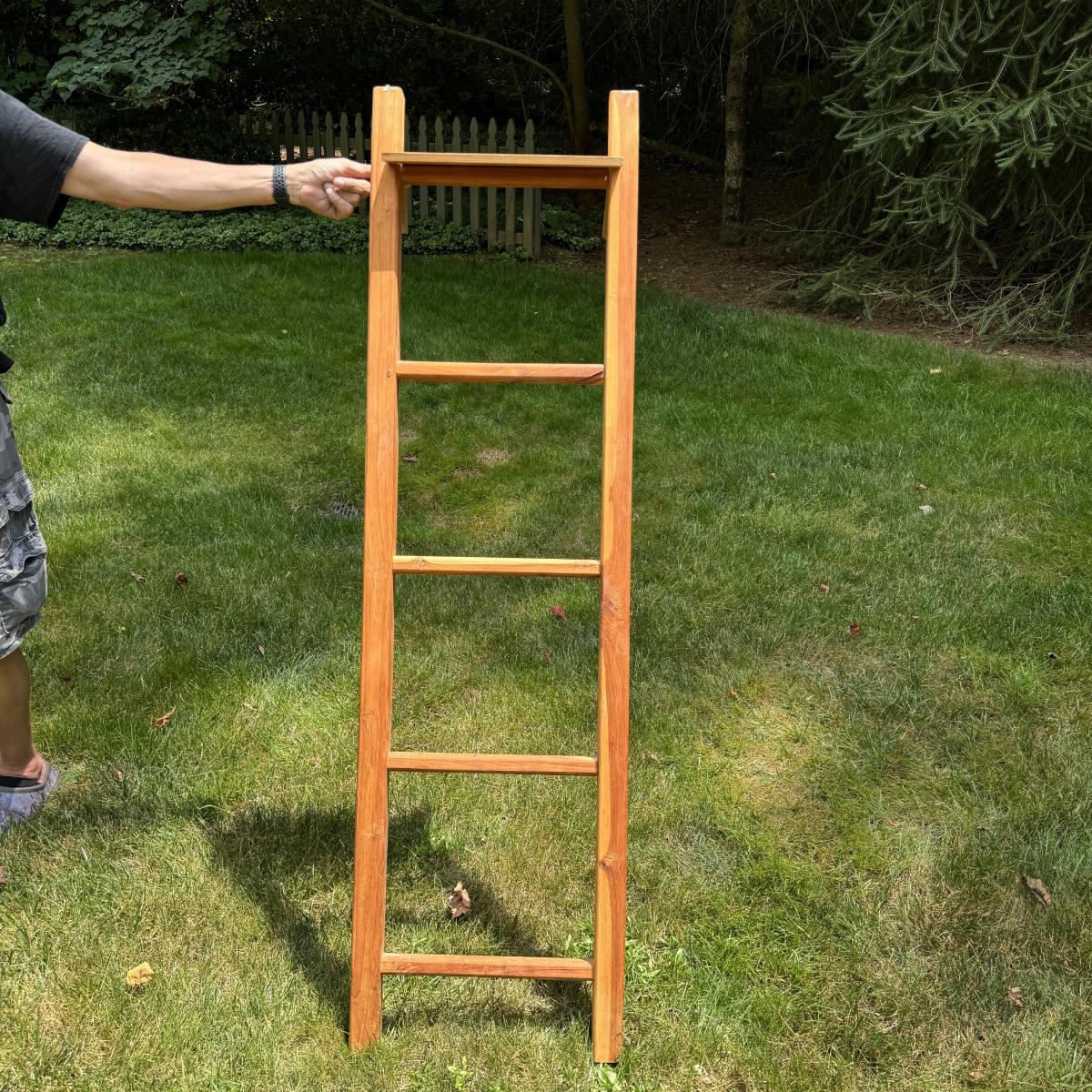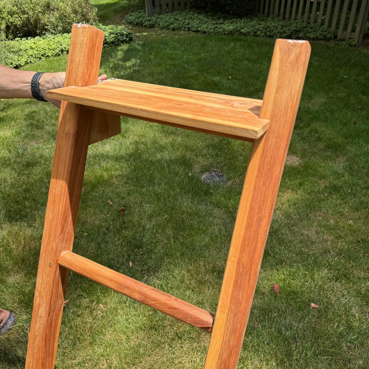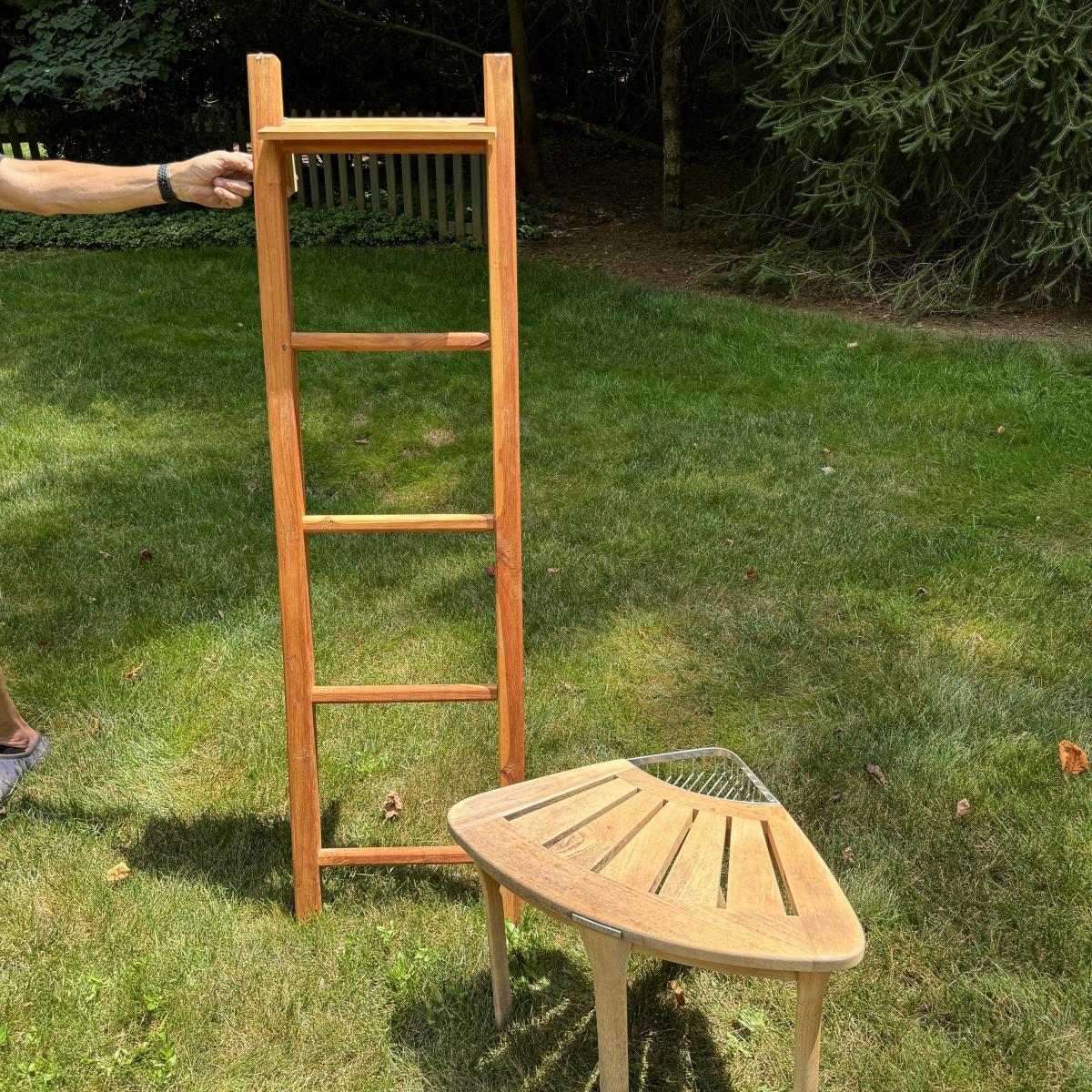 Wooden towel ladder leans against a wall to store hanging towels. Includes a removable shelf that helps it lean on wall. Stool is made by Frontgate and is teak. Has some wear from being wet over time but still very sturdy. Ladder measures 63” tall by 18” wide. Stool is 26.5” at widest point by 21” and 18” tall. Note that ladder has small crack in one bottom leg, see photos for details. Local pick up only.