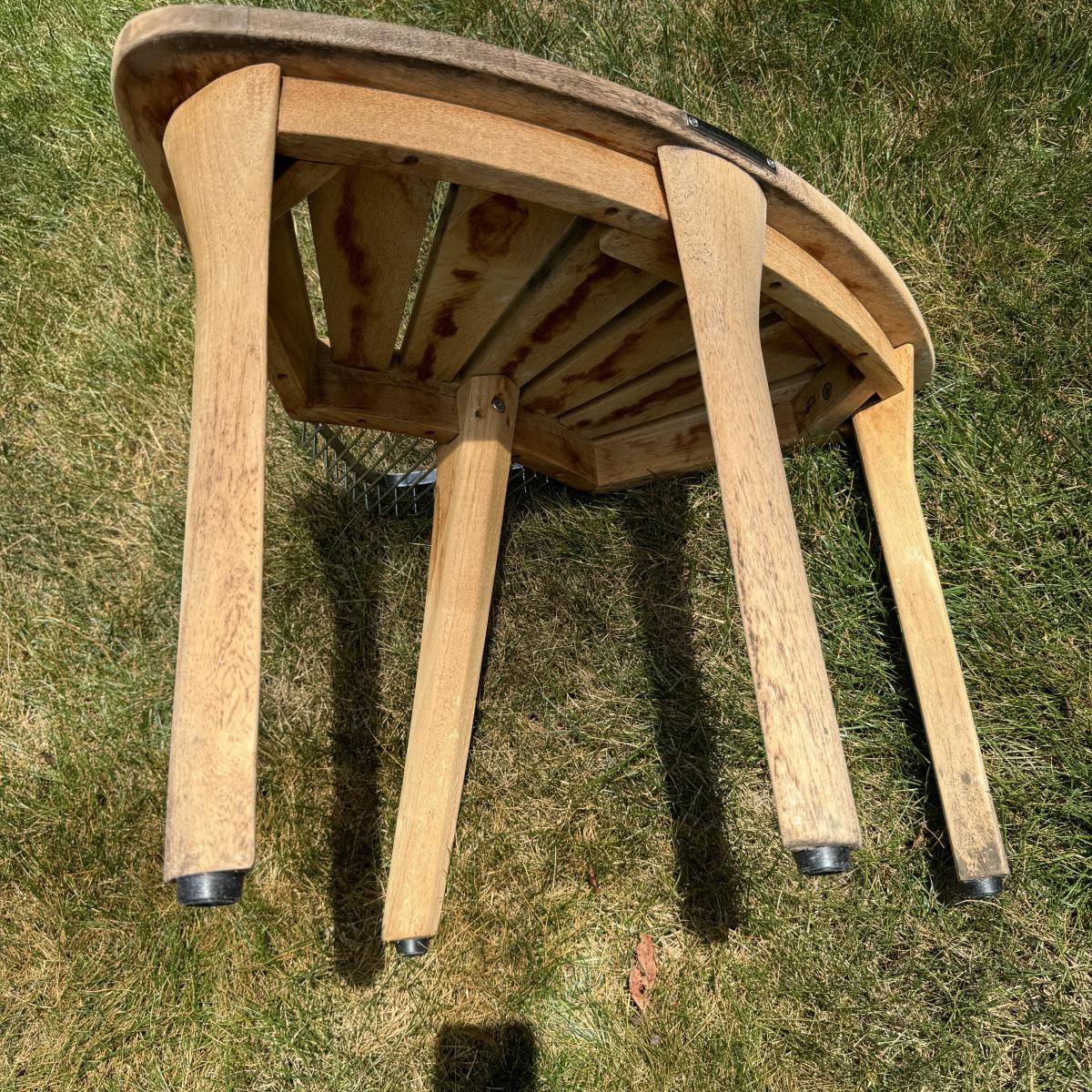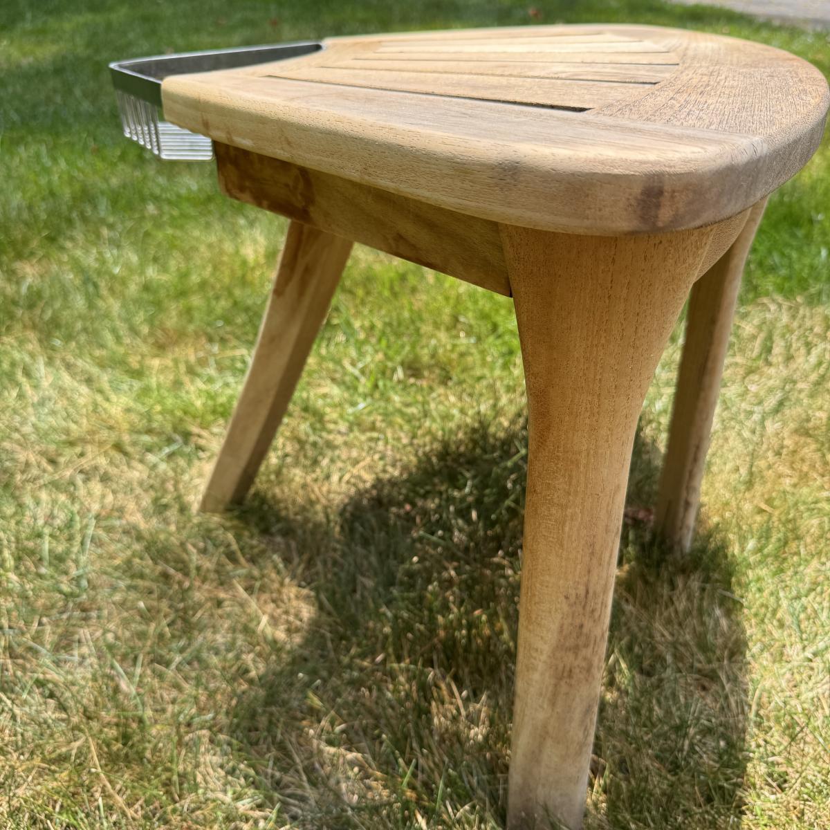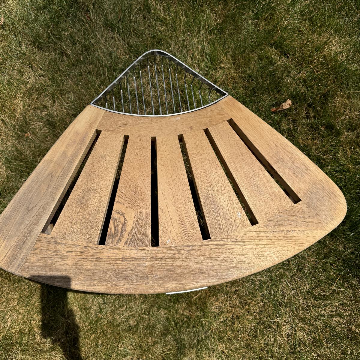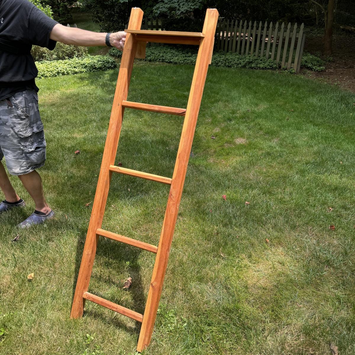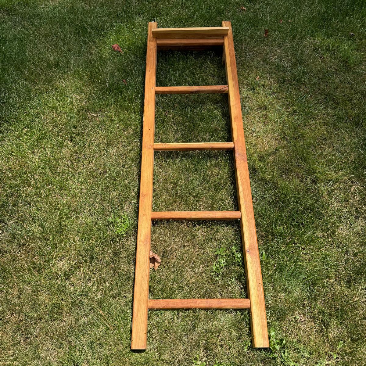 Wooden towel ladder leans against a wall to store hanging towels. Includes a removable shelf that helps it lean on wall. Stool is made by Frontgate and is teak. Has some wear from being wet over time but still very sturdy. Ladder measures 63” tall by 18” wide. Stool is 26.5” at widest point by 21” and 18” tall. Note that ladder has small crack in one bottom leg, see photos for details. Local pick up only.