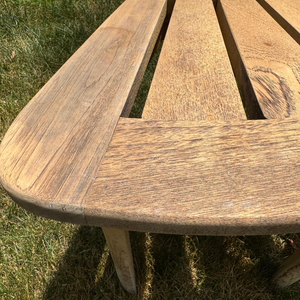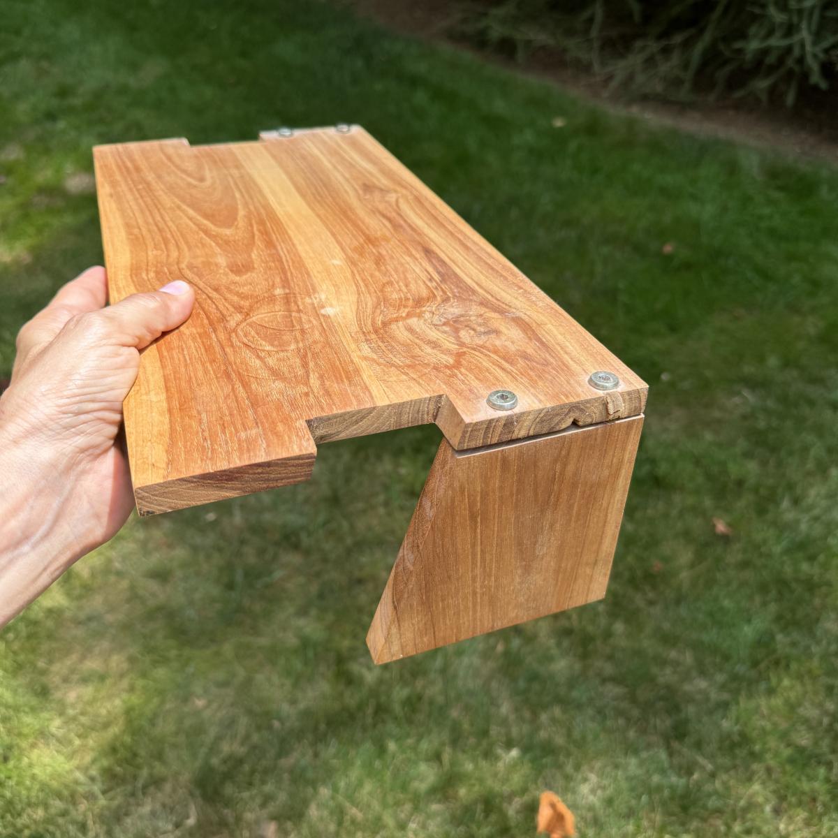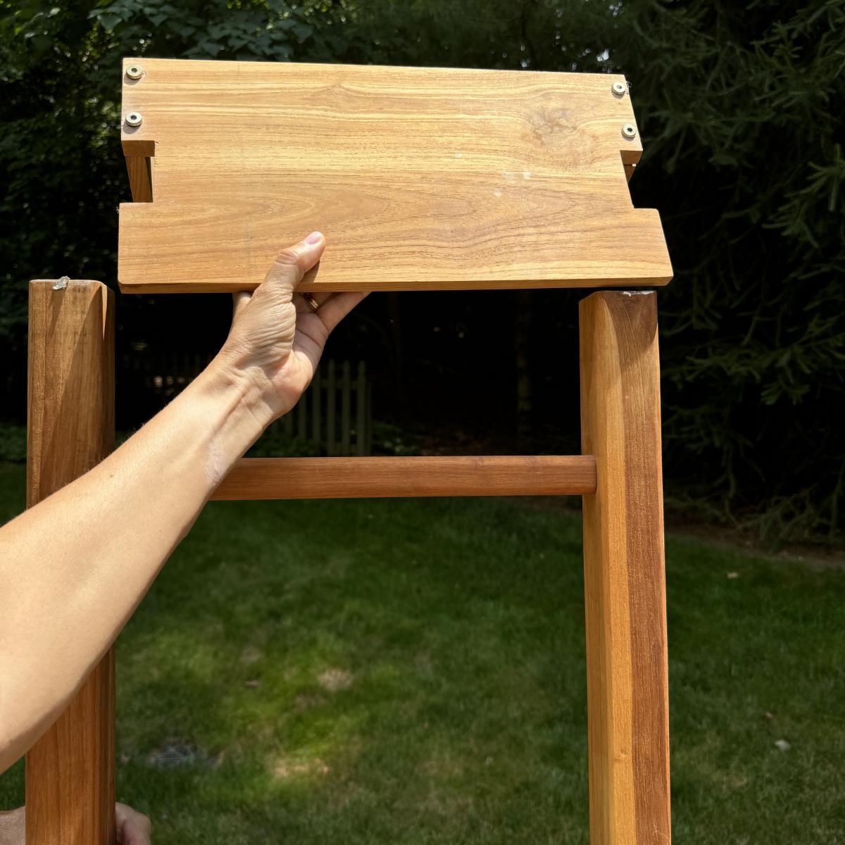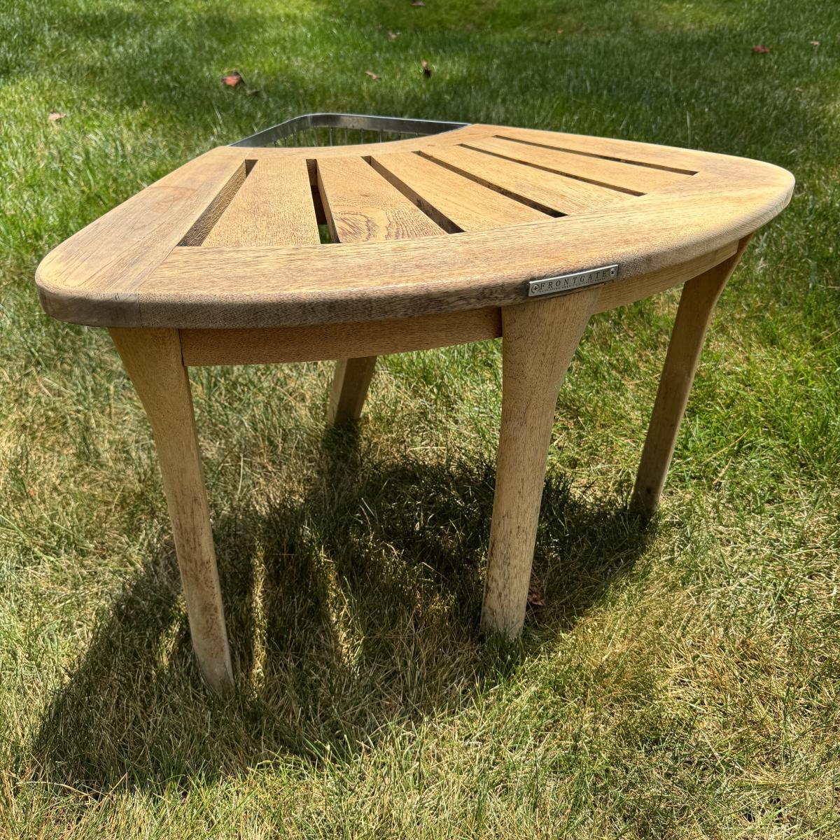 Wooden towel ladder leans against a wall to store hanging towels. Includes a removable shelf that helps it lean on wall. Stool is made by Frontgate and is teak. Has some wear from being wet over time but still very sturdy. Ladder measures 63” tall by 18” wide. Stool is 26.5” at widest point by 21” and 18” tall. Note that ladder has small crack in one bottom leg, see photos for details. Local pick up only.