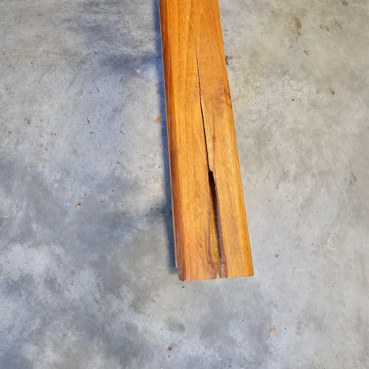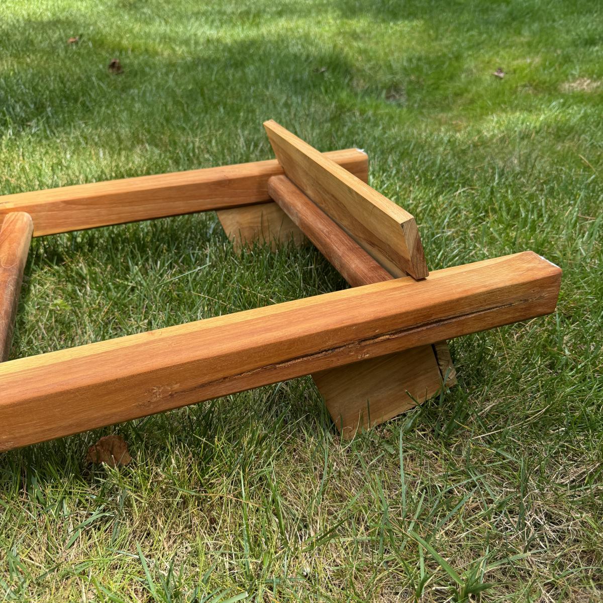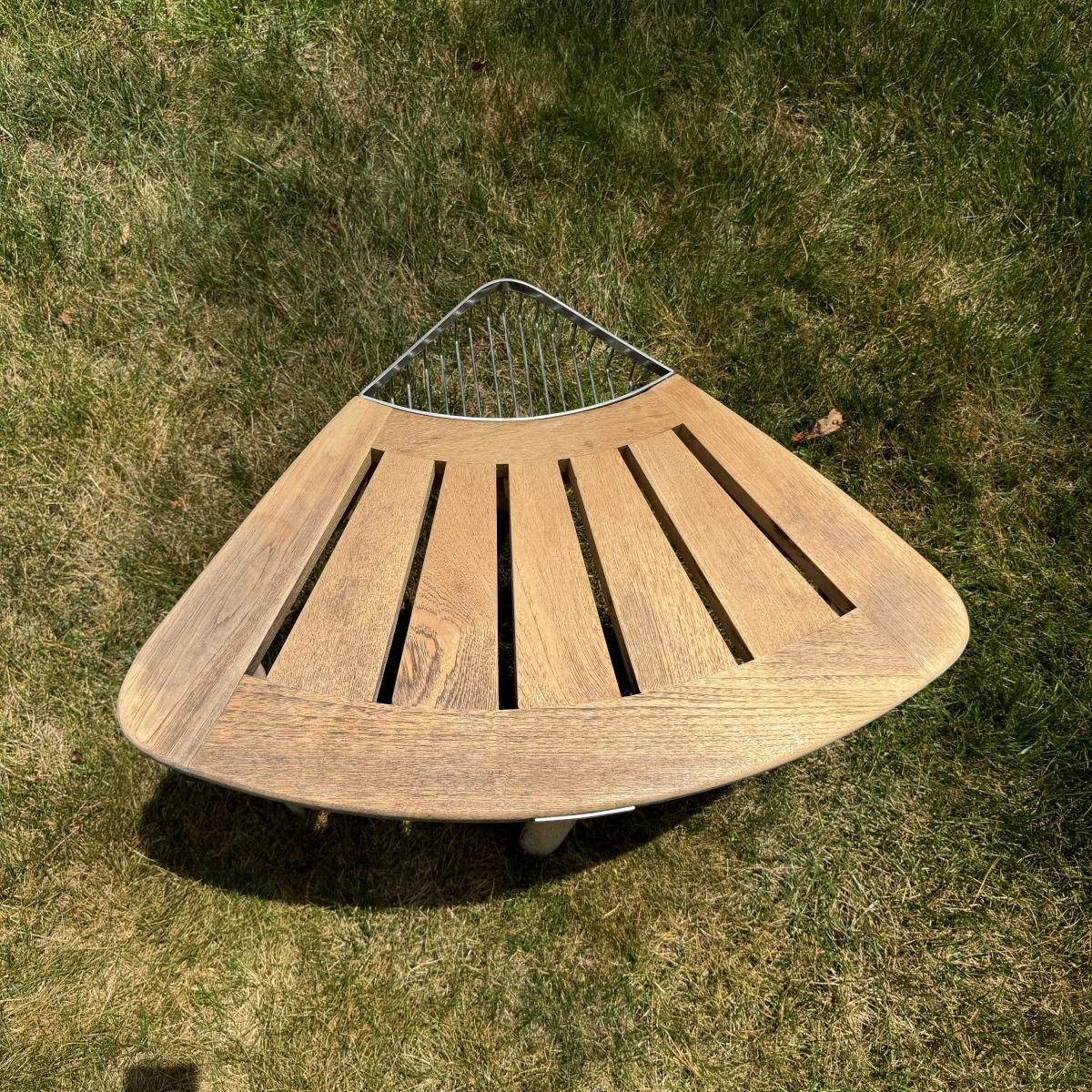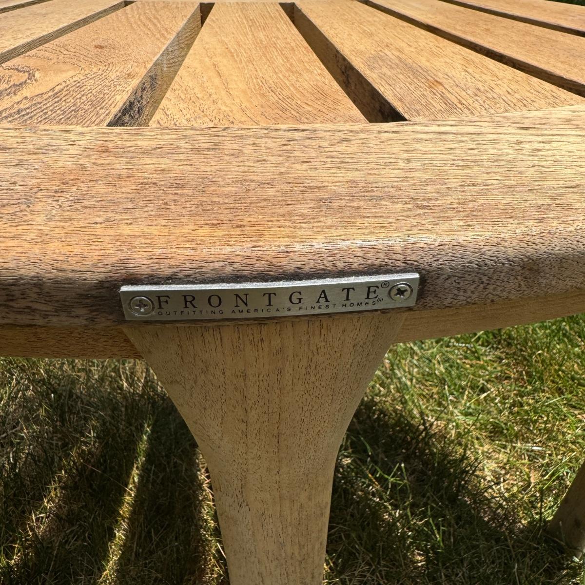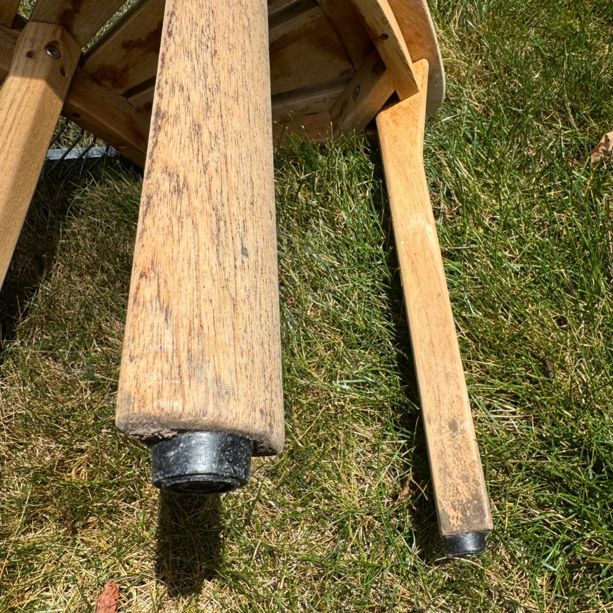 Wooden towel ladder leans against a wall to store hanging towels. Includes a removable shelf that helps it lean on wall. Stool is made by Frontgate and is teak. Has some wear from being wet over time but still very sturdy. Ladder measures 63” tall by 18” wide. Stool is 26.5” at widest point by 21” and 18” tall. Note that ladder has small crack in one bottom leg, see photos for details. Local pick up only.