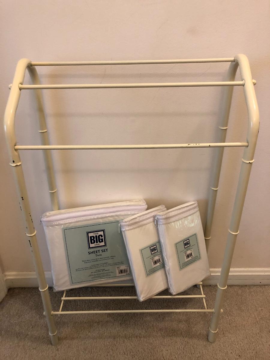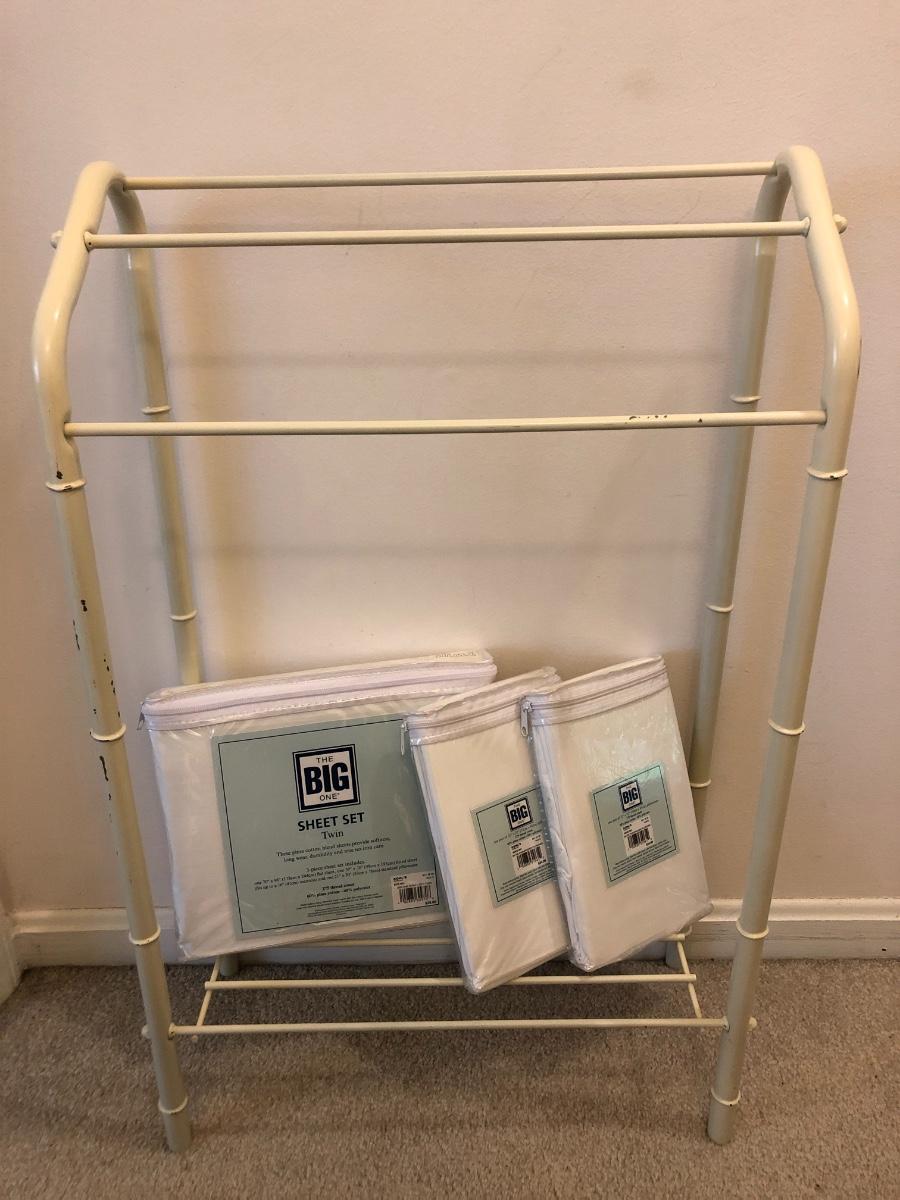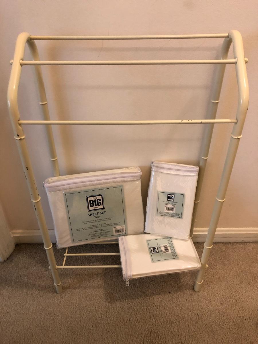 Metal Towel Rack & New Kohl Twin Sheets w/ Pillow Cases -Lot 157