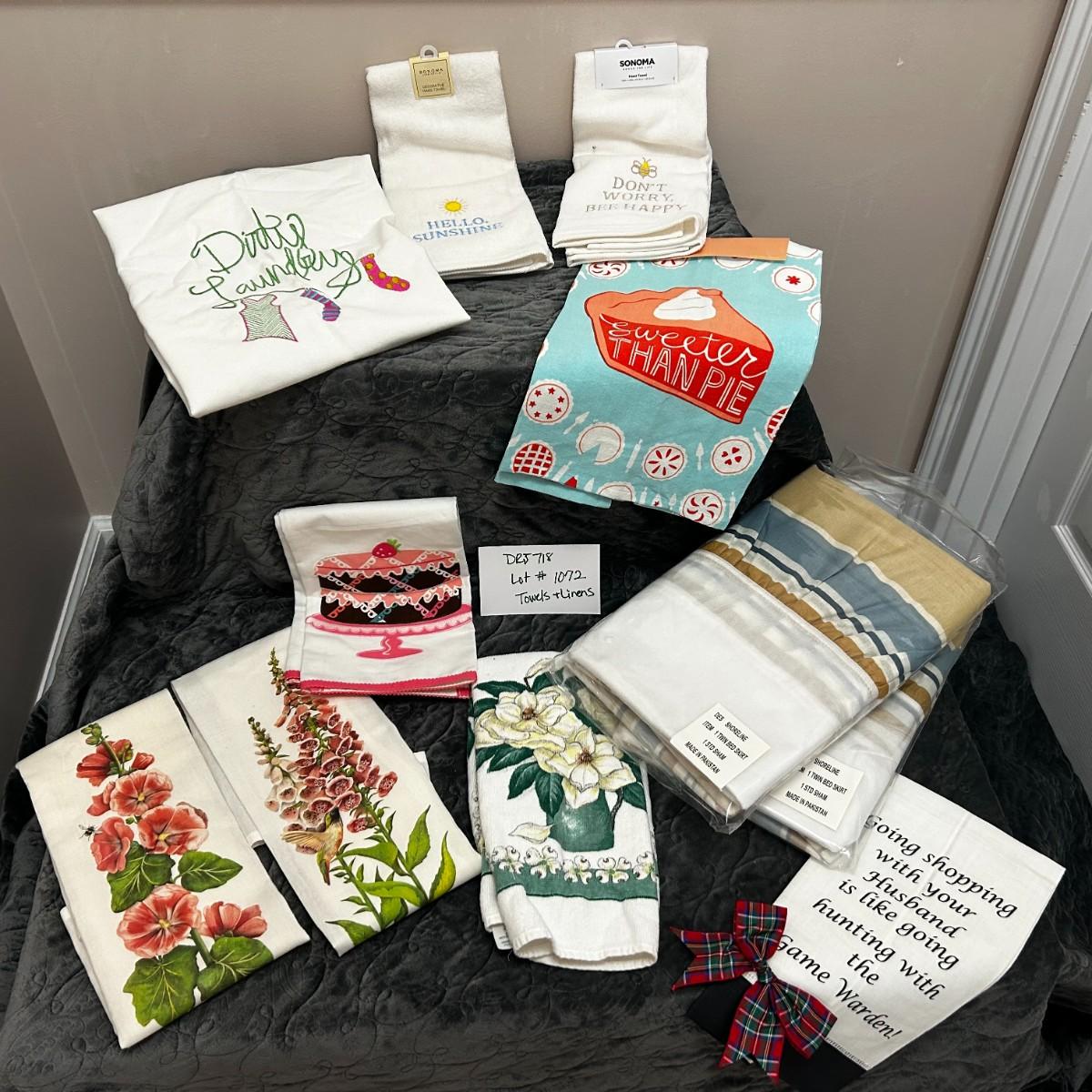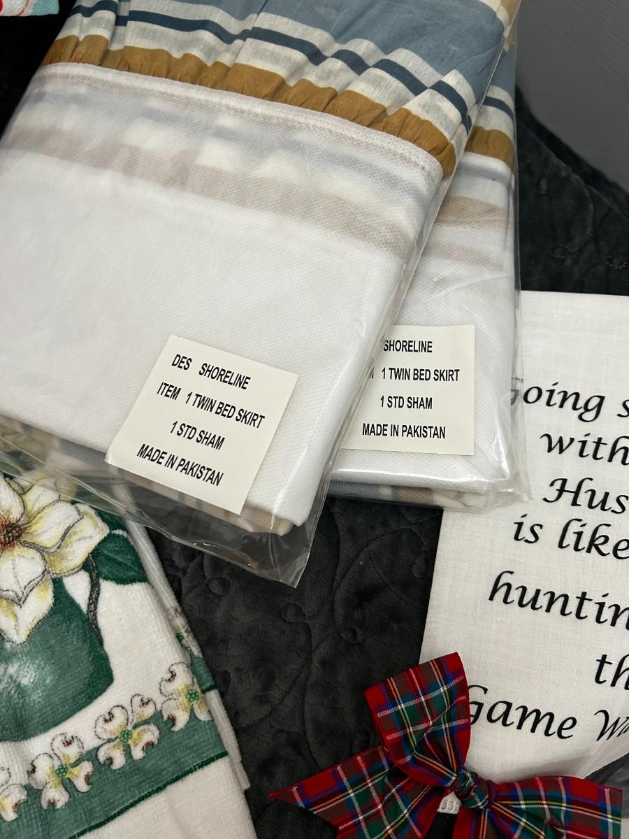 A great lot filled with many NEW hand towels, Two NEW Twin size bedskirts in package and an adorable laundry bag.