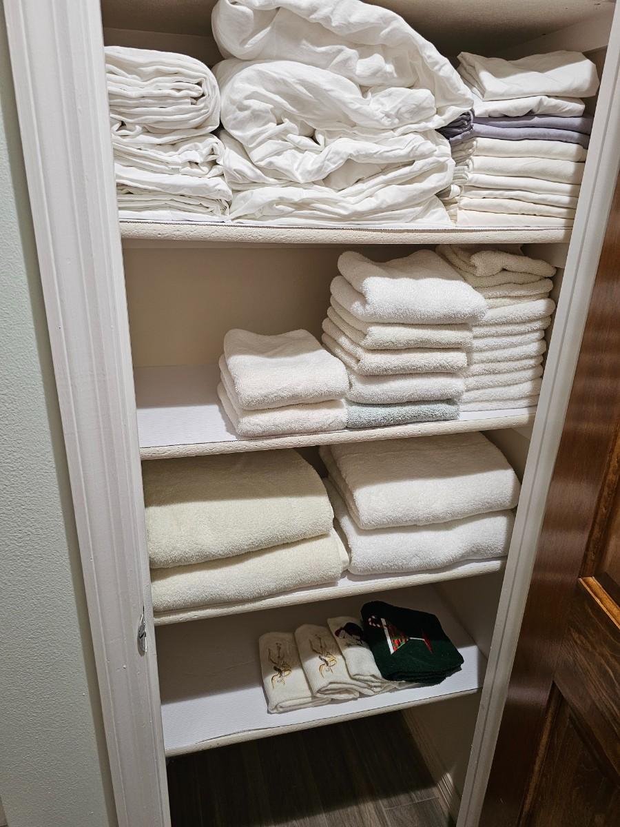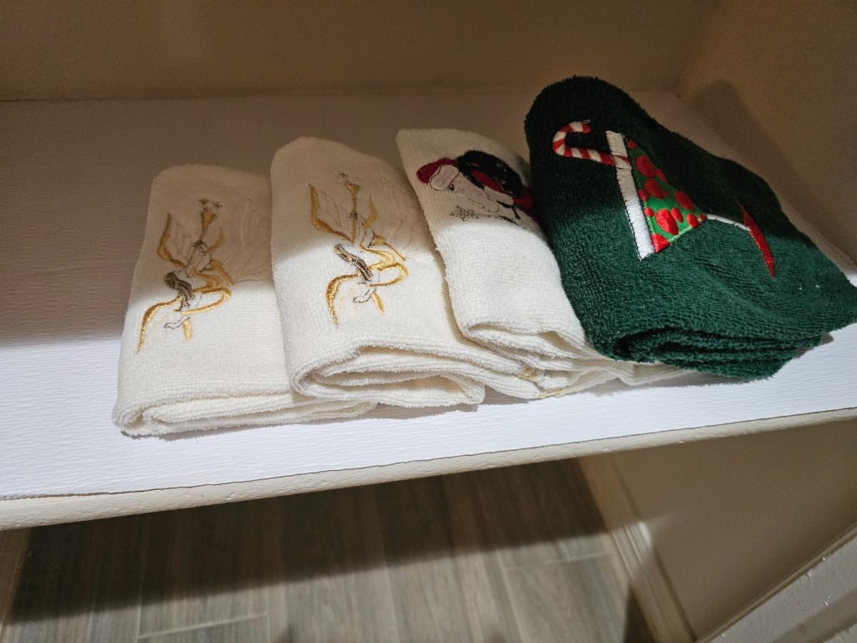 King size white sheets, pillow cases, bath, wash cloths and hand towels, a few holiday hand towels.