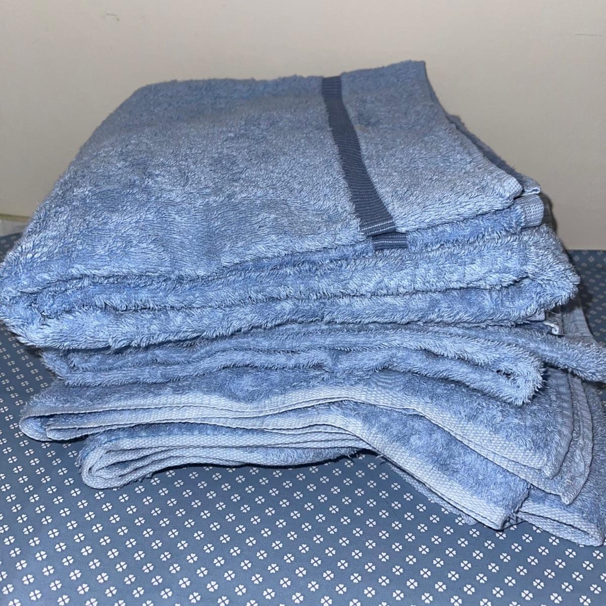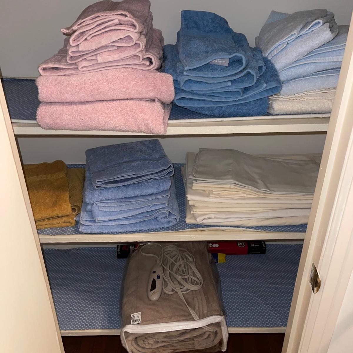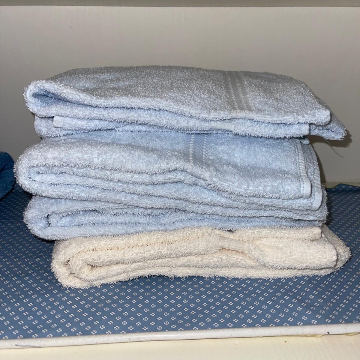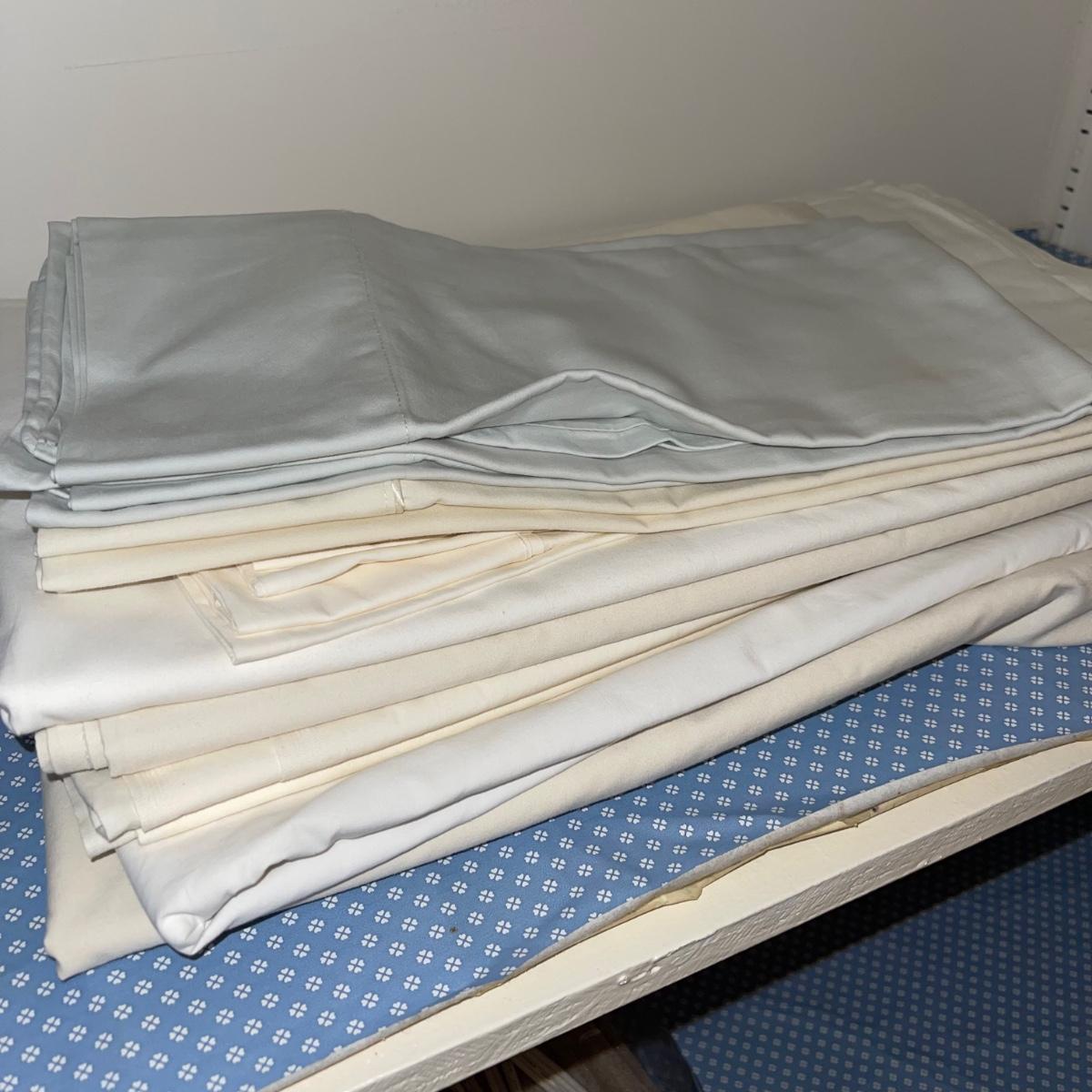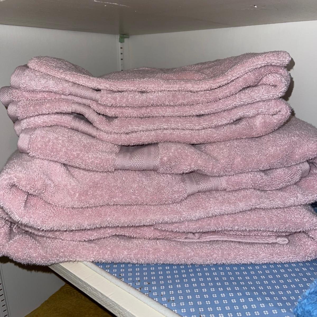 A variety of towels and linens, as well as a heated throw. Starting the lot are two pink bath towels, two hand towels, and one wash cloth. There is one blue bath towel, hand towel, and wash cloth. Next, two light blue bath towels and hand towels, one cream colored bath towel, and two orange bath towels. Last of the towels are three blue bath towels. There are pillowcases and top sheets, all are white/cream colored (4 cream which are doubles and 2 white top sheets-full sized). The heated throw powered on when plugged in.