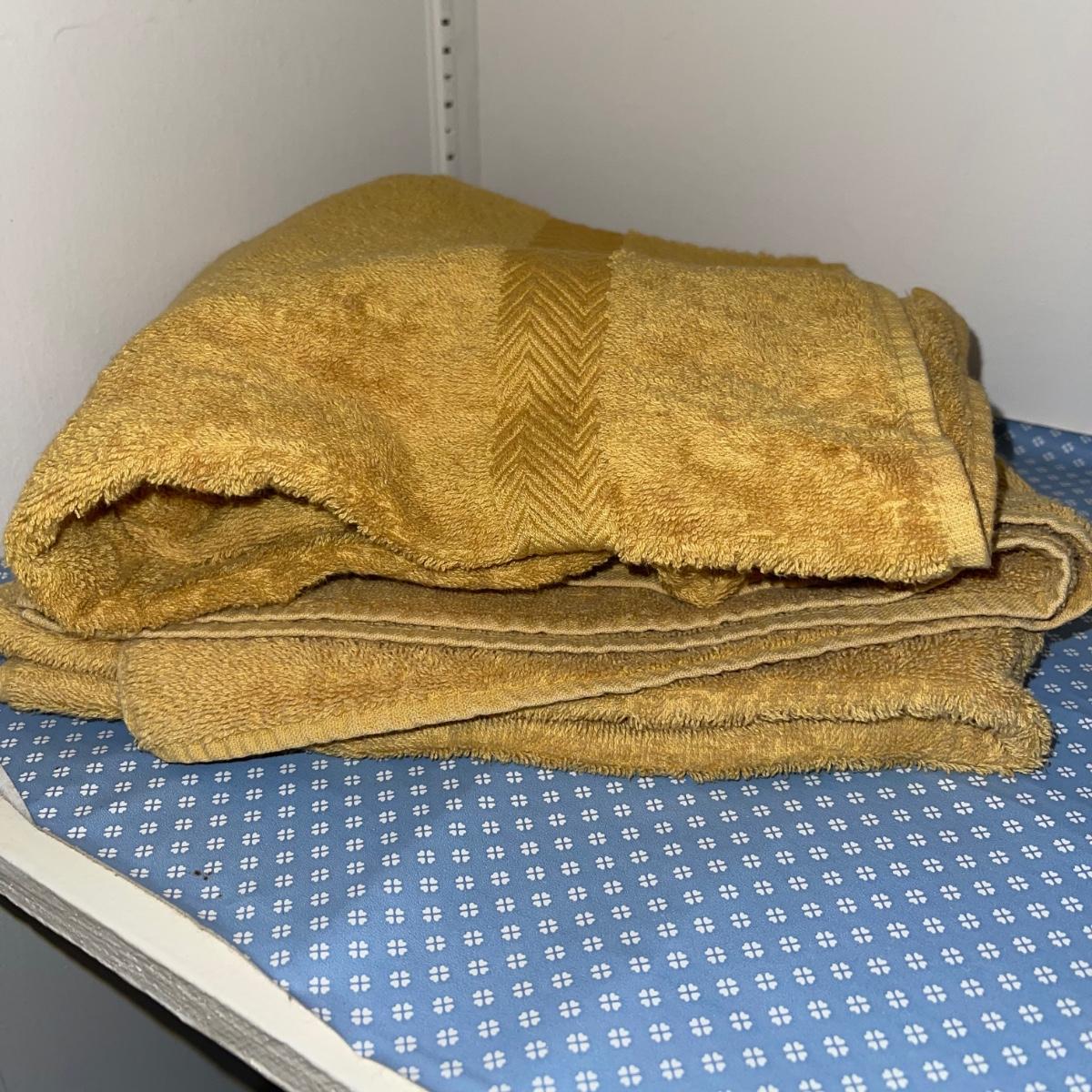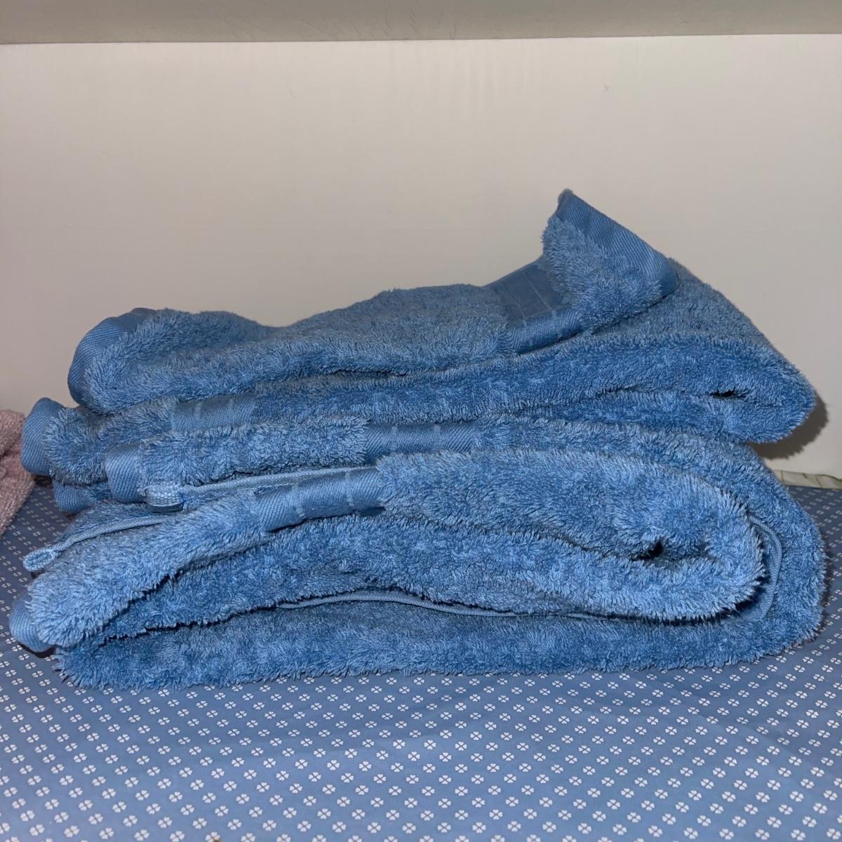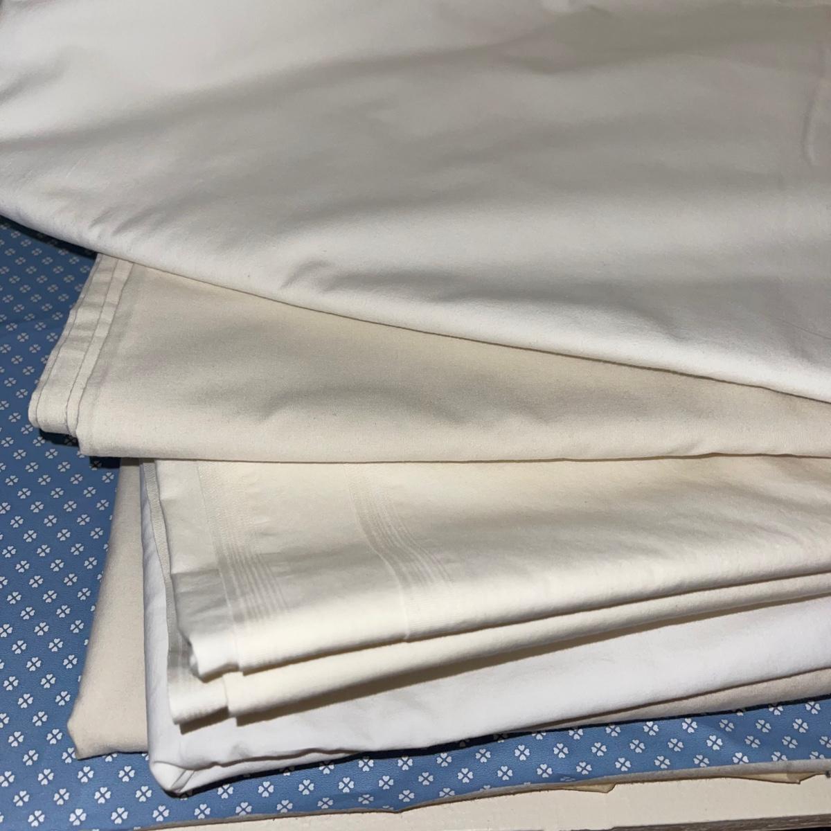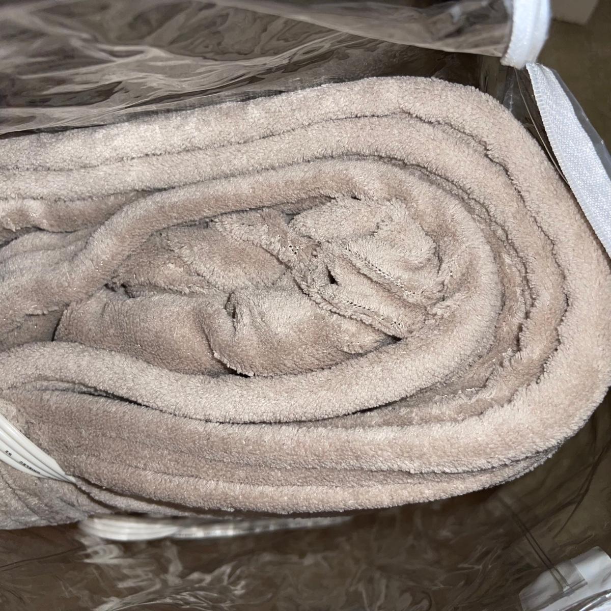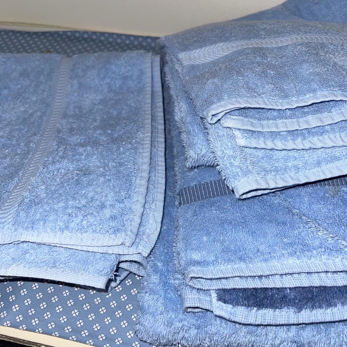 A variety of towels and linens, as well as a heated throw. Starting the lot are two pink bath towels, two hand towels, and one wash cloth. There is one blue bath towel, hand towel, and wash cloth. Next, two light blue bath towels and hand towels, one cream colored bath towel, and two orange bath towels. Last of the towels are three blue bath towels. There are pillowcases and top sheets, all are white/cream colored (4 cream which are doubles and 2 white top sheets-full sized). The heated throw powered on when plugged in.