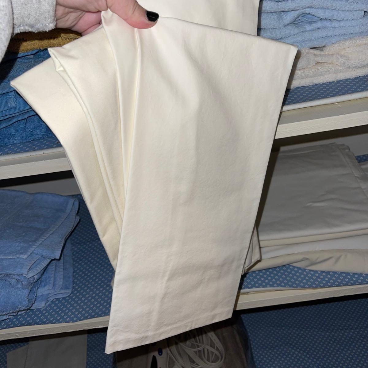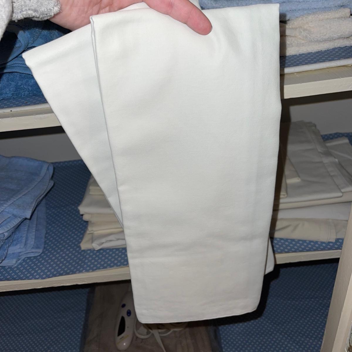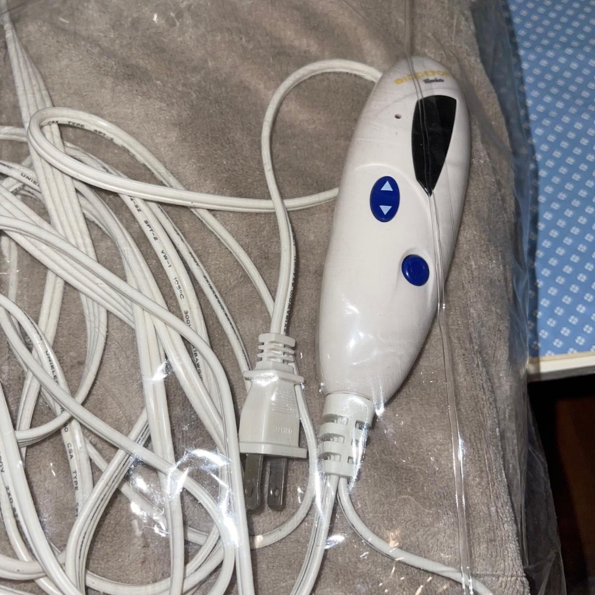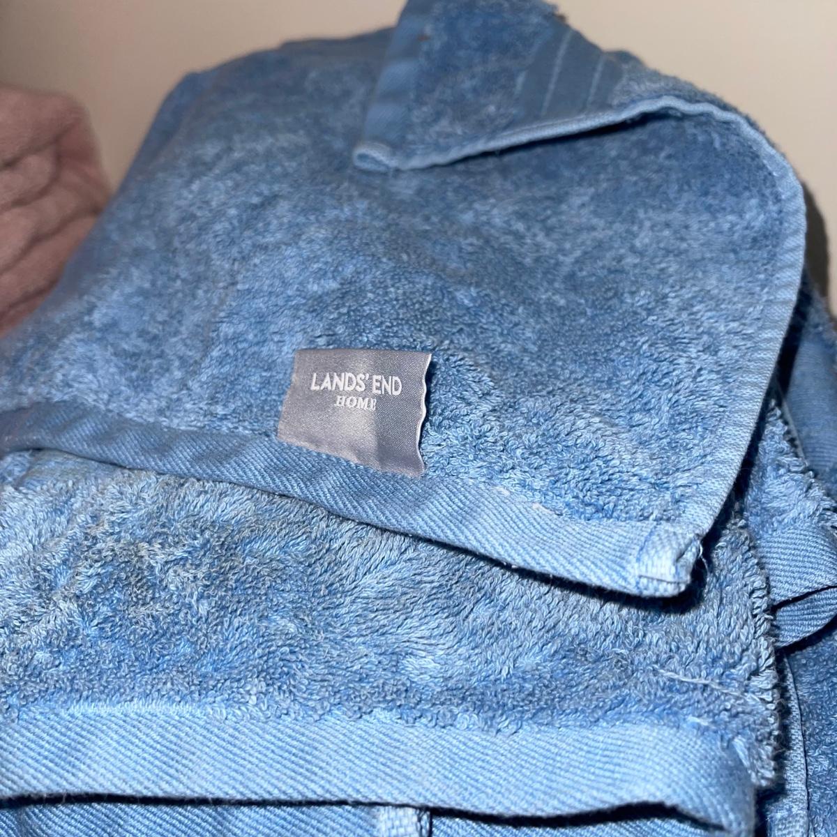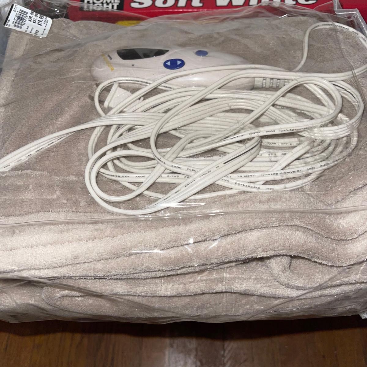 A variety of towels and linens, as well as a heated throw. Starting the lot are two pink bath towels, two hand towels, and one wash cloth. There is one blue bath towel, hand towel, and wash cloth. Next, two light blue bath towels and hand towels, one cream colored bath towel, and two orange bath towels. Last of the towels are three blue bath towels. There are pillowcases and top sheets, all are white/cream colored (4 cream which are doubles and 2 white top sheets-full sized). The heated throw powered on when plugged in.