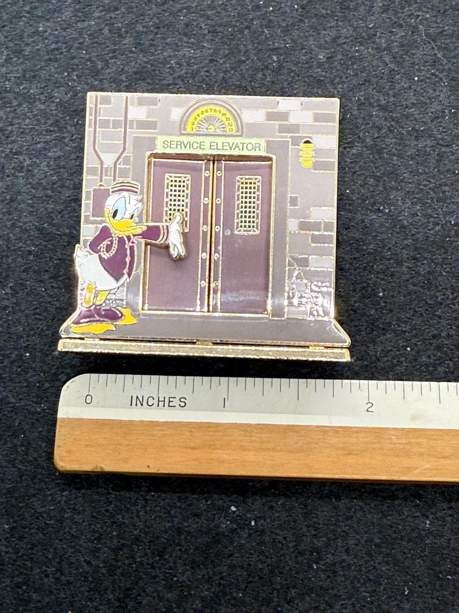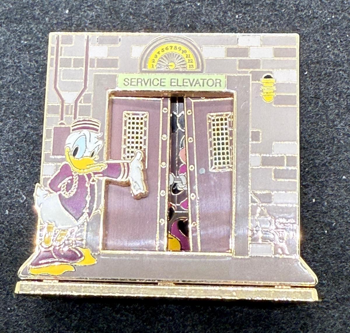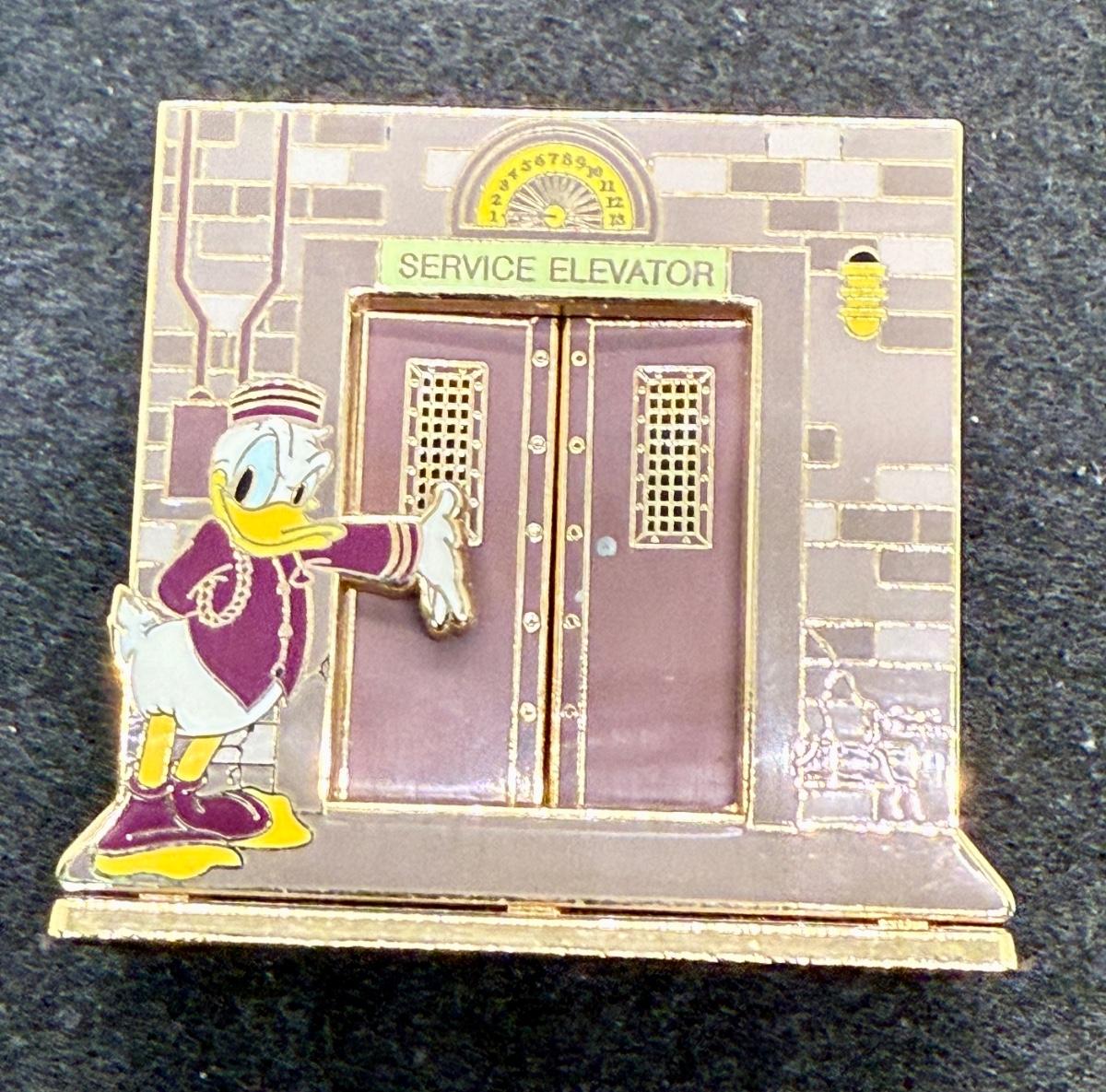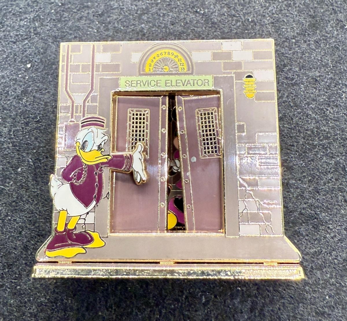 The pin is a diorama-style pin, with Donald dressed as a bellhop leading Mickey and Minnie to a "SERVICE ELEVATOR".