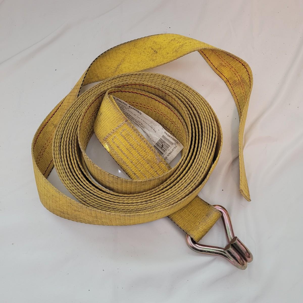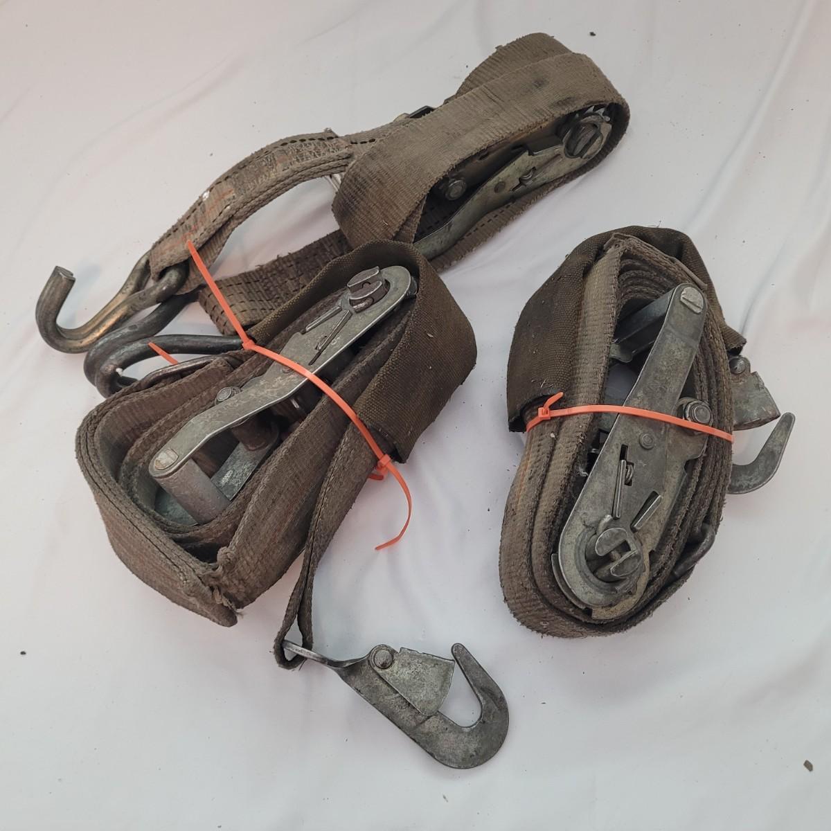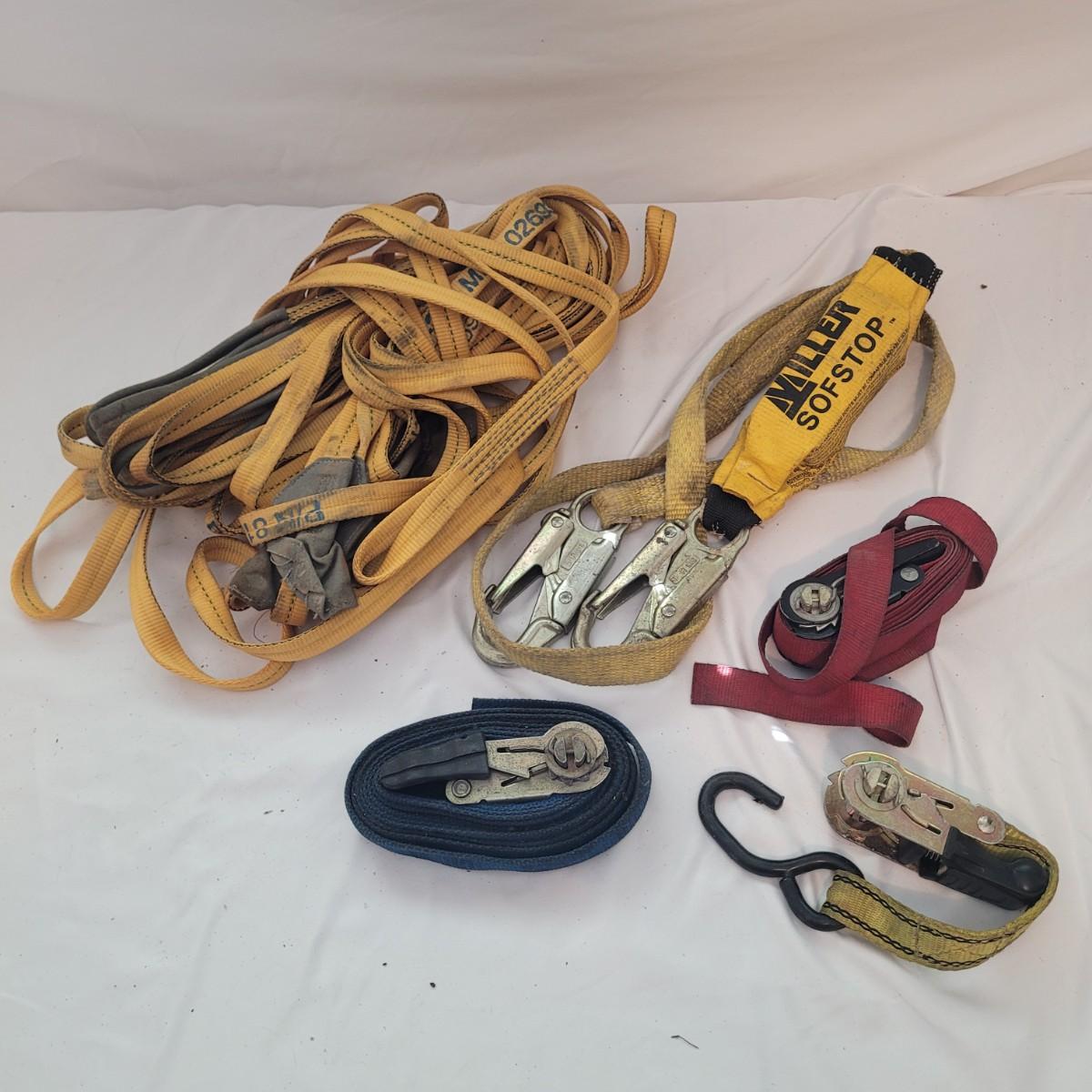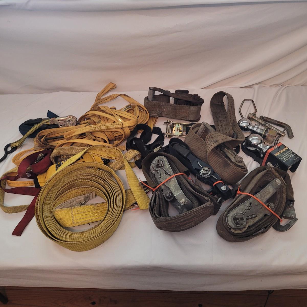 Lot of 12 tow straps and trailer hitch parts. Many different lengths, thicknesses, and types of tow straps. Brands include Miller, Task-Force, and Buyers. Two ball hitches and pins included.