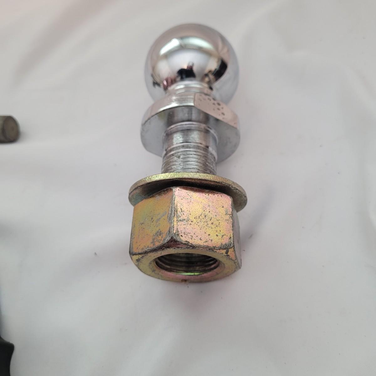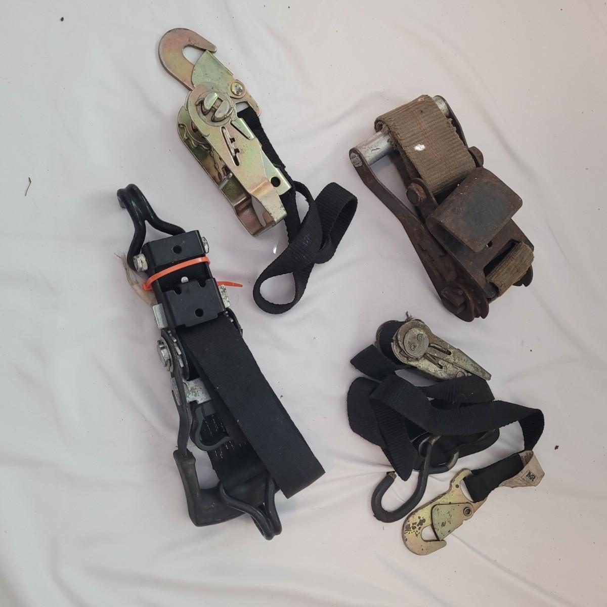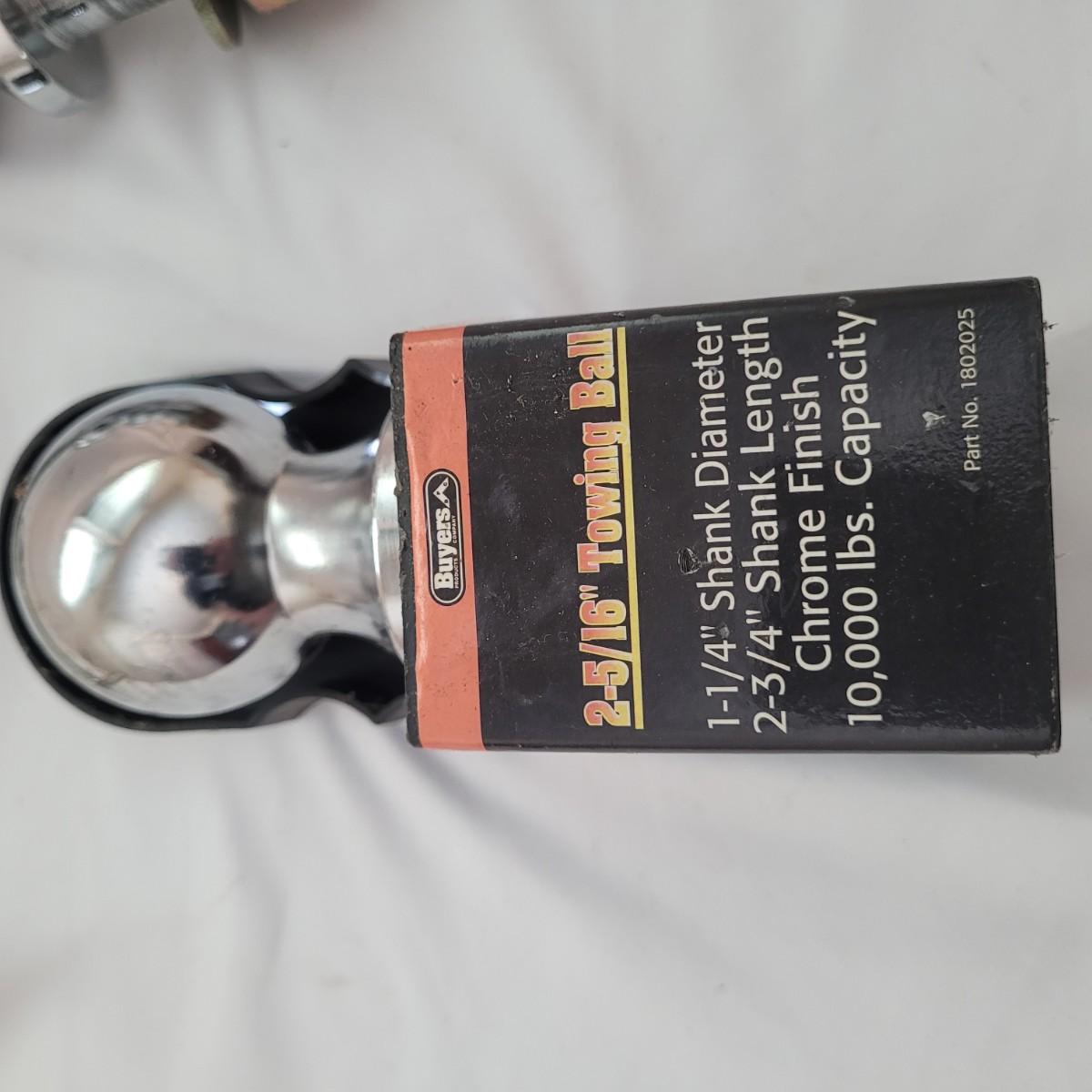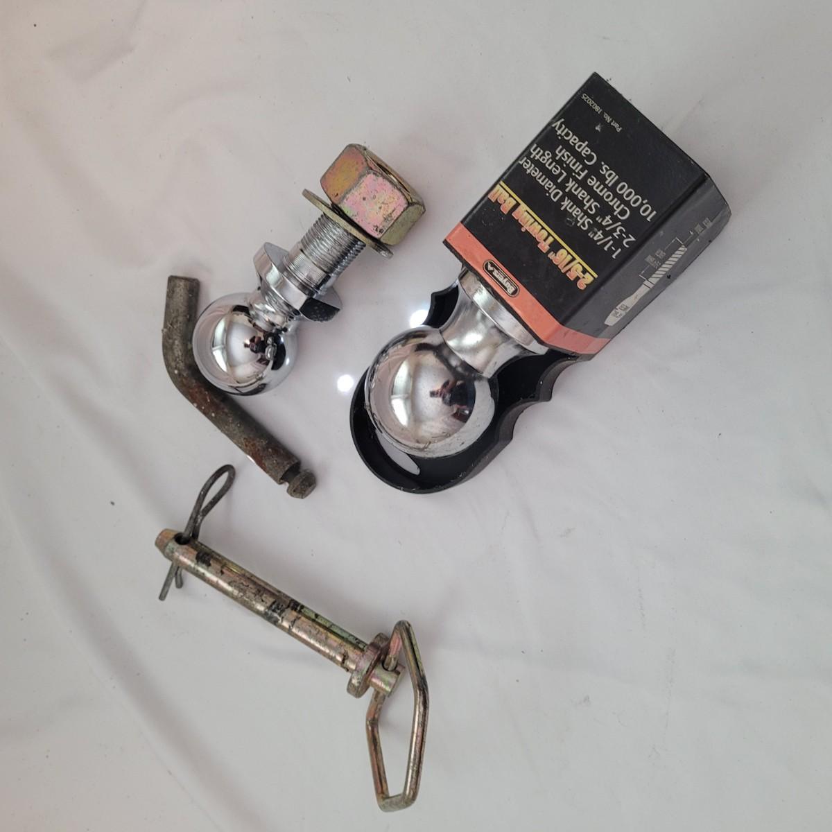 Lot of 12 tow straps and trailer hitch parts. Many different lengths, thicknesses, and types of tow straps. Brands include Miller, Task-Force, and Buyers. Two ball hitches and pins included.