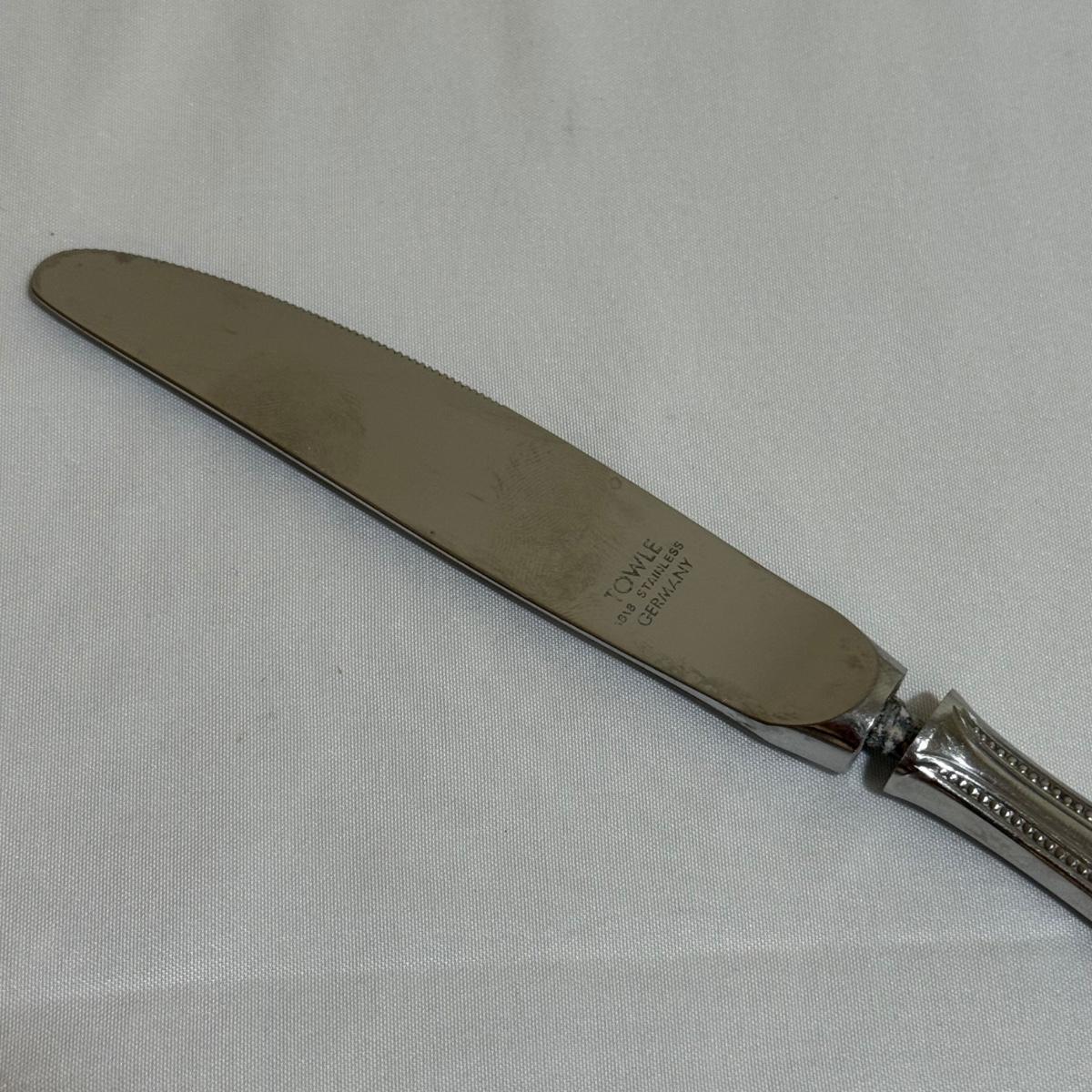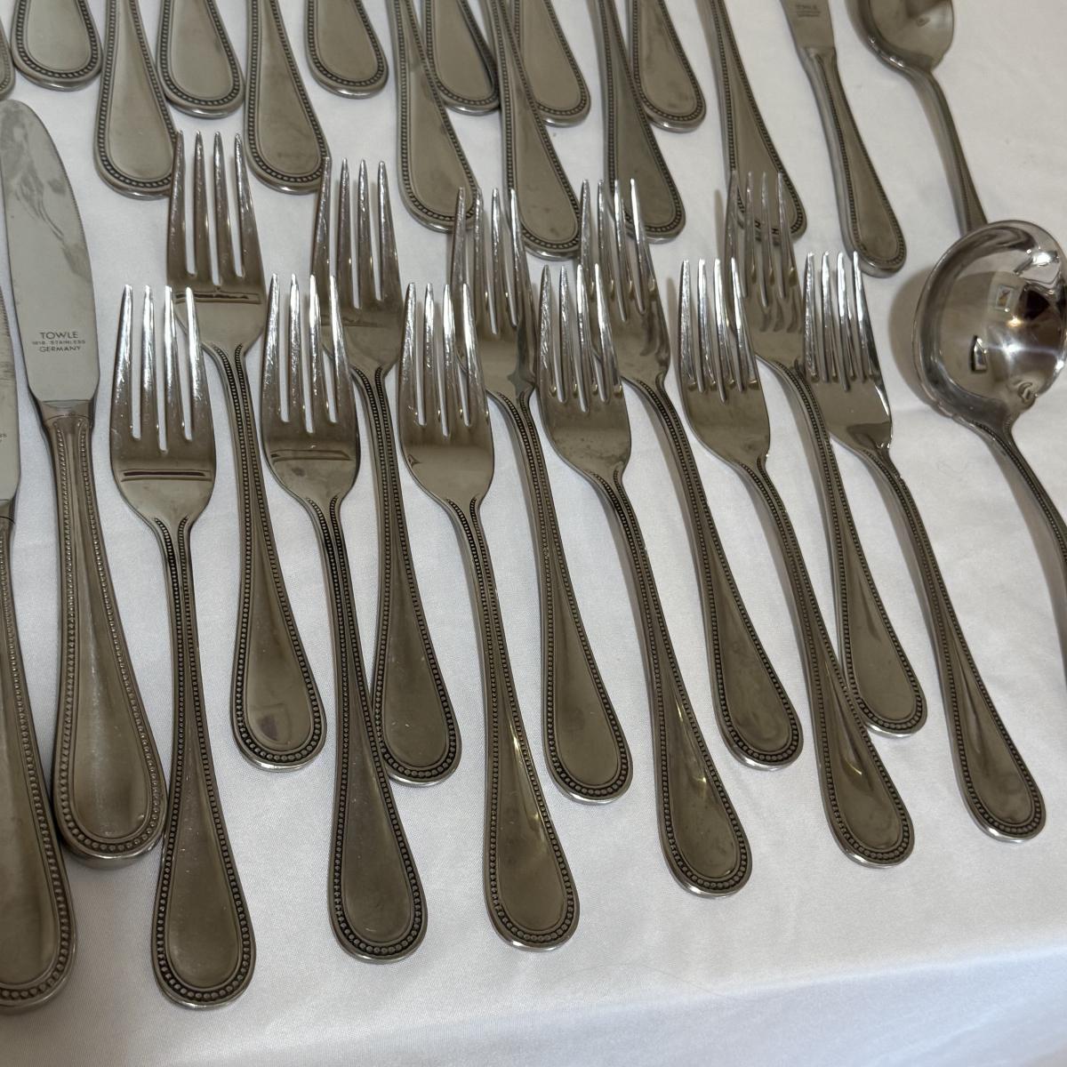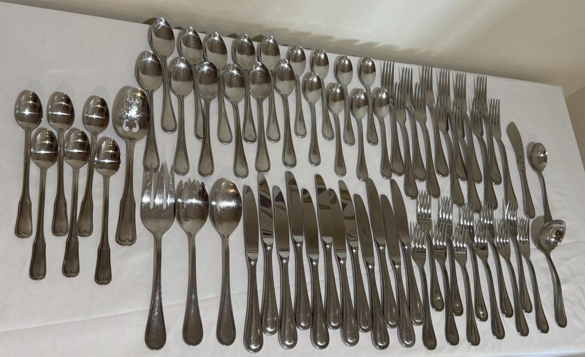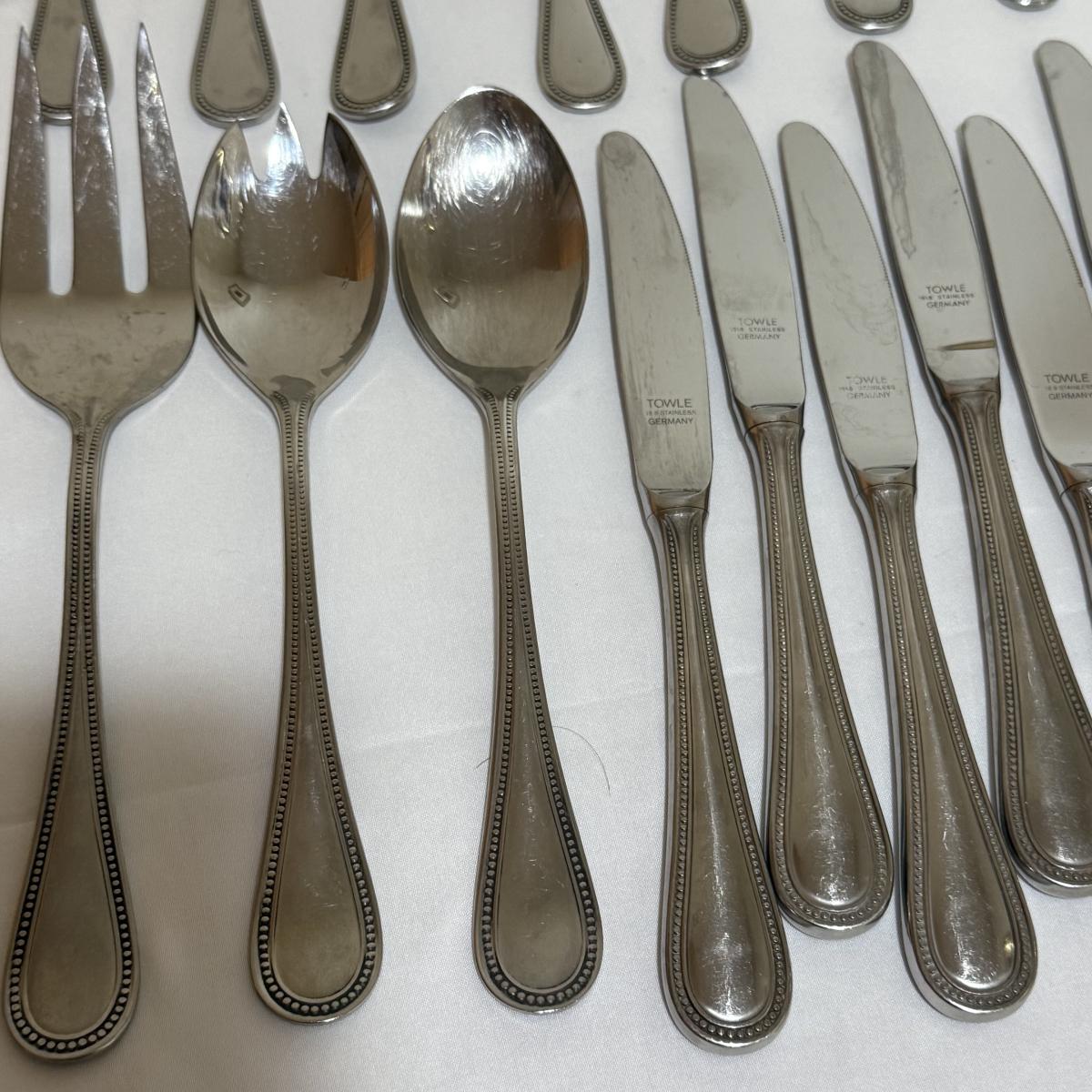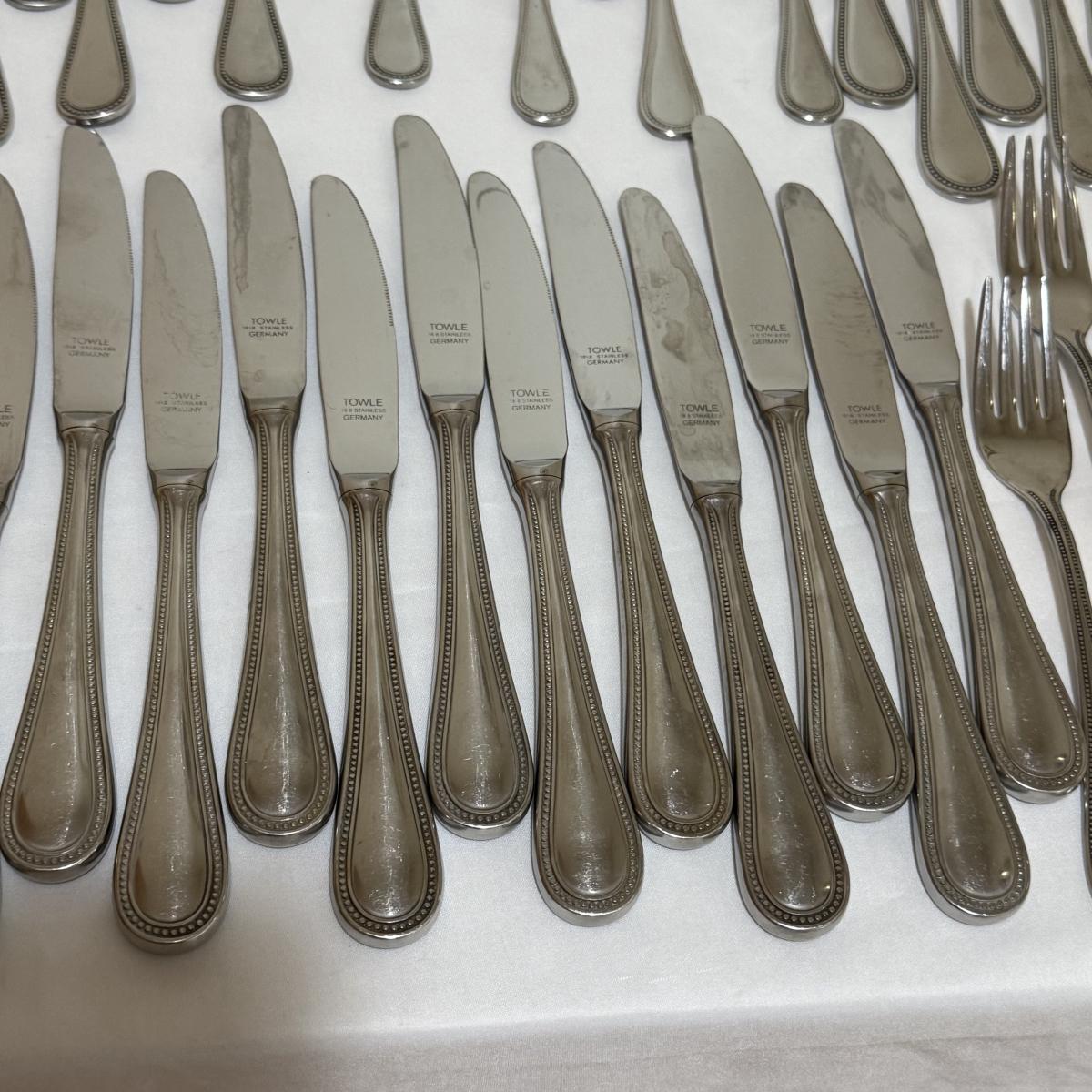 Towle brand flatware set in their Beaded Antique pattern. This set includes a five-piece place setting for eight people, plus extras. There are: 12 knives, 11 salad forks, 12 dinner forks, 11 soup spoons, eight dessert spoons, plus eight additional serving utensils. The blade is loose from the handle of one of the knives. Also included is a Towle slotted spoon and six Towle iced teaspoons of a different pattern.