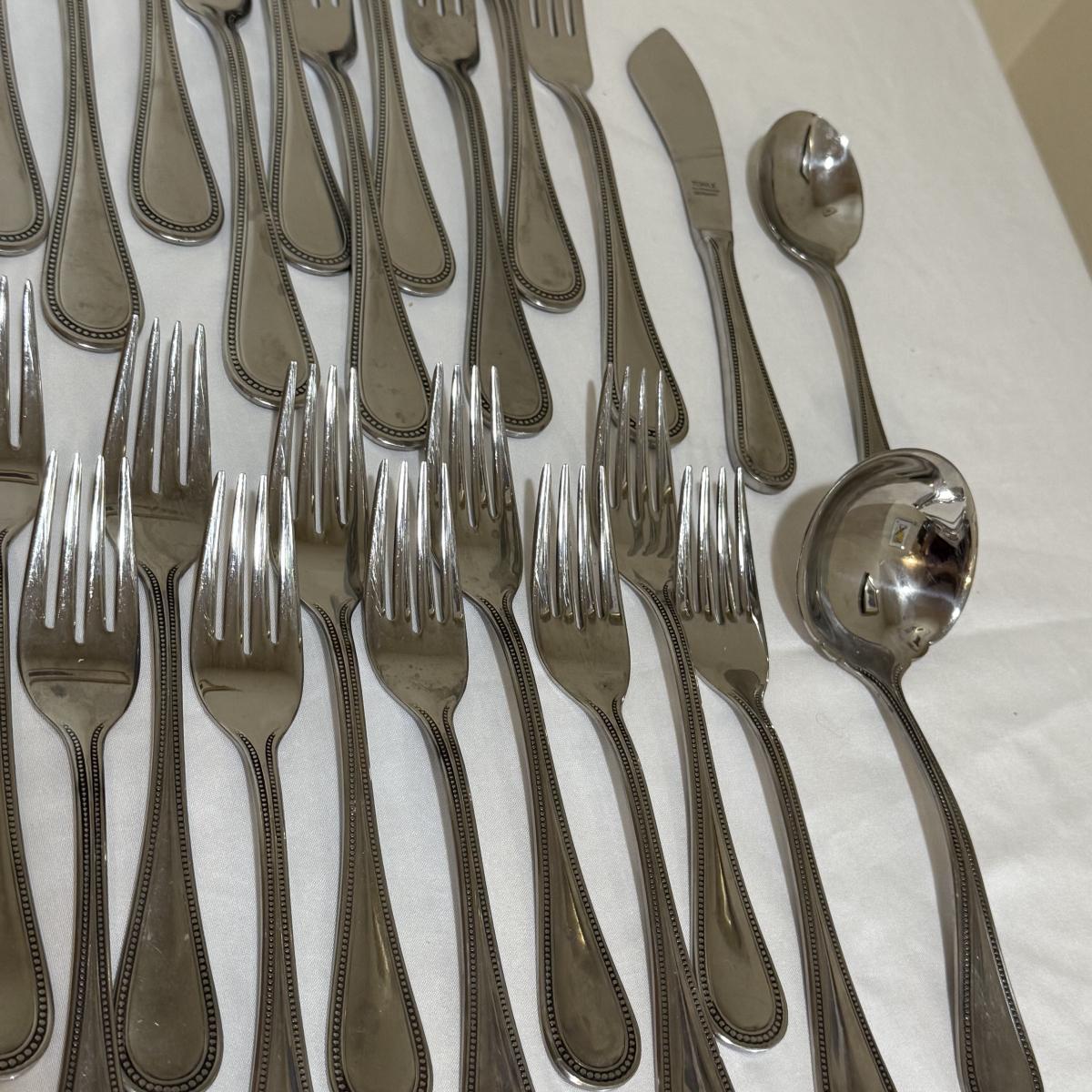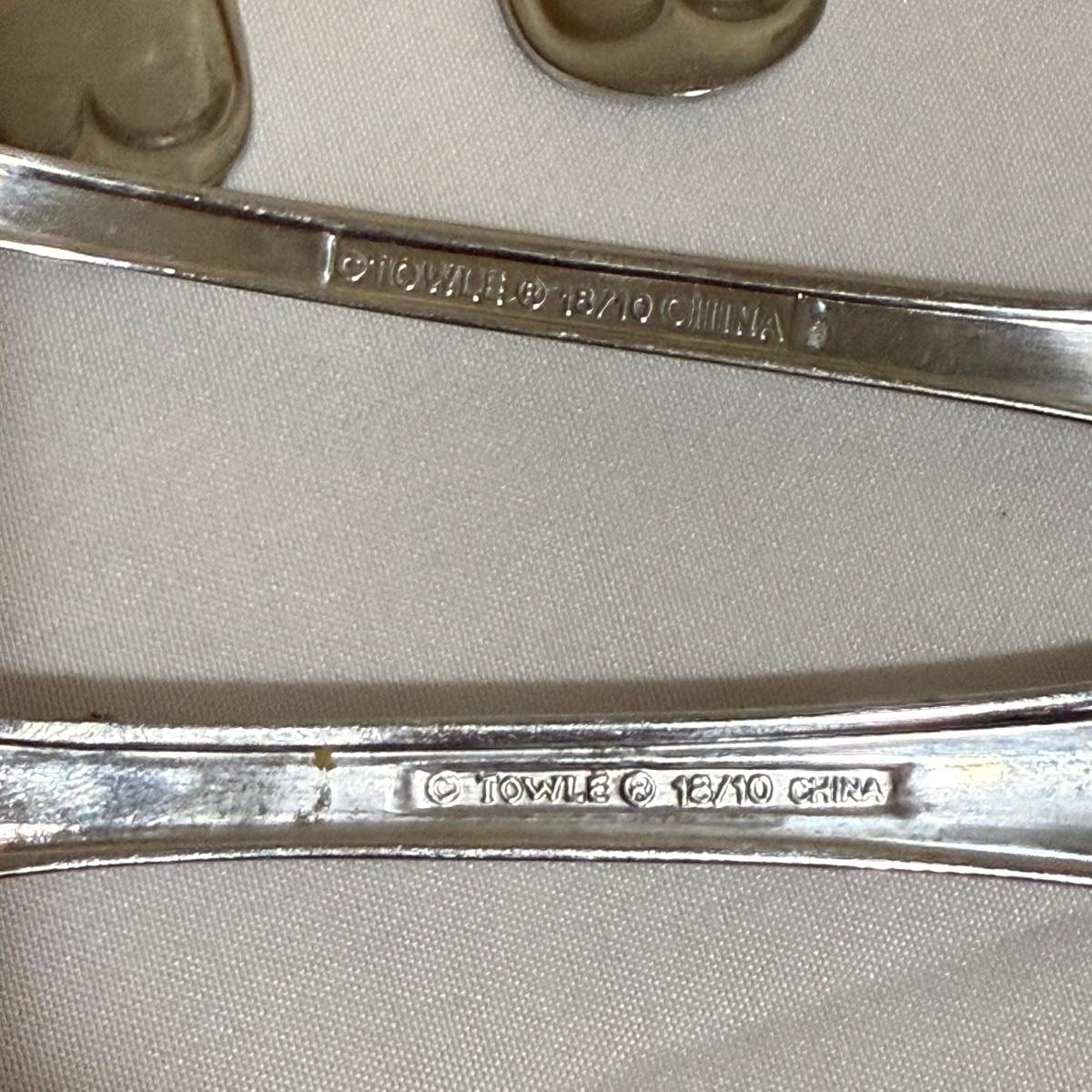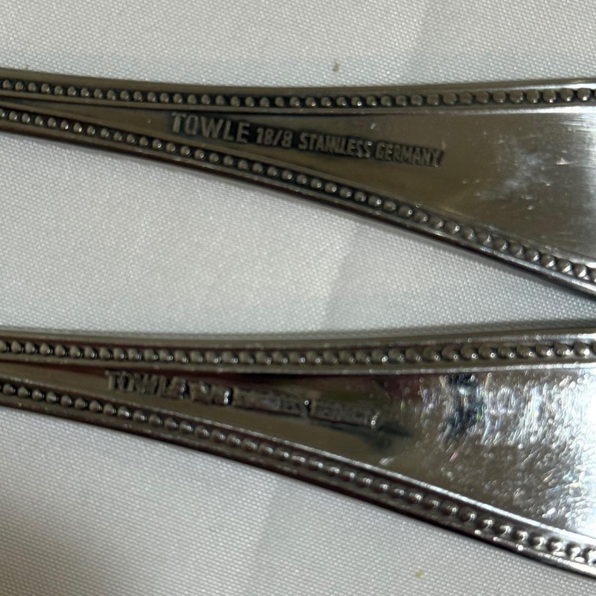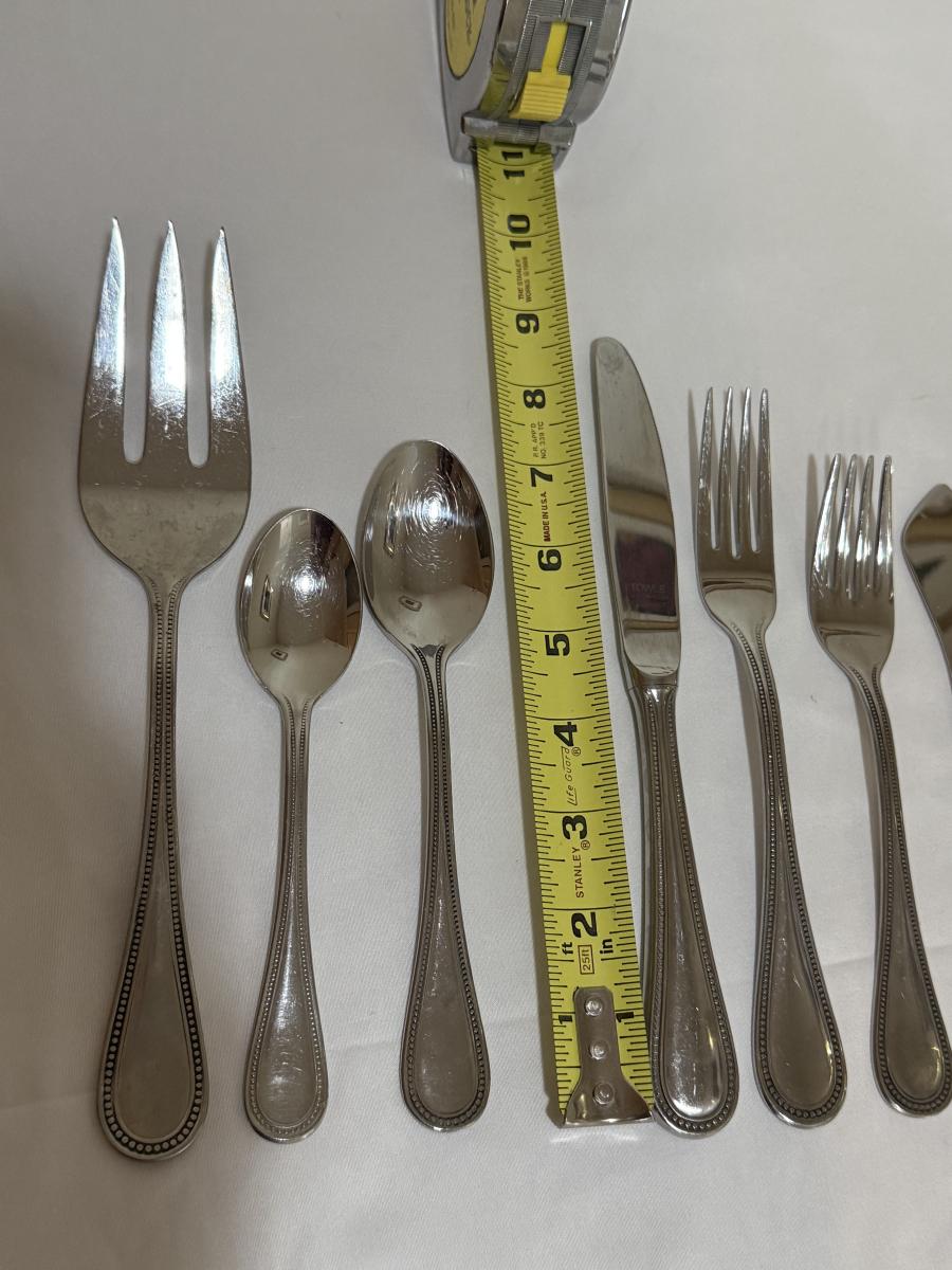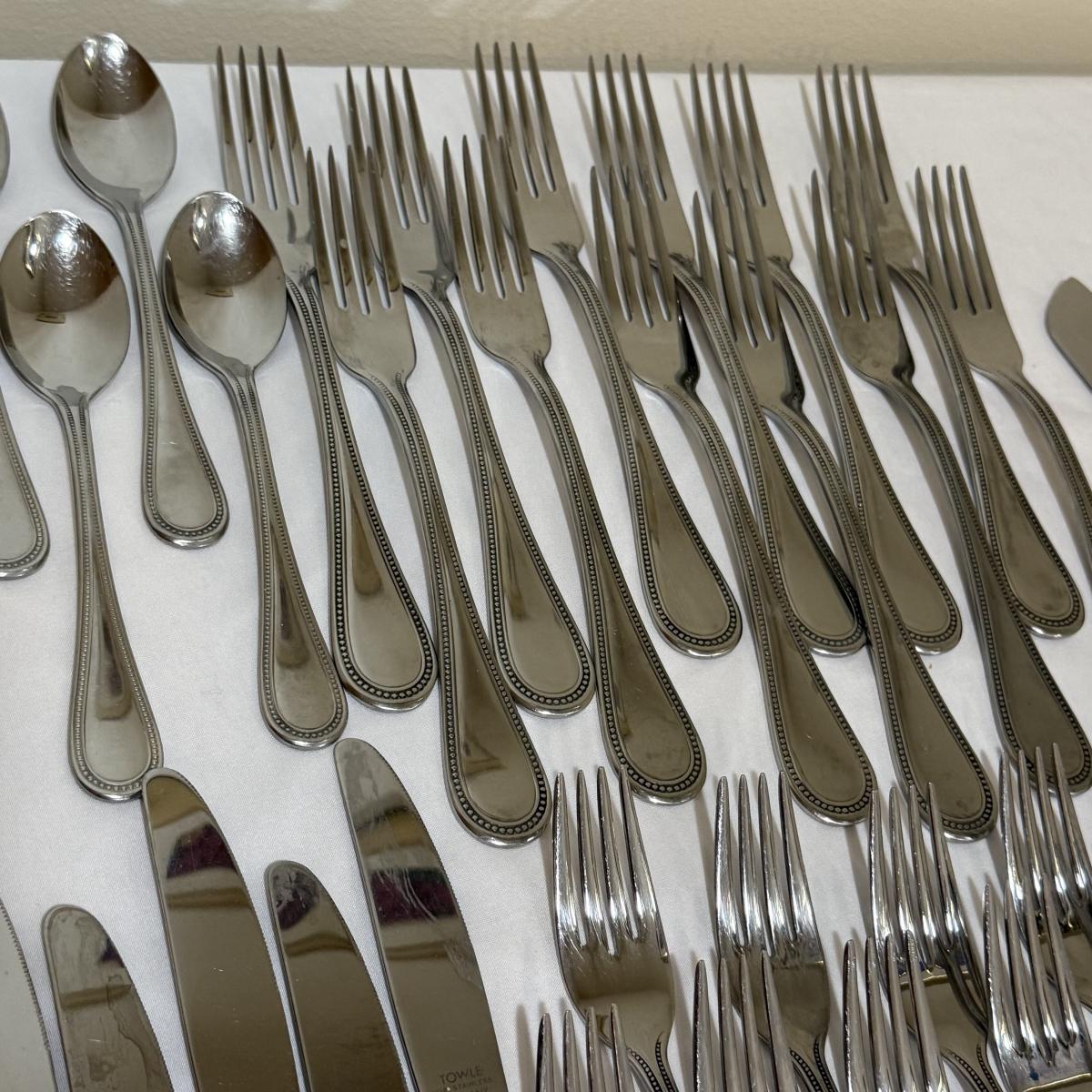 Towle brand flatware set in their Beaded Antique pattern. This set includes a five-piece place setting for eight people, plus extras. There are: 12 knives, 11 salad forks, 12 dinner forks, 11 soup spoons, eight dessert spoons, plus eight additional serving utensils. The blade is loose from the handle of one of the knives. Also included is a Towle slotted spoon and six Towle iced teaspoons of a different pattern.