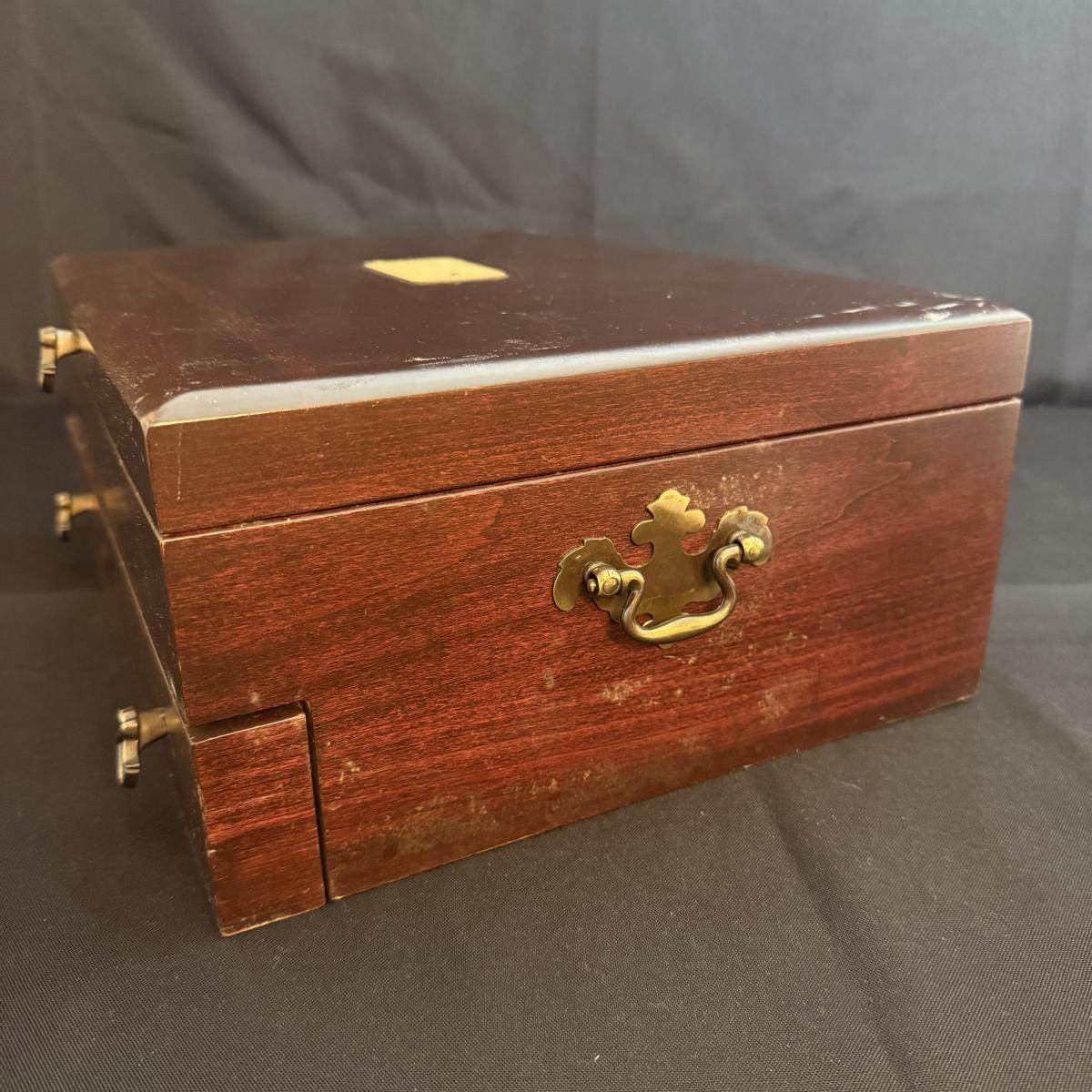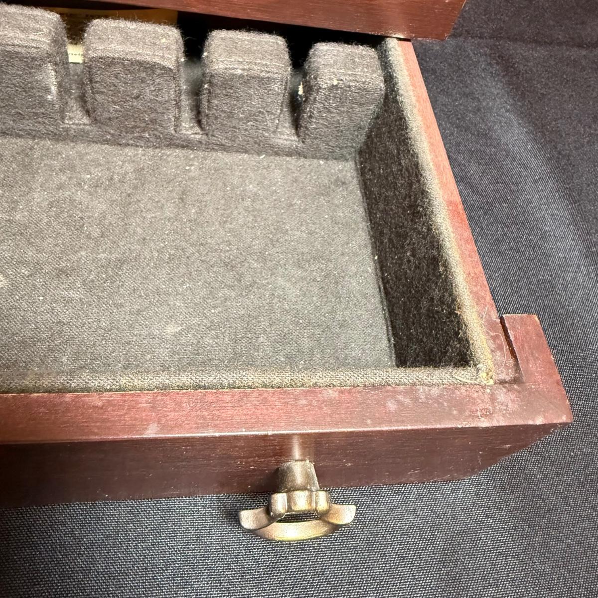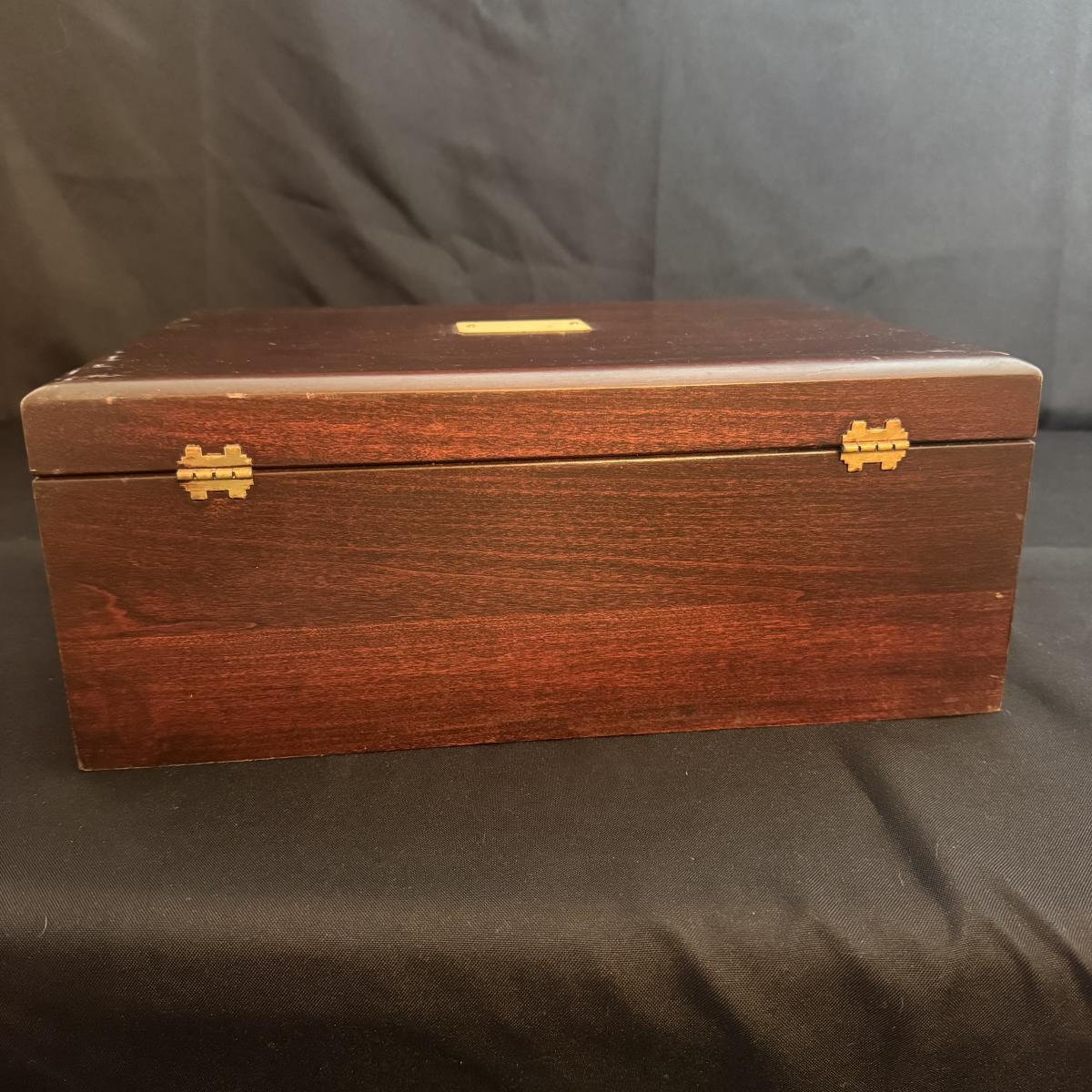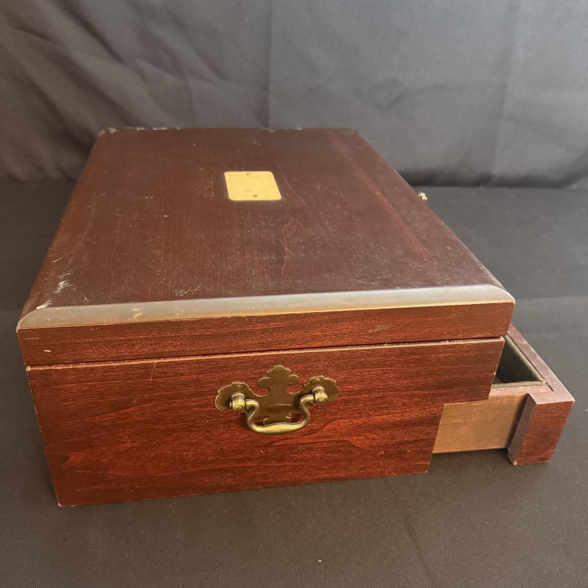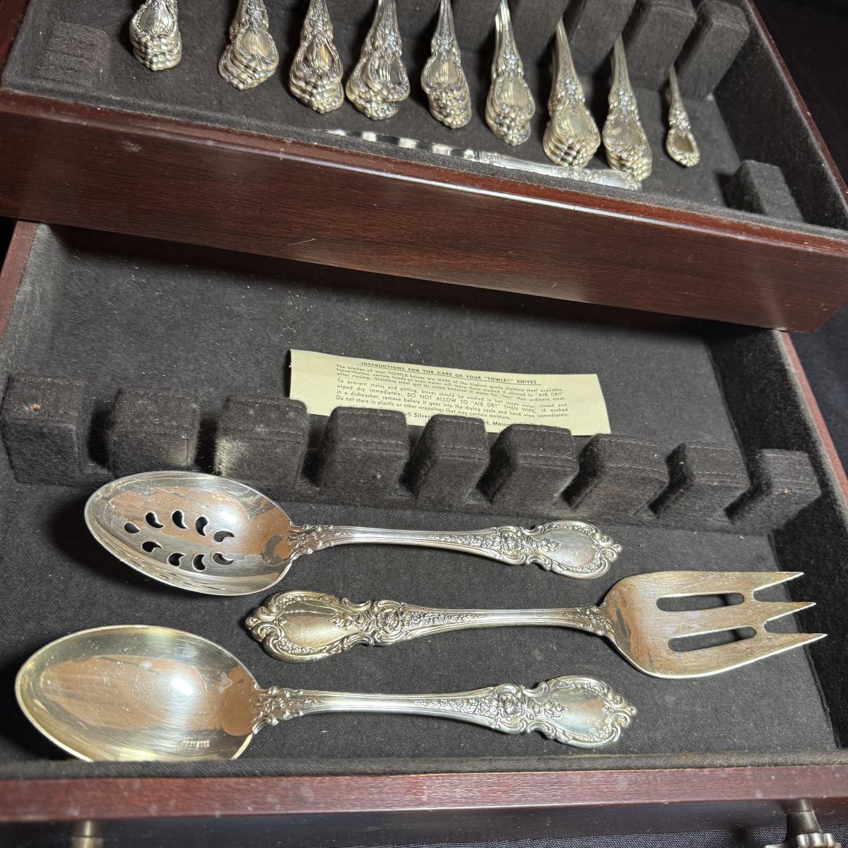 Lovely set of Towle sterling silver flatware in their ‘Charlemange’ pattern, comes in a protective wooden case lined with Hagerty Silversmiths’ Cloth, according to the label. The sterling set is a complete five-piece set for eight people, including eight of each of the following: dinner knives, teaspoons, soup spoons, salad forks, and dinner forks. There are five serving utensils with the set as well. Set appears to be very well polished with just a small amount of tarnishing seen. Wooden case is 15” x 12” x 6”H. It shows wear on the exterior with various scuffs and scratches.