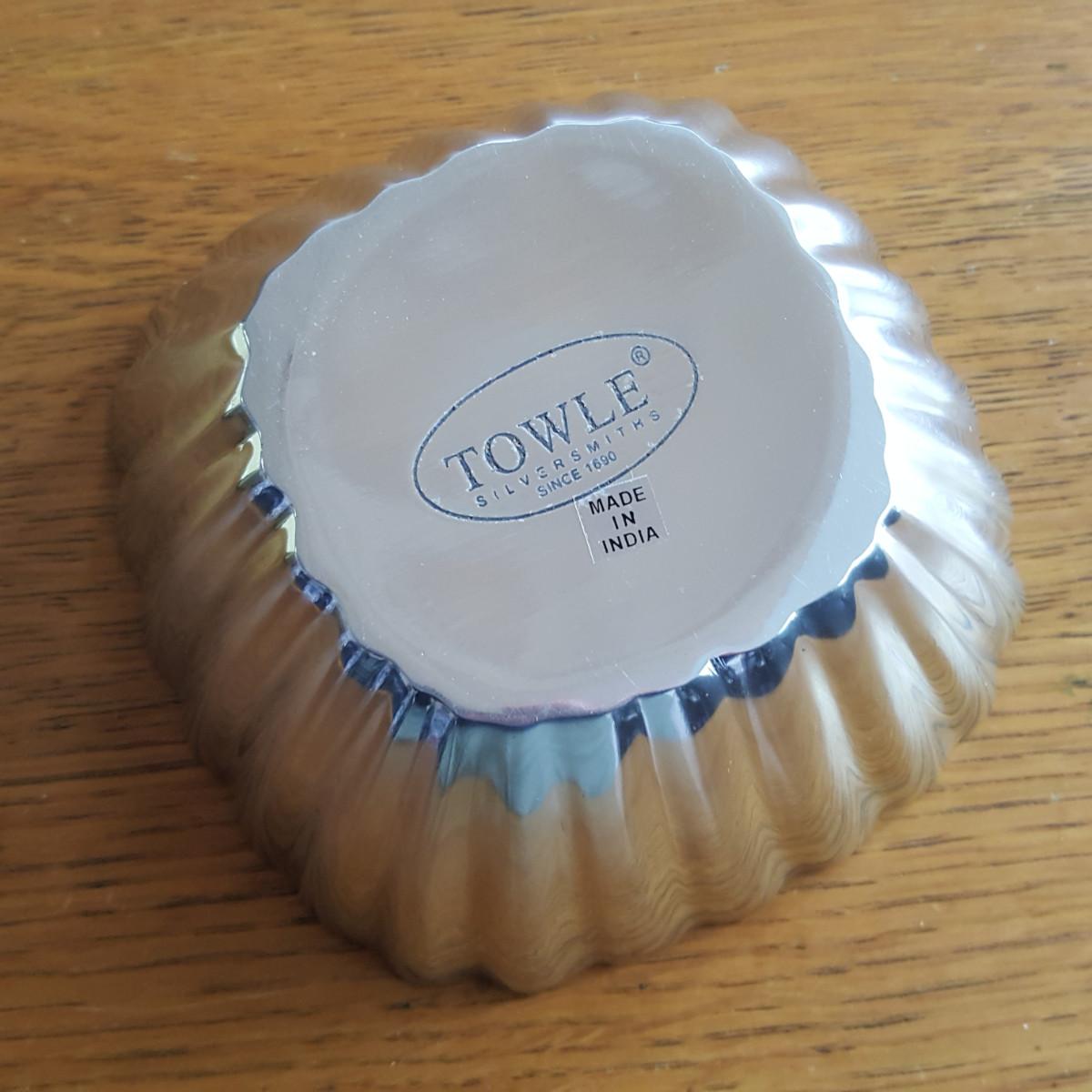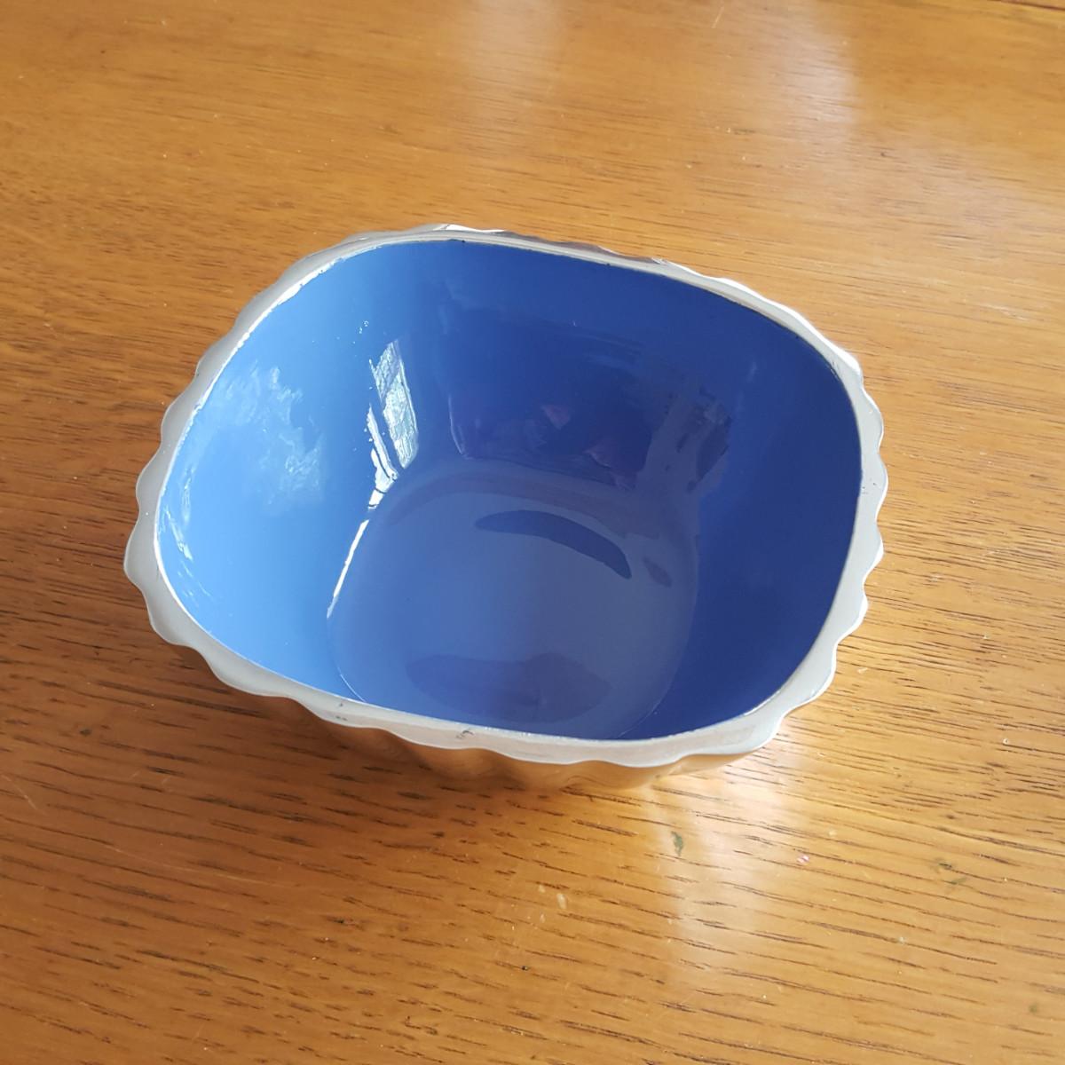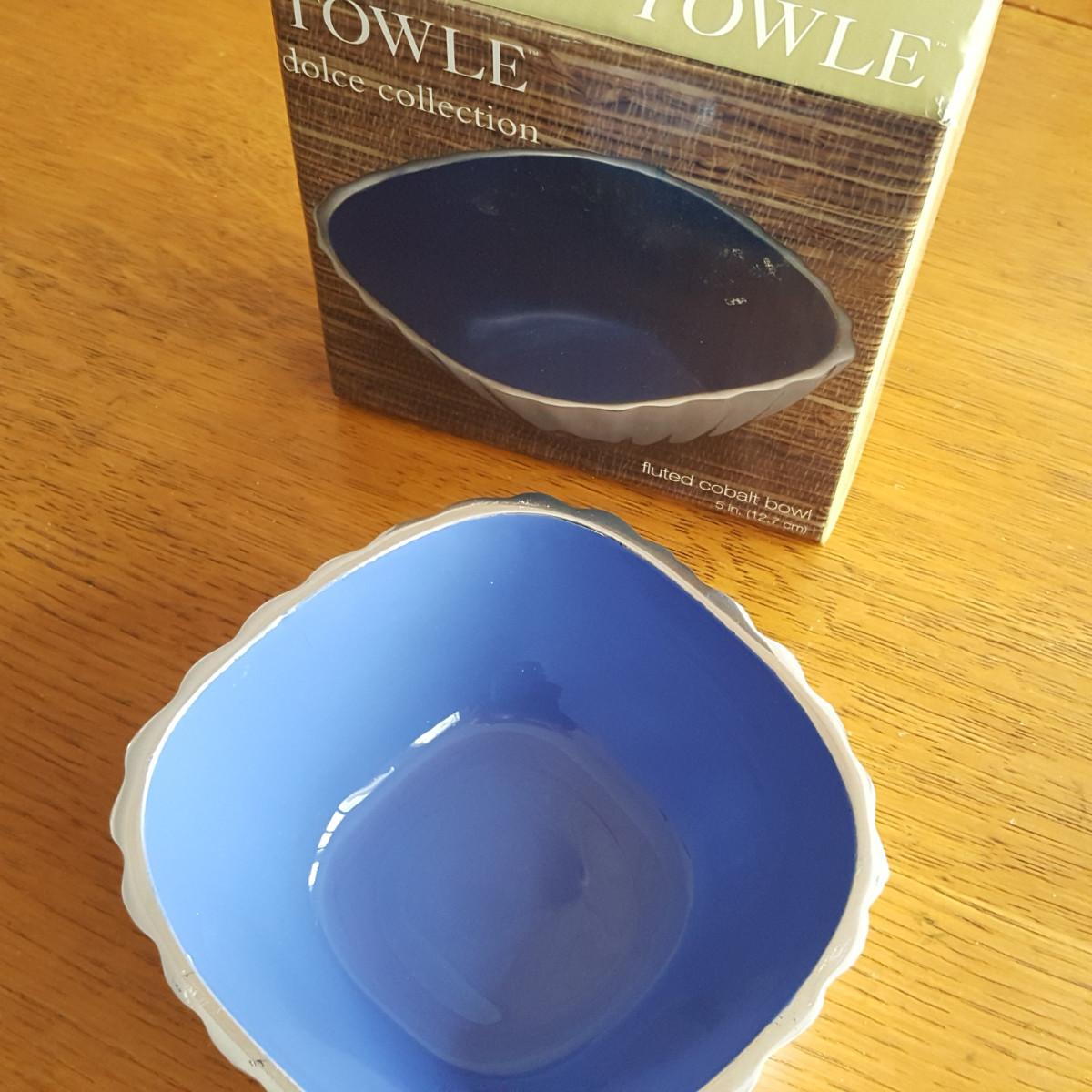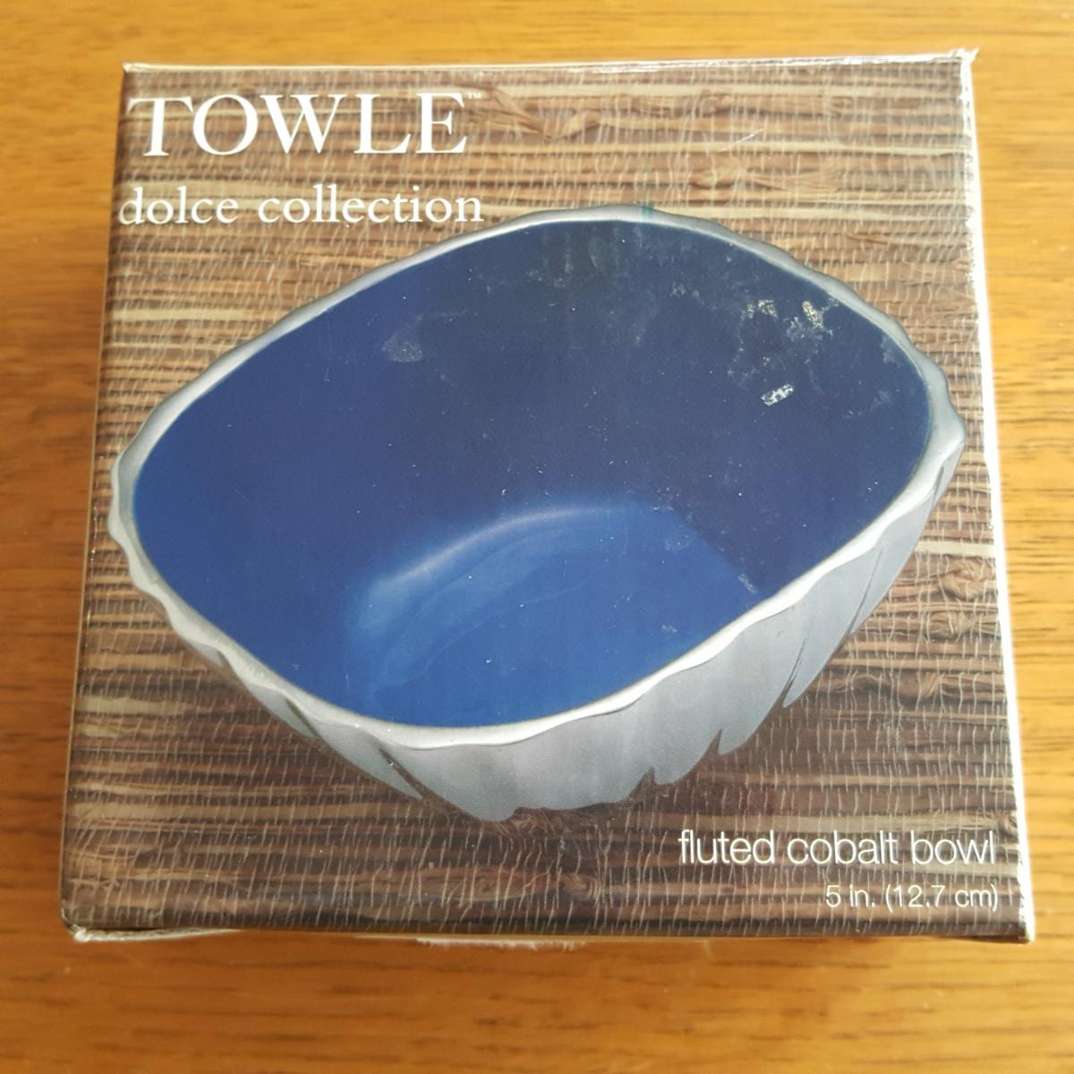 This auction lot is for a new, inbox Towle Fluted Cobalt Bowl. The bowl is sand-cast in aluminum with a whimsical fluted edge, accented with a hand-painted cobalt blue interior. Measures about 5-inches square. A nice bowl for gifting, getting or serving your favorite trail mix.