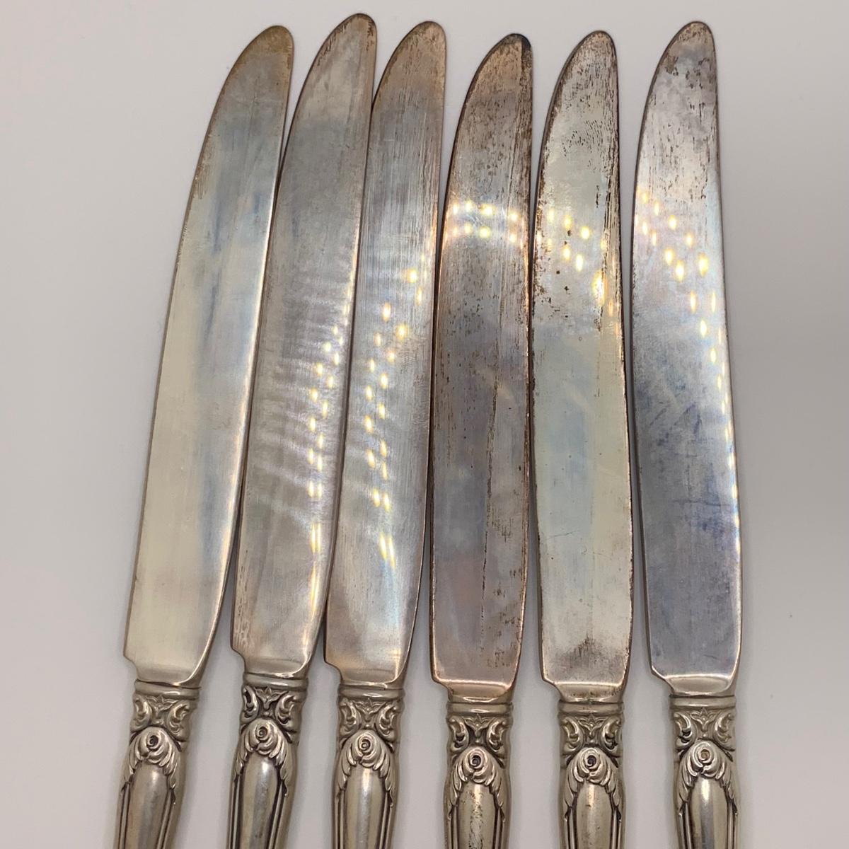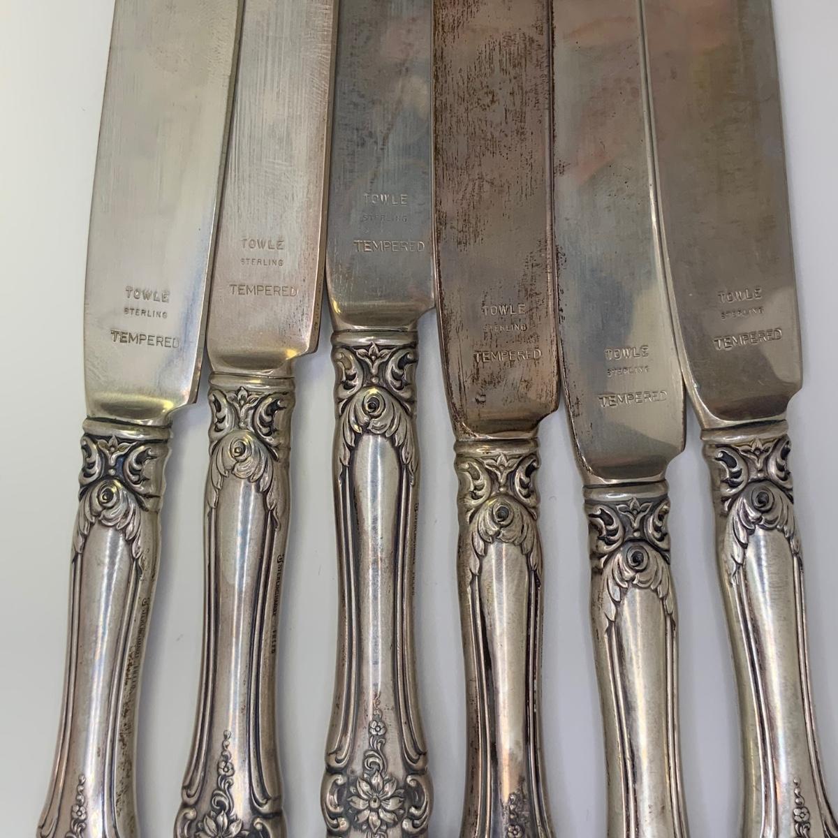 Six knives and six forks of Towle brand Sterling silver flatware in their ‘Old Master’ pattern. Items have some tarnishing. They have been stored in paper-based silver cloths, and knives wrapped in tissue paper, which are included. The cloths are still intact, but quite worn.