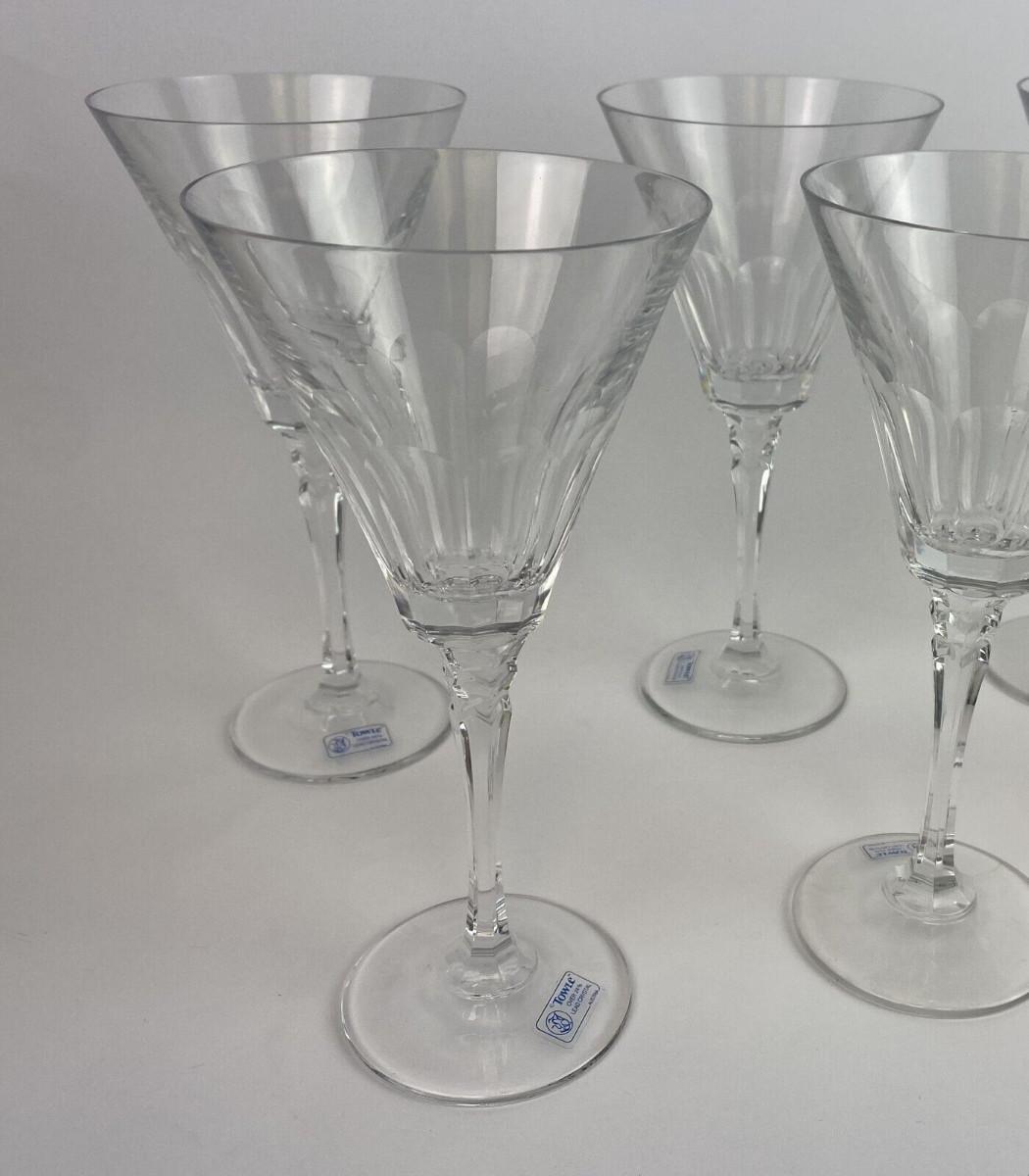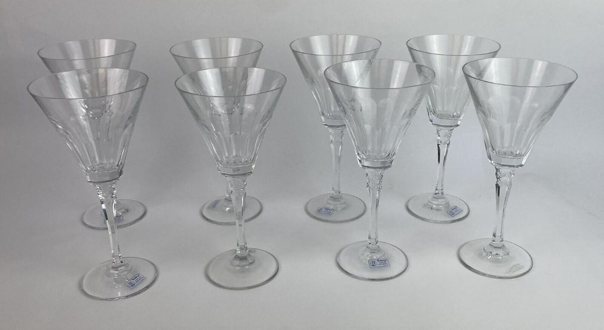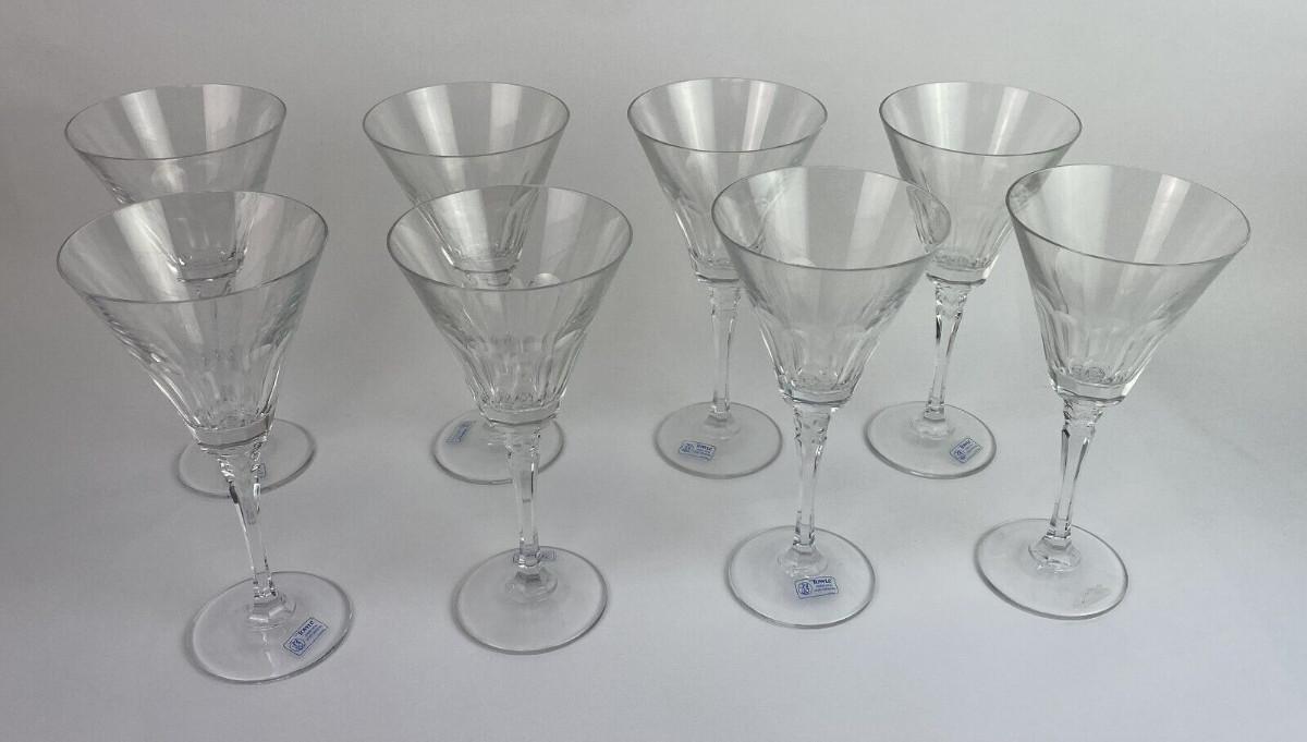 With no sign of use..retaining their original labels here are a set of eight(8) blown glass stemware Wine Glasses from the Reflections line of Austrian made Lead Crystal by Towle..Discontinued circa 1982...Features 12 thin cut panels on bowl...as shown...7 1/2 inches tall...