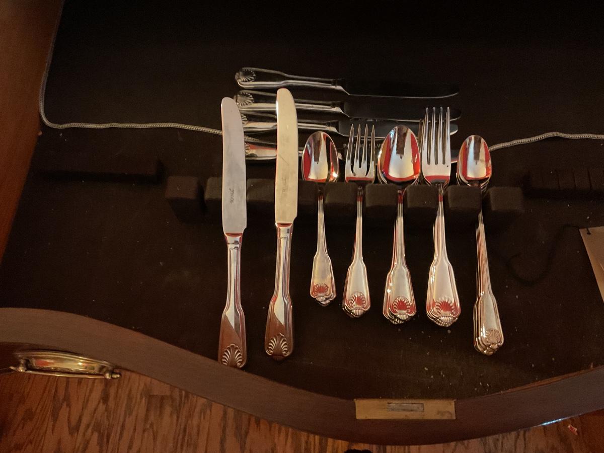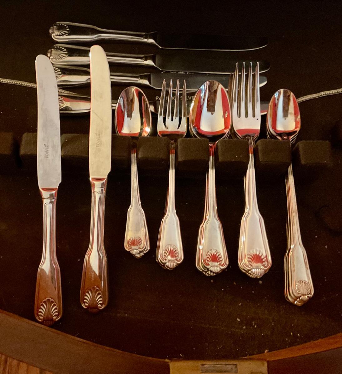 Towle , Boston Shell silver plated flatware, 36 piece service for 6, teaspoon, soup spoon, iced tea spoon, knife, salad and dinner fork