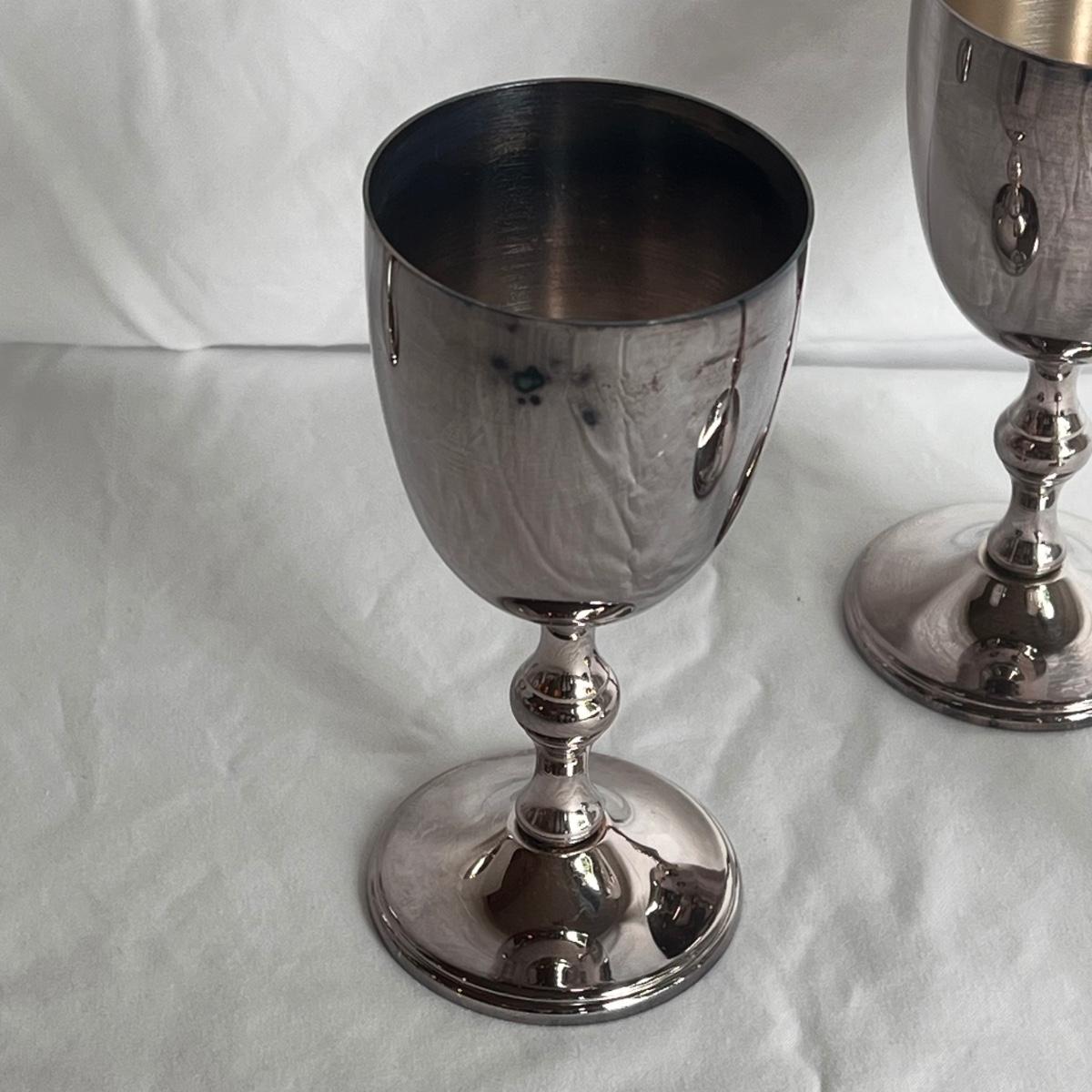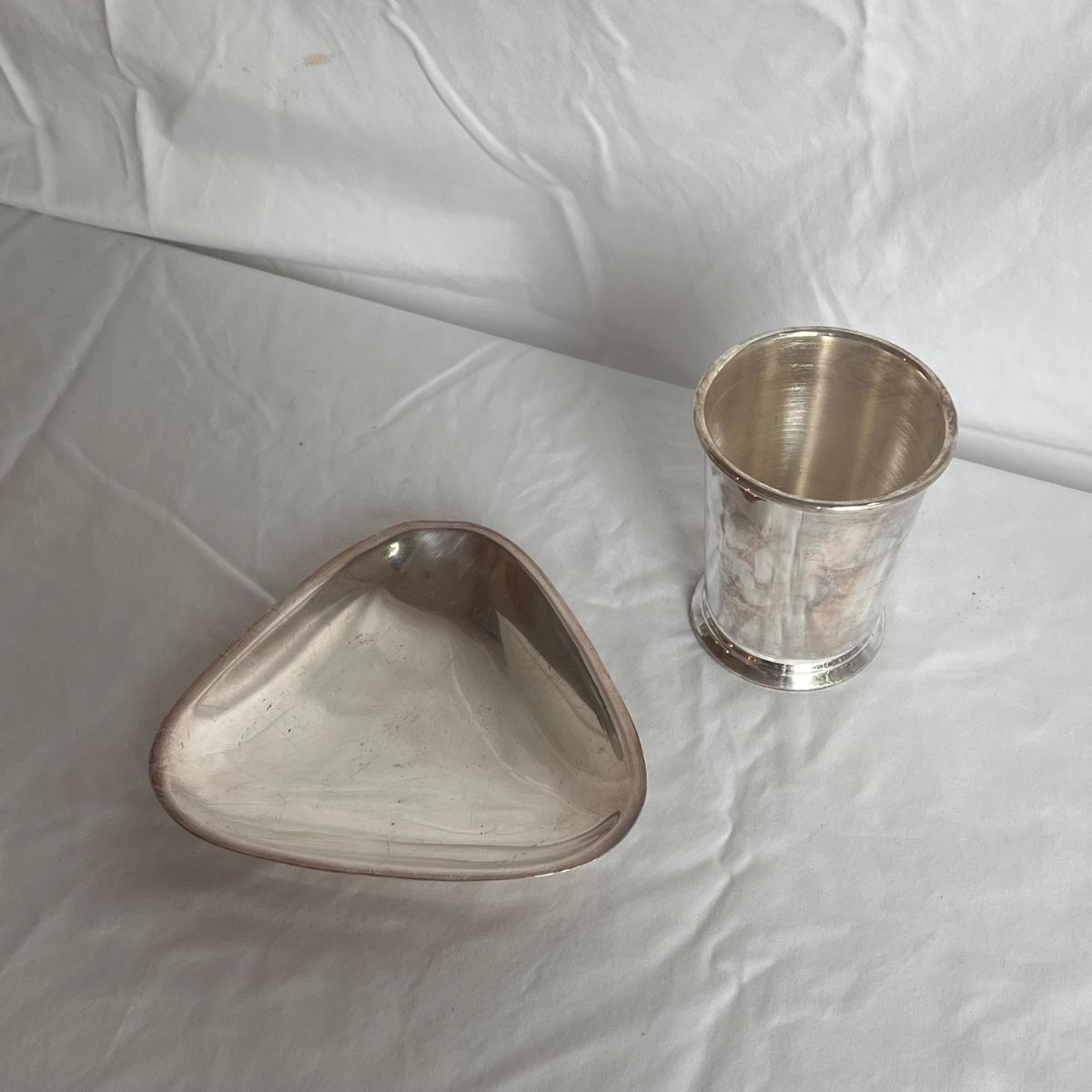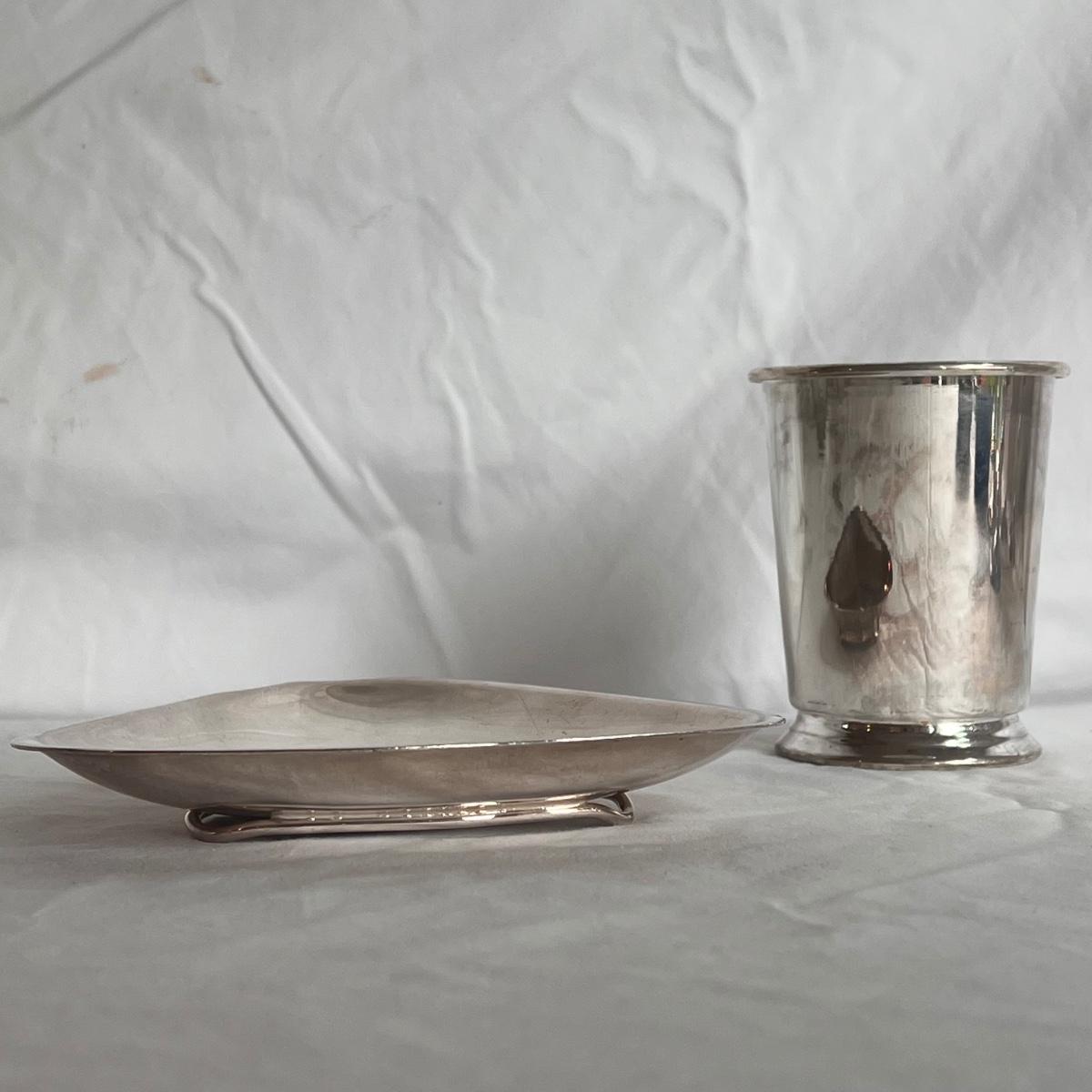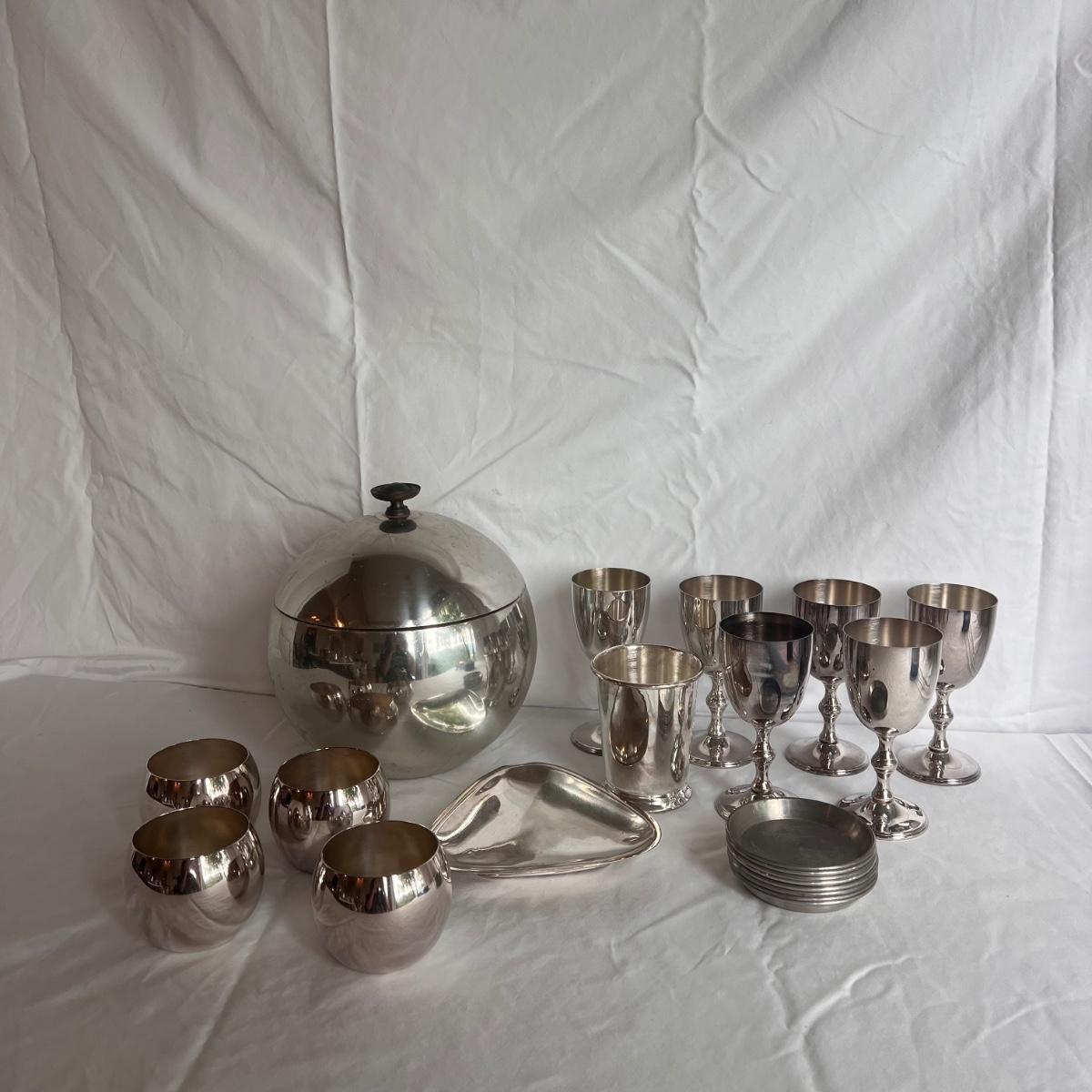This lot of silver includes four Towle Jefferson style cups, one Fisher tray, one Sheridan cup, eight Towle pewter coasters, one silver ice bucket with a Pyrex insert, and six W&S Blankinton wine glasses. All items are in great condition, despite tarnish from wear - see pictures included. The ice bucket measures 8” x 6.25”H. The coasters measure 4”D x .5”H. Shipping available.