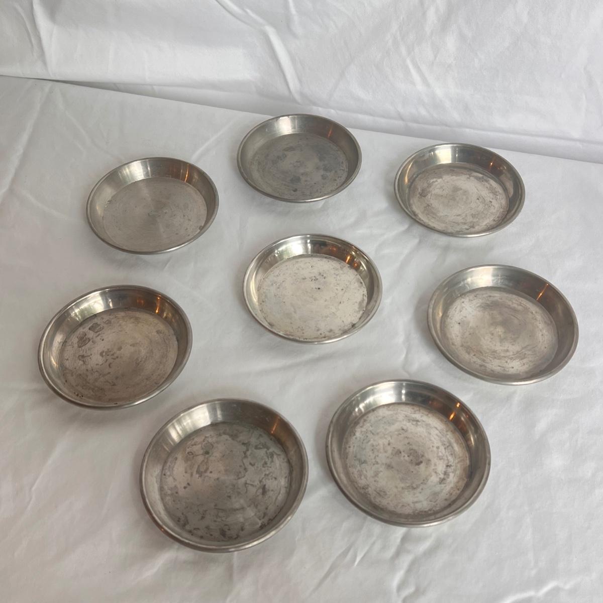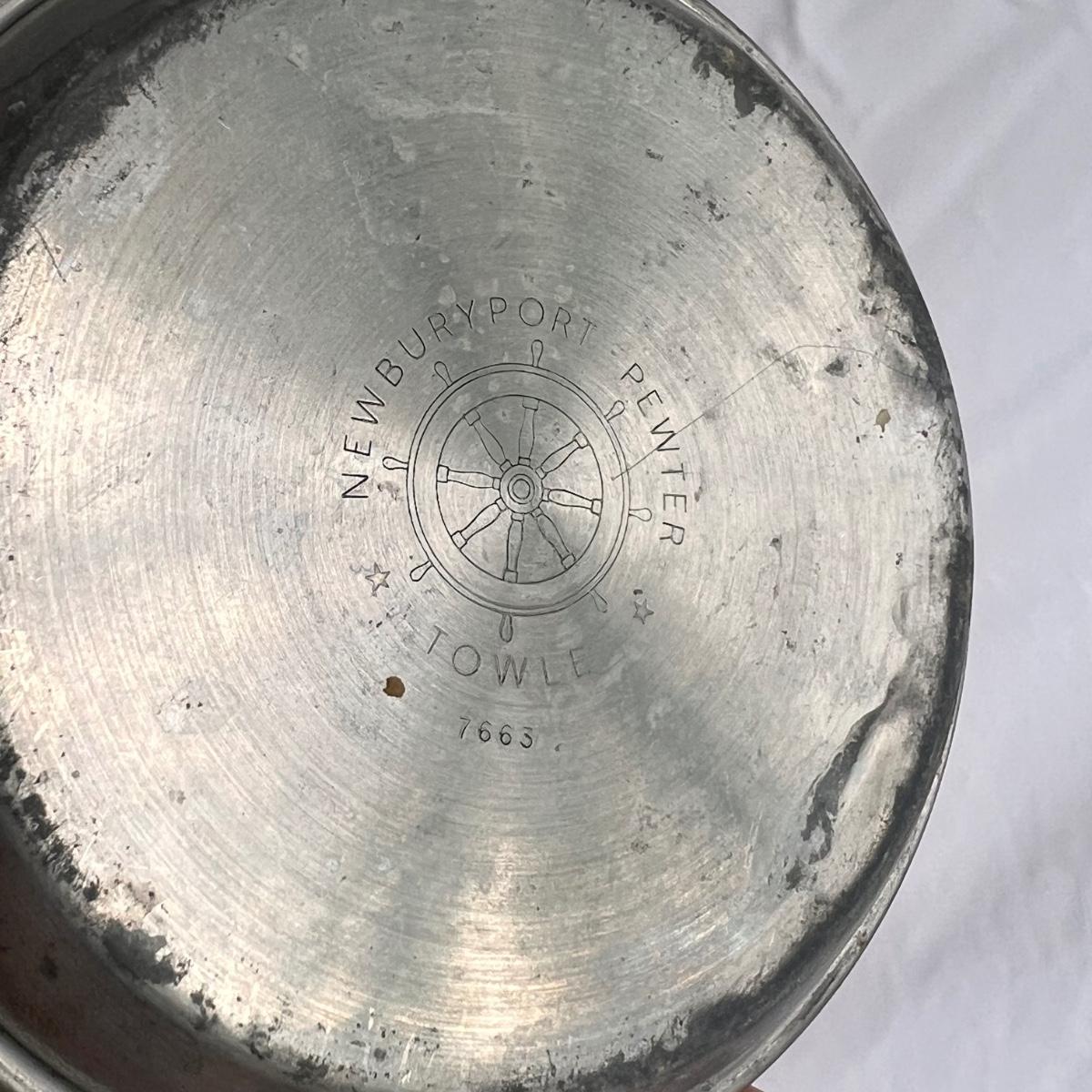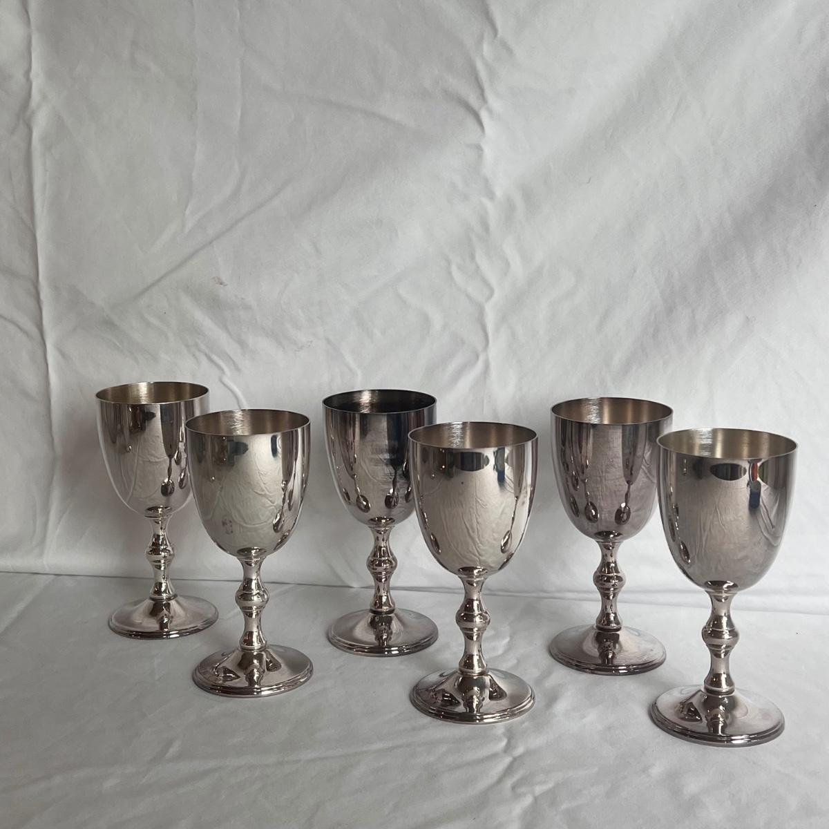 This lot of silver includes four Towle Jefferson style cups, one Fisher tray, one Sheridan cup, eight Towle pewter coasters, one silver ice bucket with a Pyrex insert, and six W&S Blankinton wine glasses. All items are in great condition, despite tarnish from wear - see pictures included. The ice bucket measures 8” x 6.25”H. The coasters measure 4”D x .5”H. Shipping available.