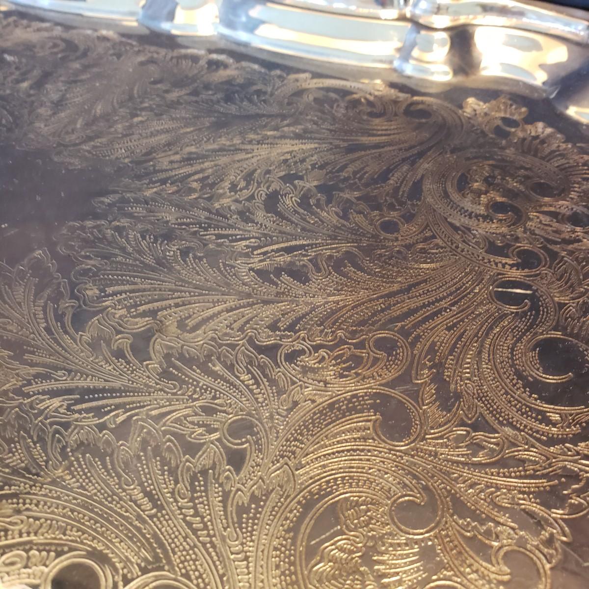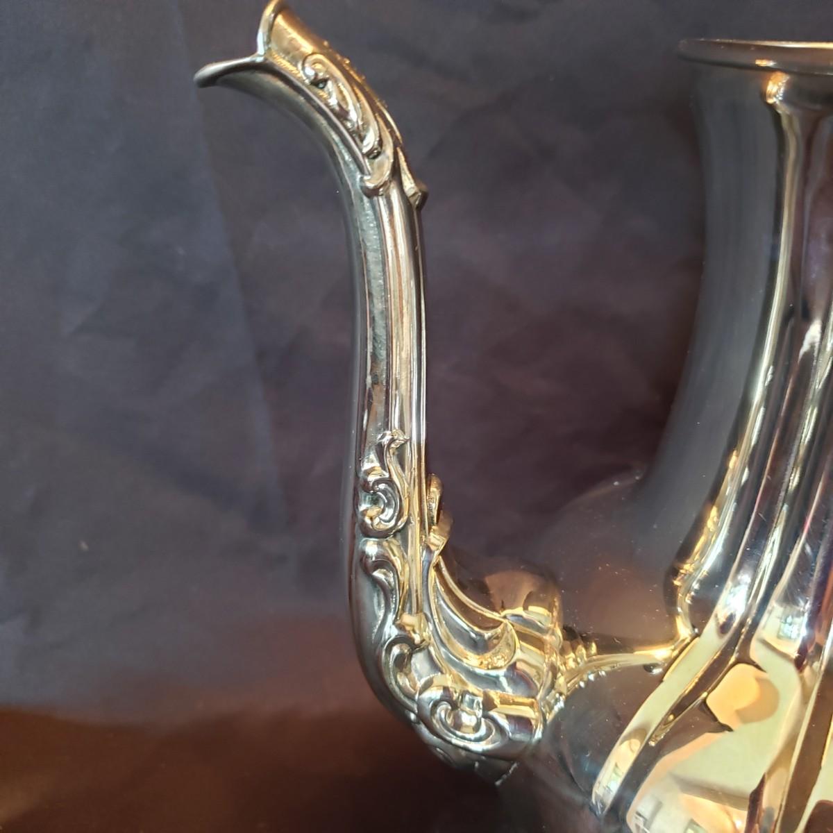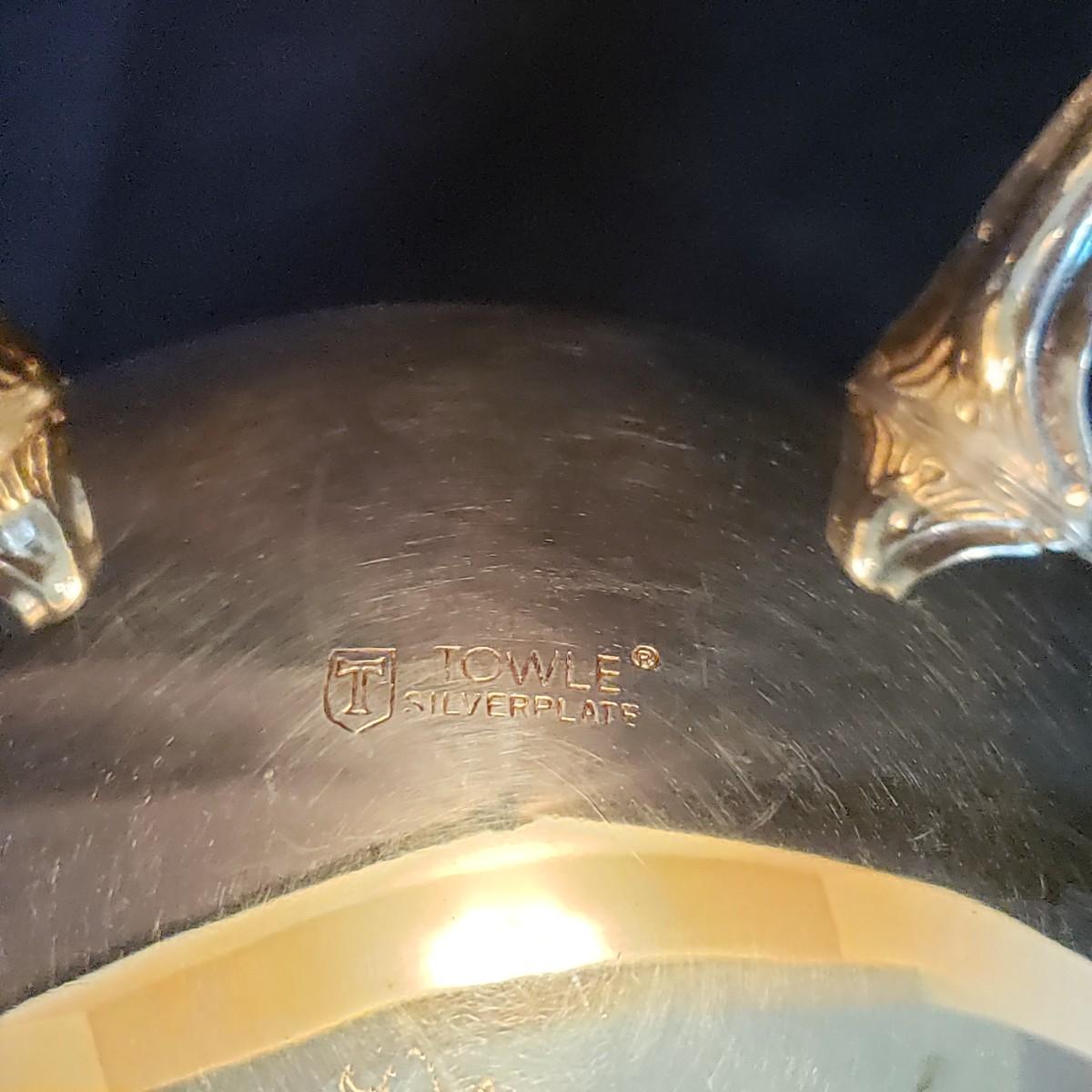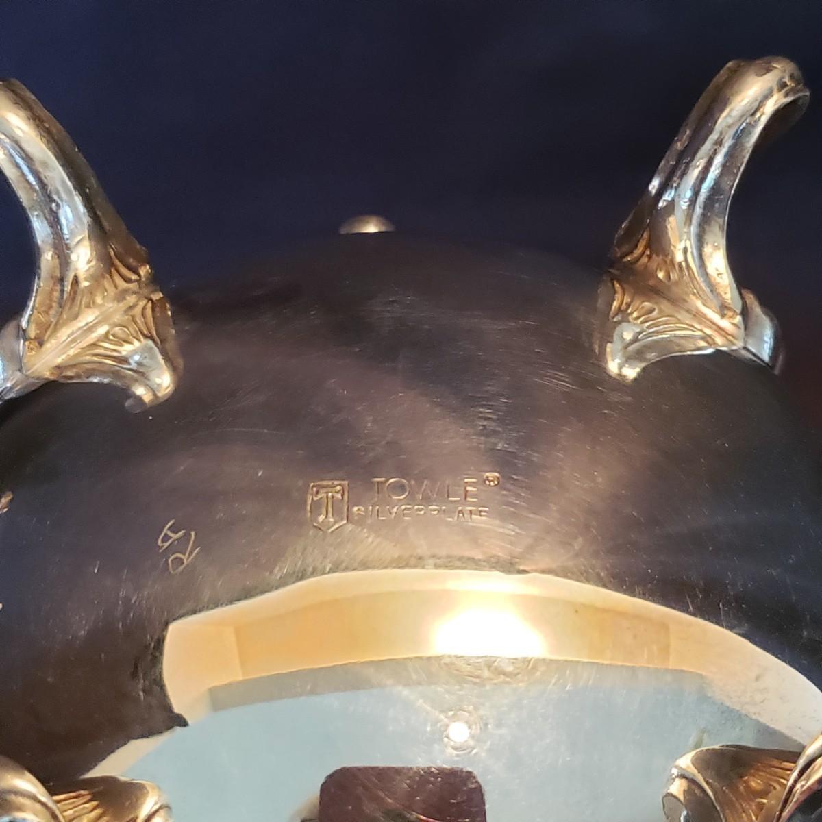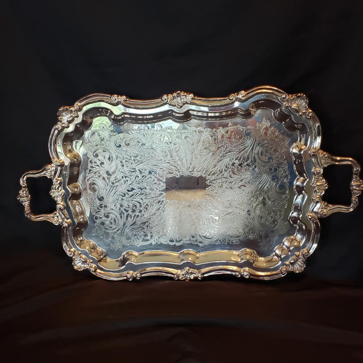 This is a silver plated tea set and tray by Towle. The tray is heavy and measures 25" x 14" x 2"H. It has a swirl paisley engraving style print on the top. The largest tea pot measures 10" x 6" x 11"H. This pot is also on the heavier side. The other tea pot measures 10" x 6" x 10"H. The sugar bowl and creamer measure approximately 7" x 4" x 7"H.