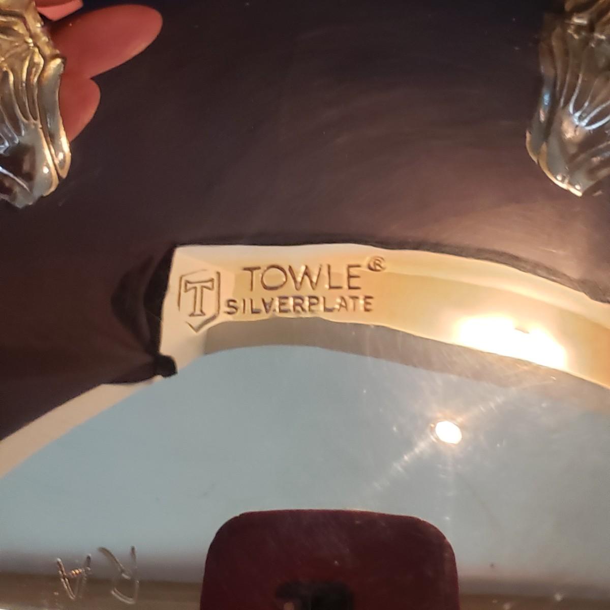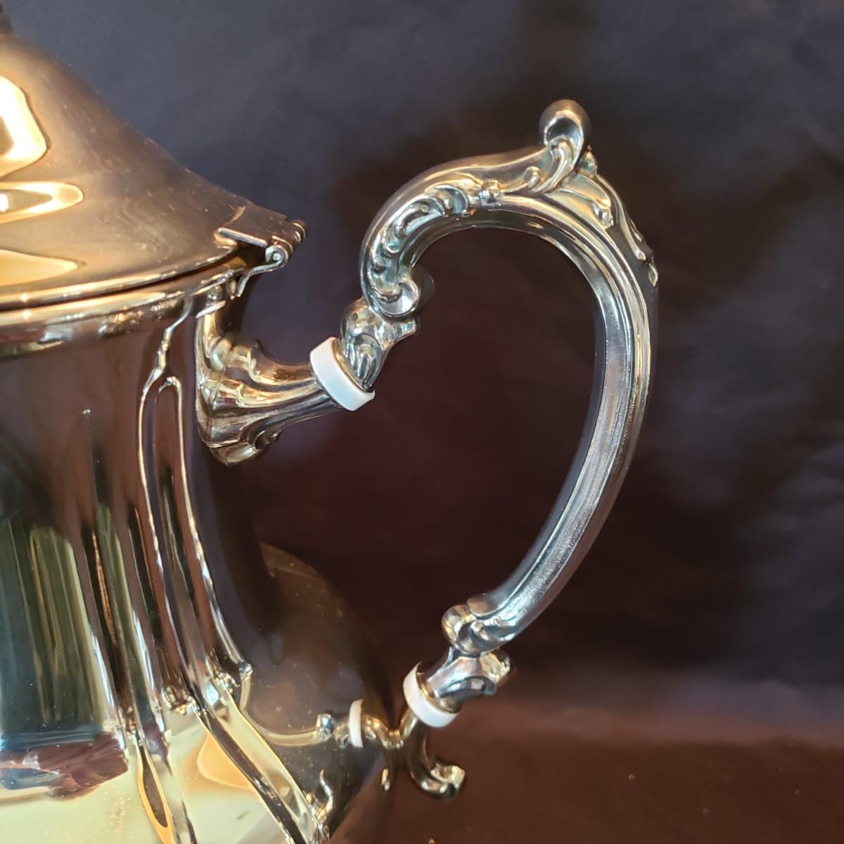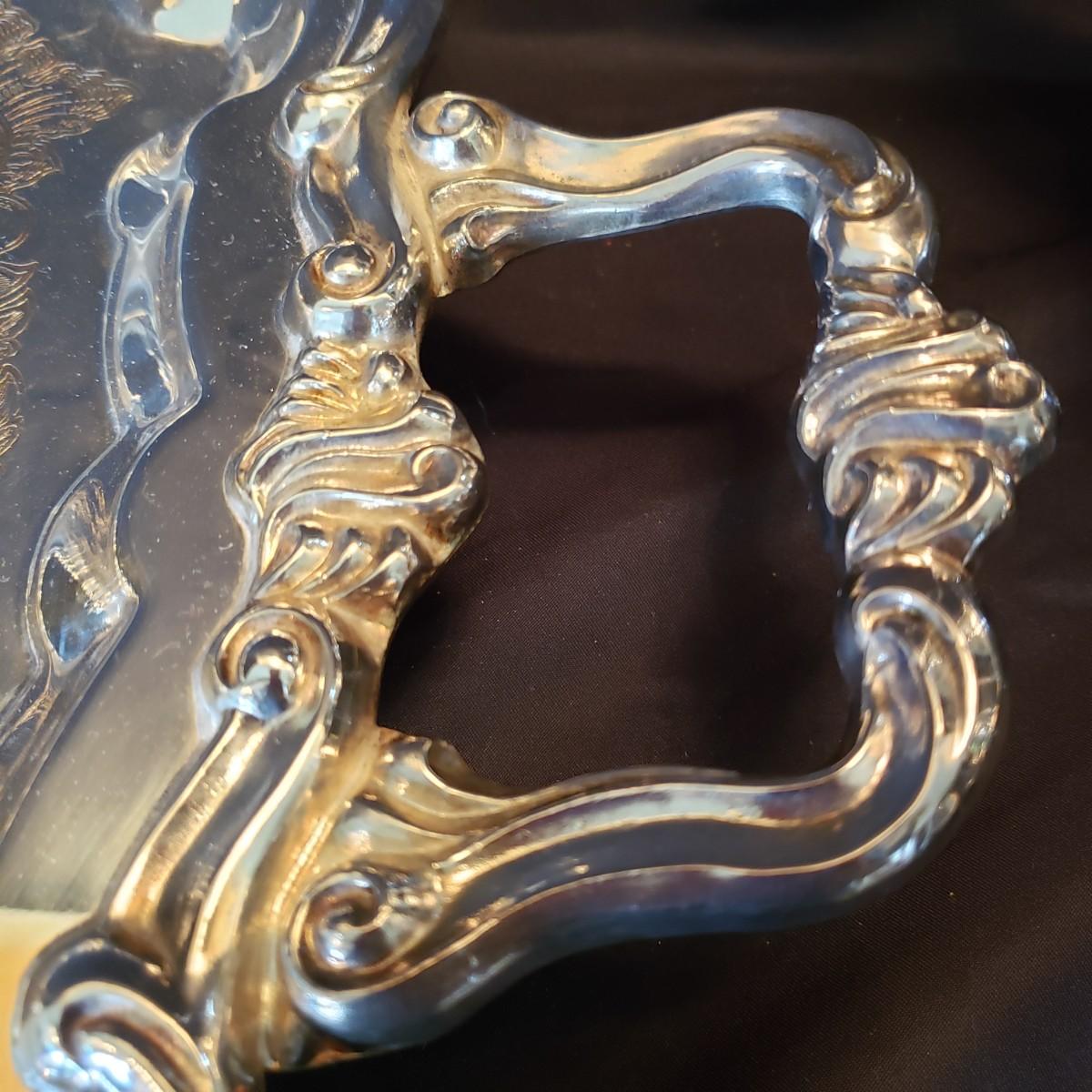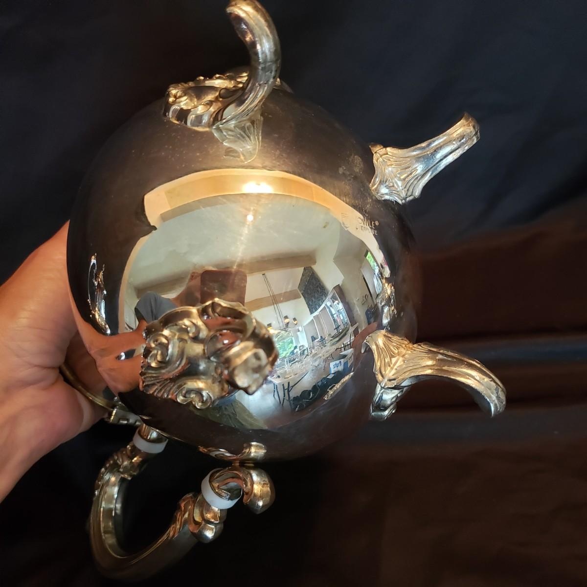 This is a silver plated tea set and tray by Towle. The tray is heavy and measures 25" x 14" x 2"H. It has a swirl paisley engraving style print on the top. The largest tea pot measures 10" x 6" x 11"H. This pot is also on the heavier side. The other tea pot measures 10" x 6" x 10"H. The sugar bowl and creamer measure approximately 7" x 4" x 7"H.