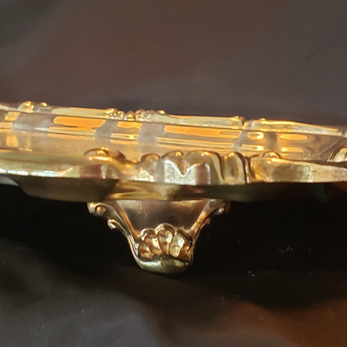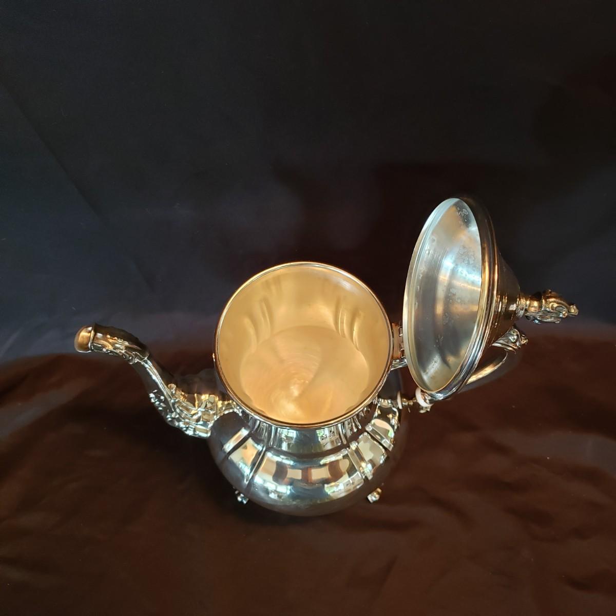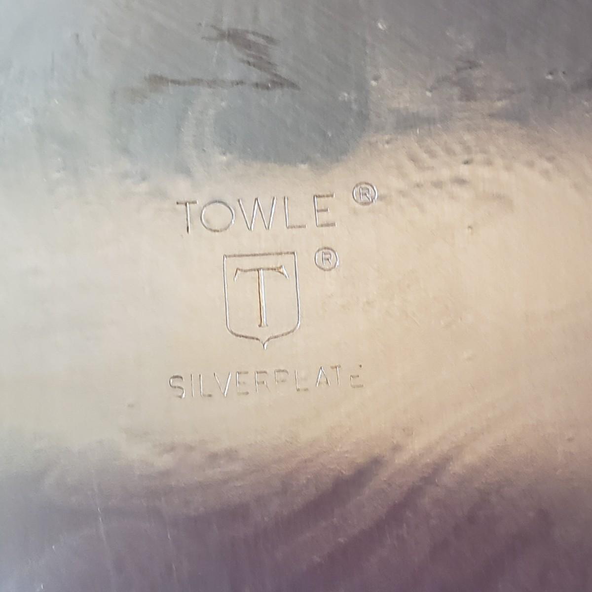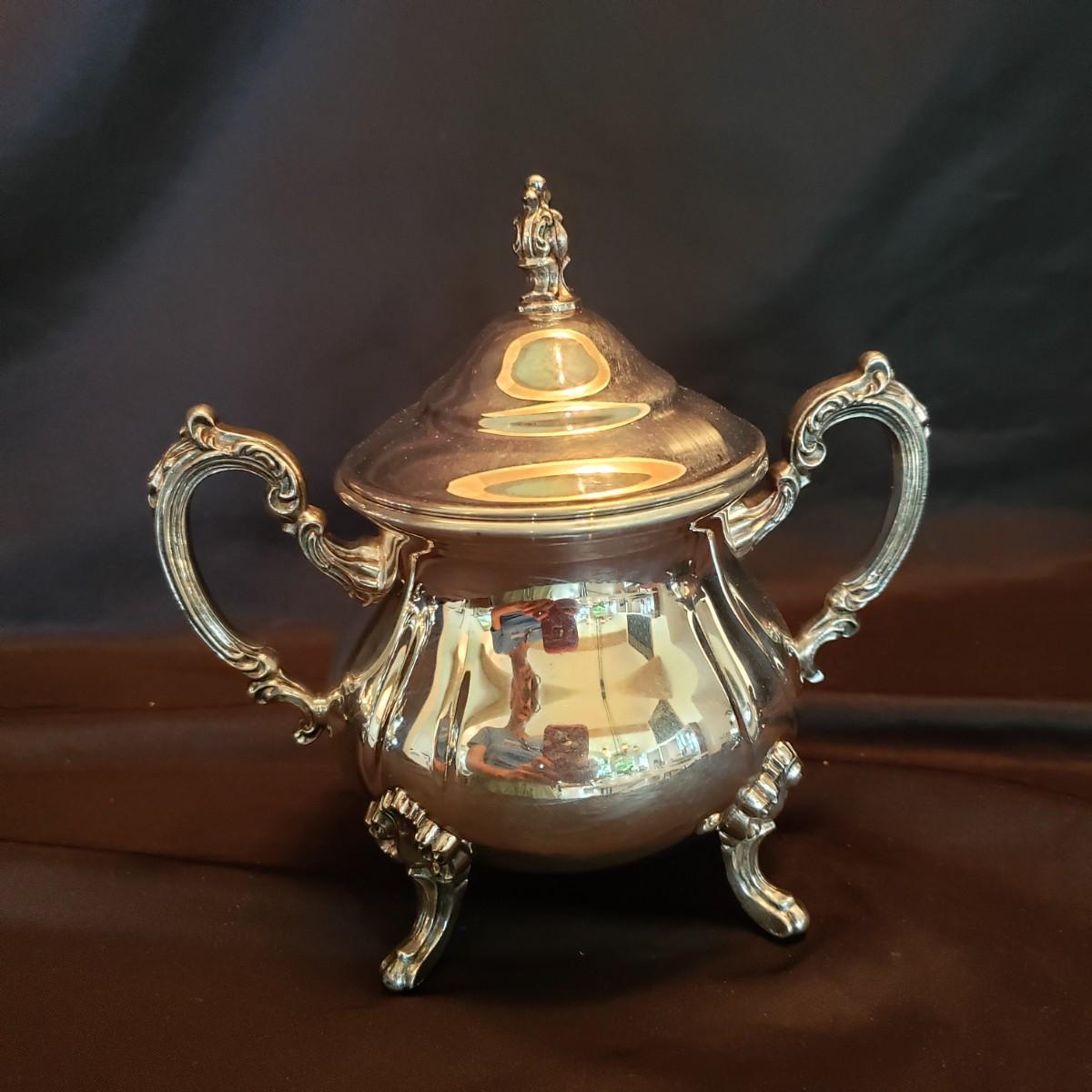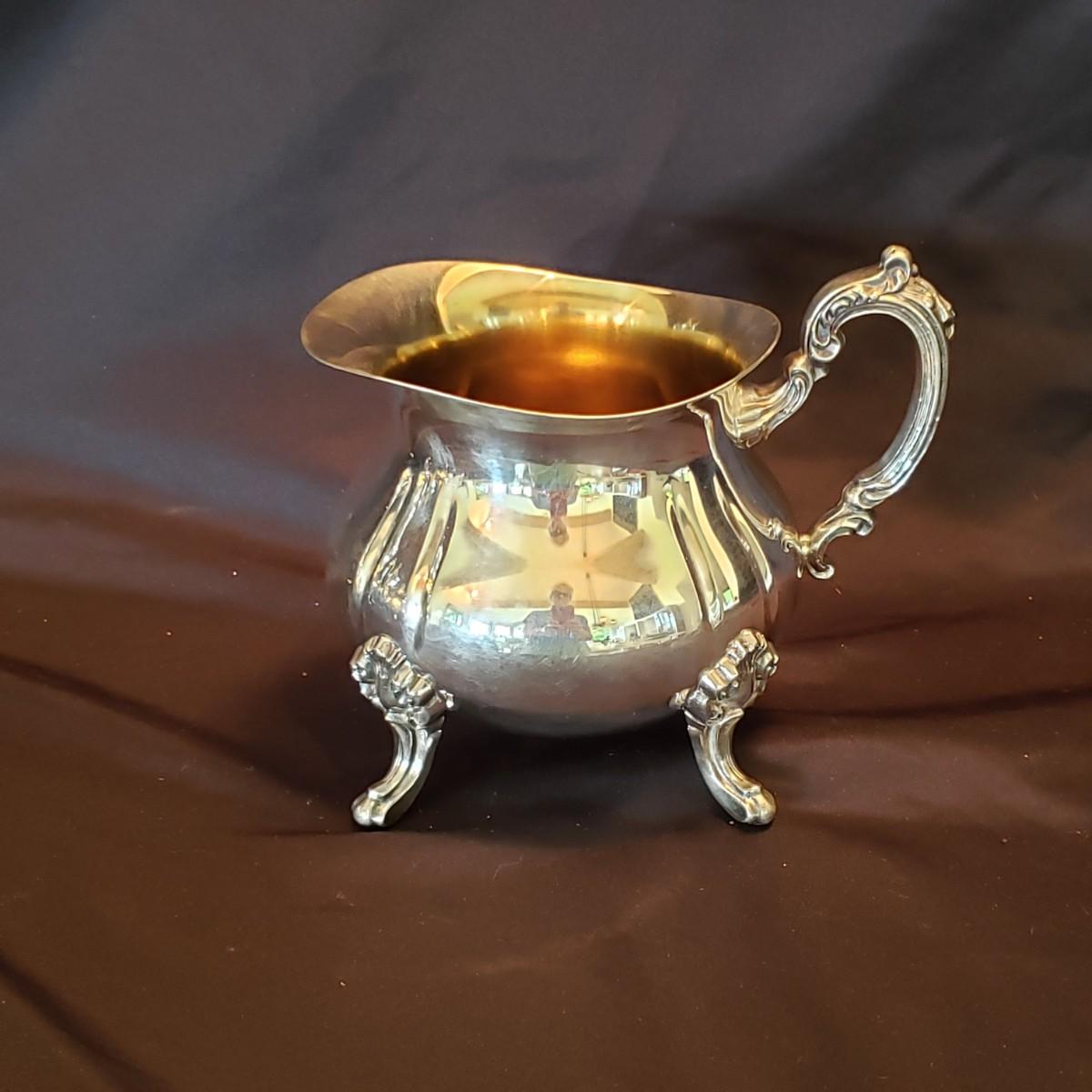 This is a silver plated tea set and tray by Towle. The tray is heavy and measures 25" x 14" x 2"H. It has a swirl paisley engraving style print on the top. The largest tea pot measures 10" x 6" x 11"H. This pot is also on the heavier side. The other tea pot measures 10" x 6" x 10"H. The sugar bowl and creamer measure approximately 7" x 4" x 7"H.